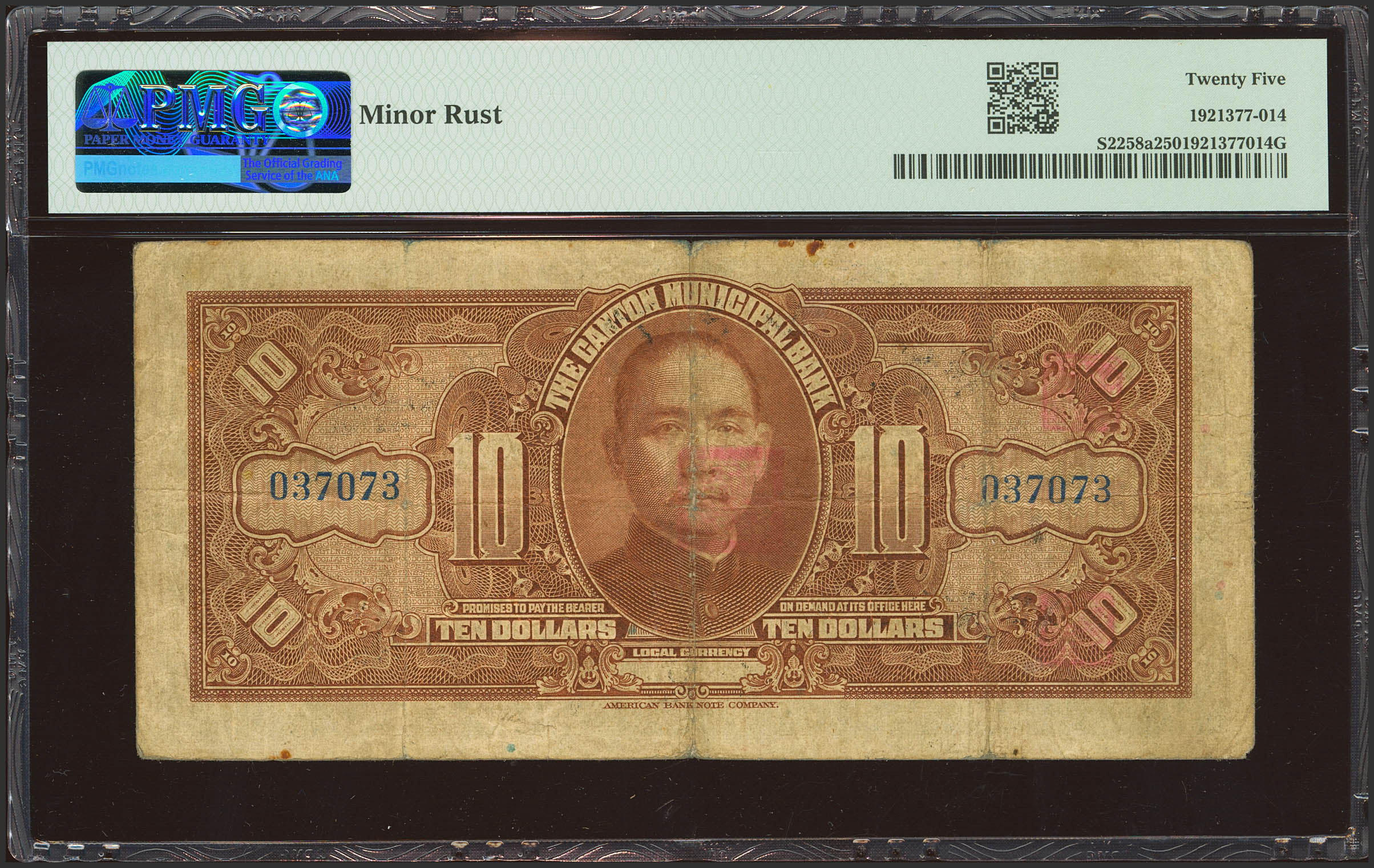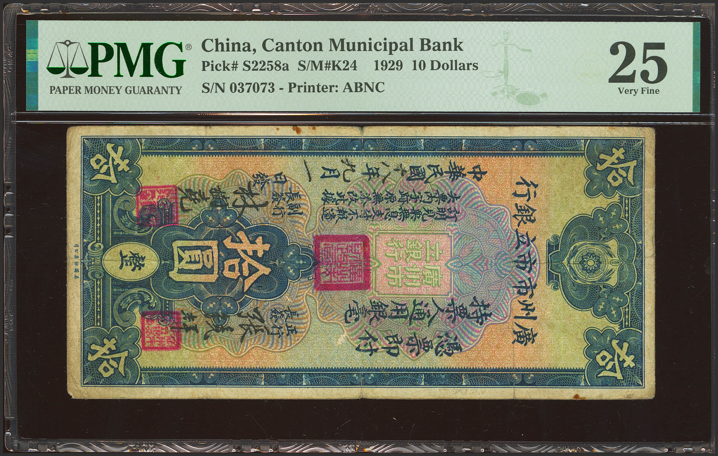 English CHINA. 10 Dollars. 1929. Canton Municipal Bank. (Pick: S2258a, SM: K24). PMG25 (minor rust).