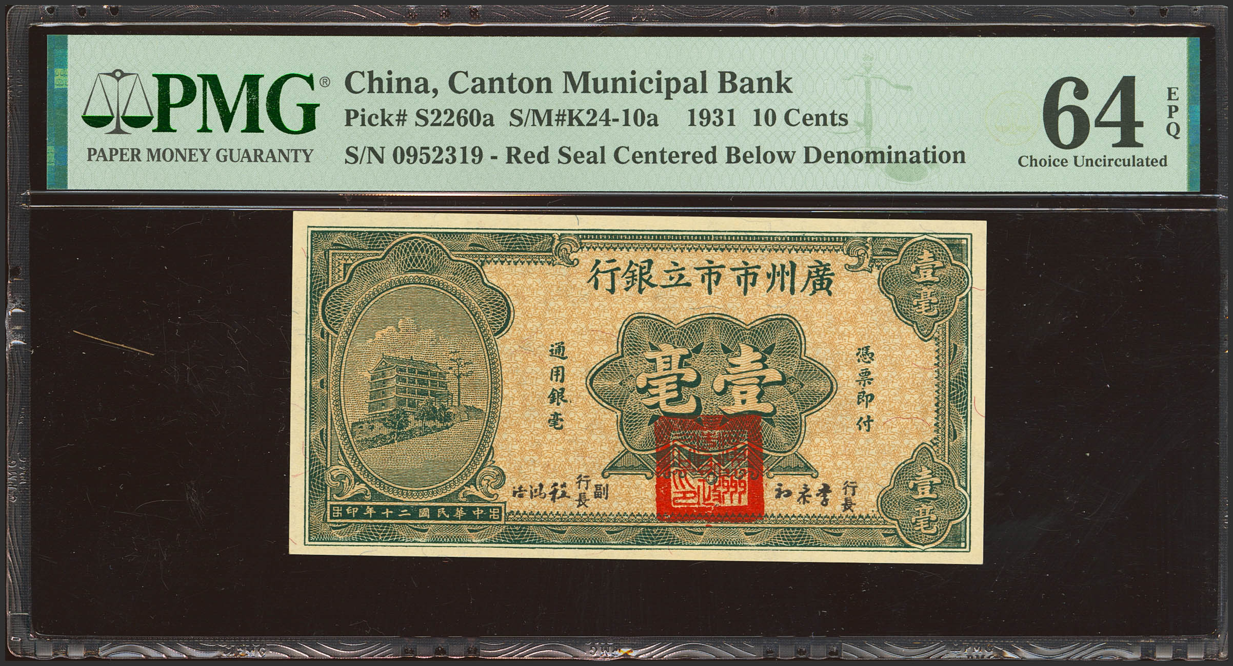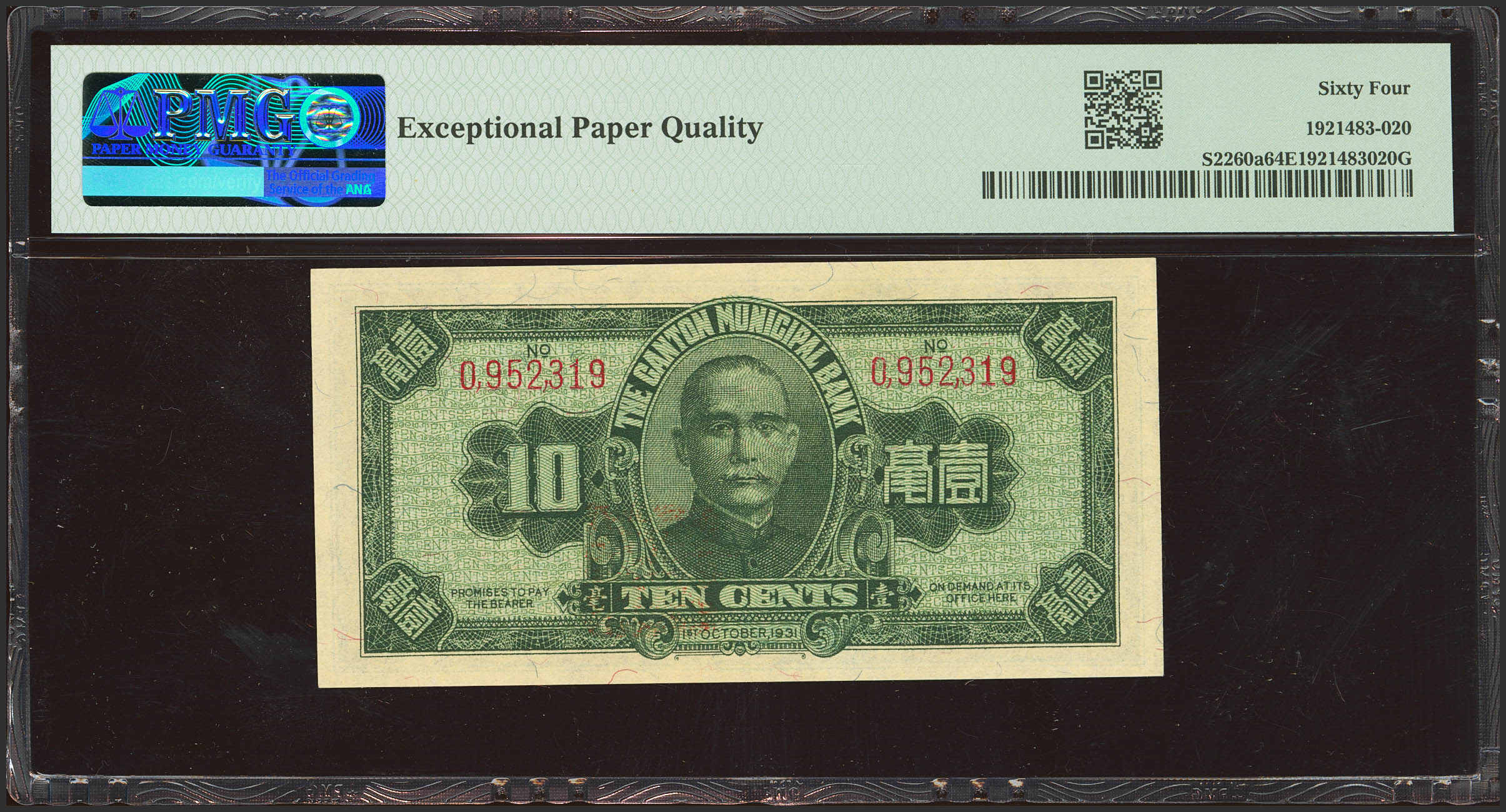 English CHINA. 10 Cents. 1 October 1931. Canton Municipal Bank. (Pick: S2260a, SM: K24-10a). PMG64EPQ.