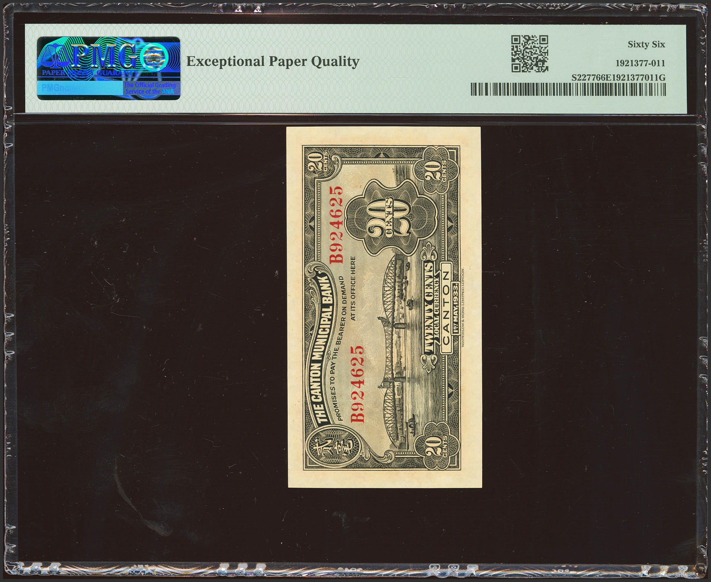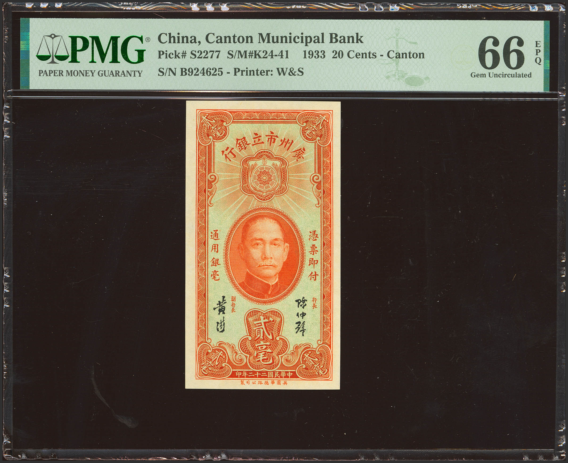 CHINA. 20 Cents. May 1, 1933. Canton Municipal Bank. Signatures of Huang and Ch'en. (Pick: S2277, SM: K24-41). PMG66EPQ.