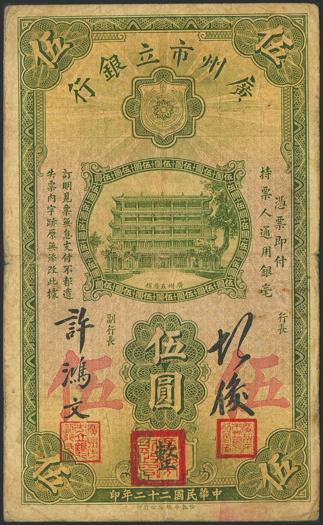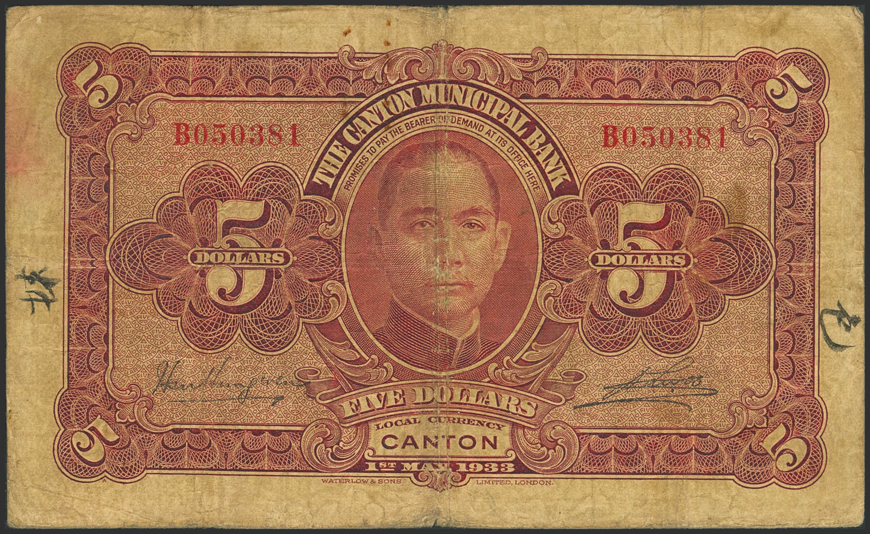 English CHINA. 5 Dollars. May 1, 1933. Canton Municipal Bank. (Pick: S2279a). Very Fine.
