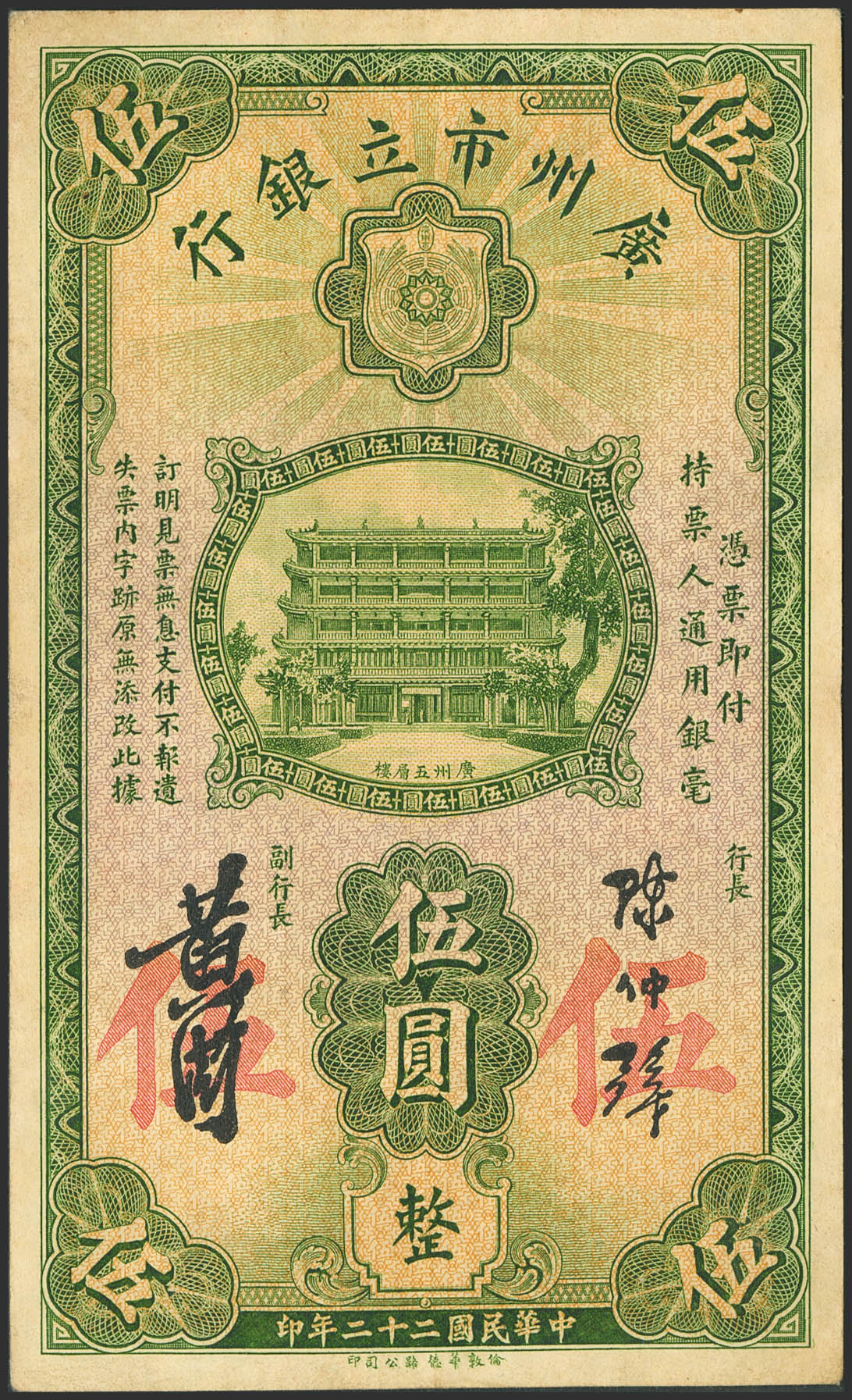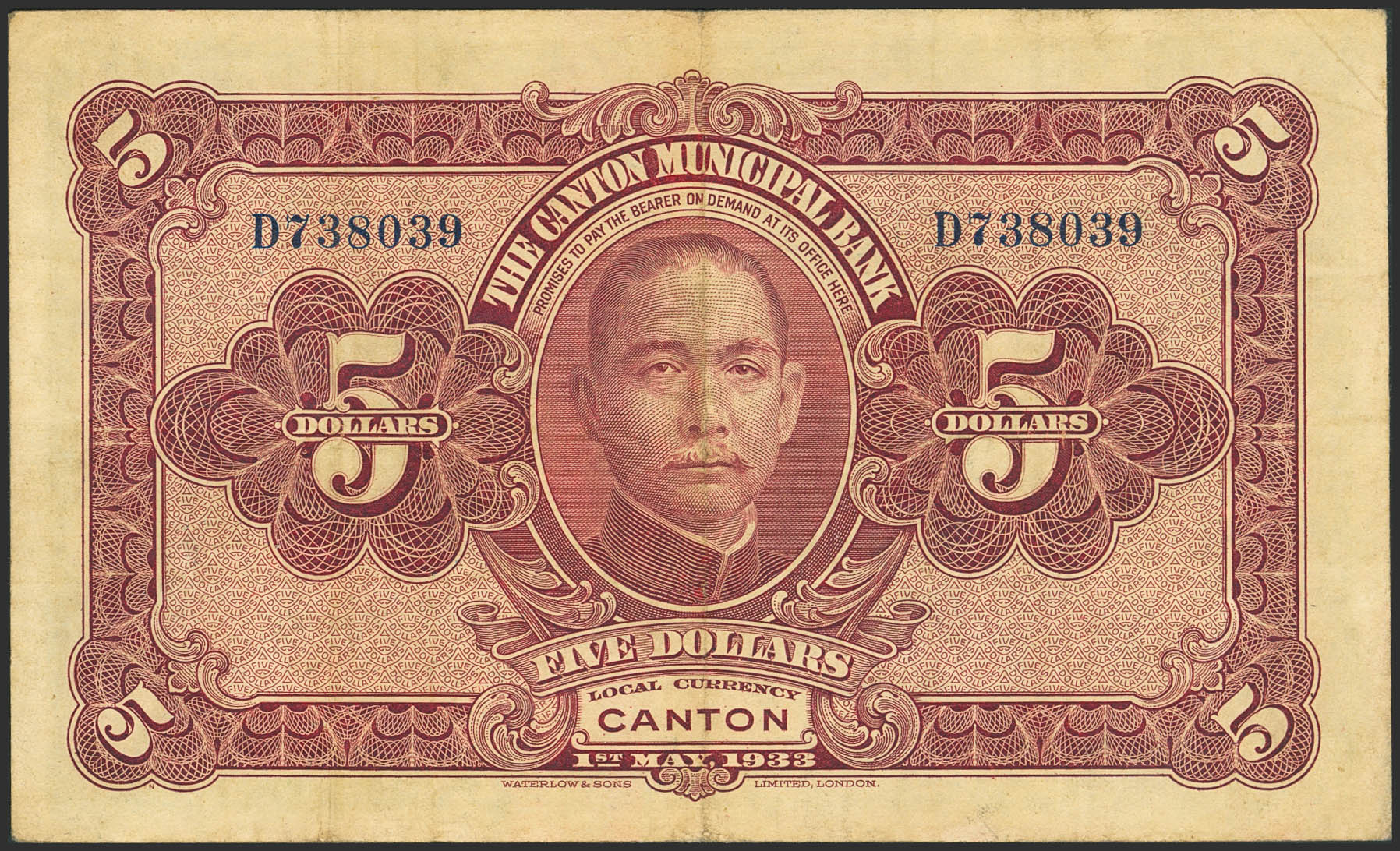 CHINA. 5 Dollars. May 1, 1933. Canton Municipal Bank. (Pick: S2279c). Extremely Fine.