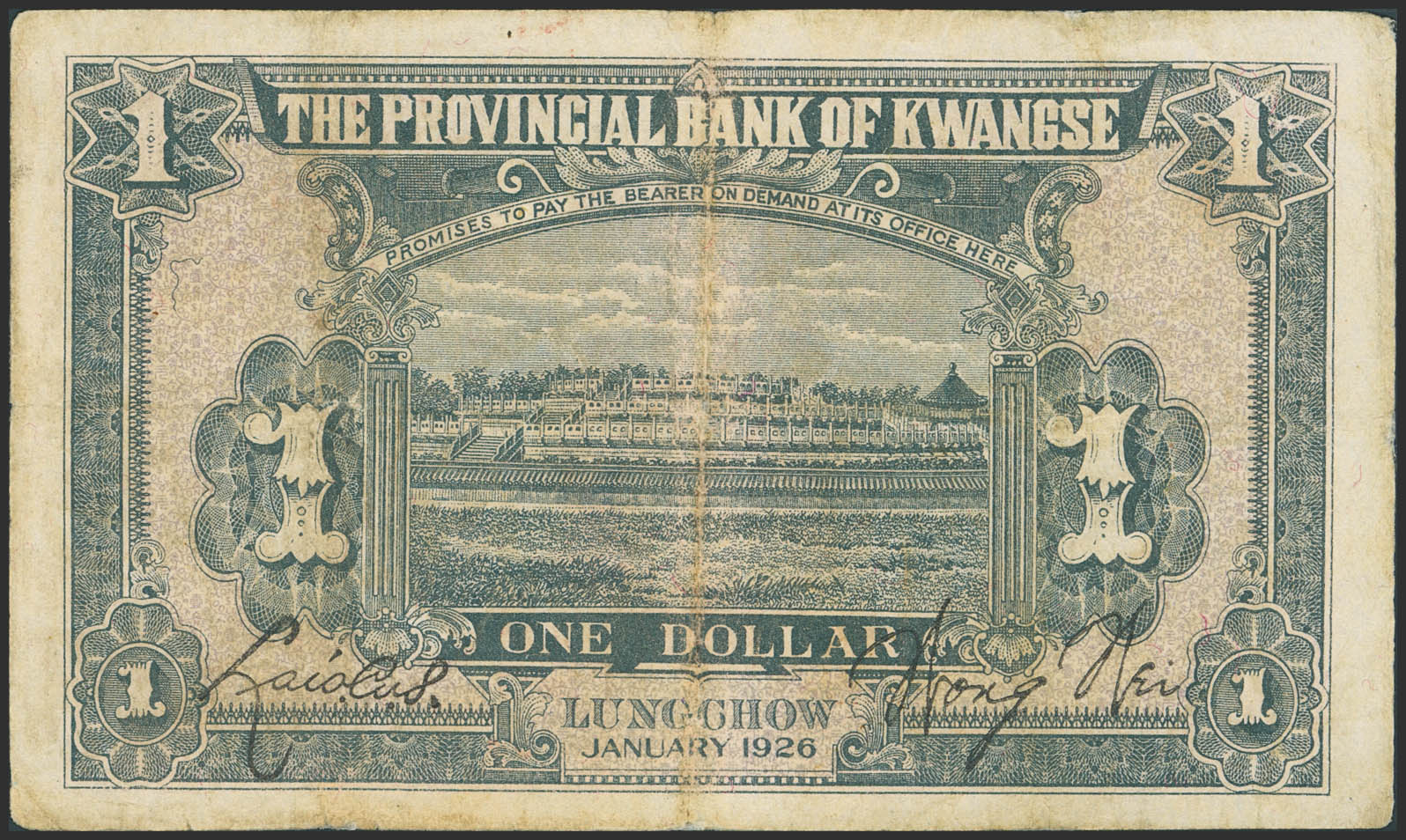 English CHINA. 1 Dollar. January 1926. Provincial Bank of Kwangsi. Lungchow. (Pick: S2325d). More than Very Fine.