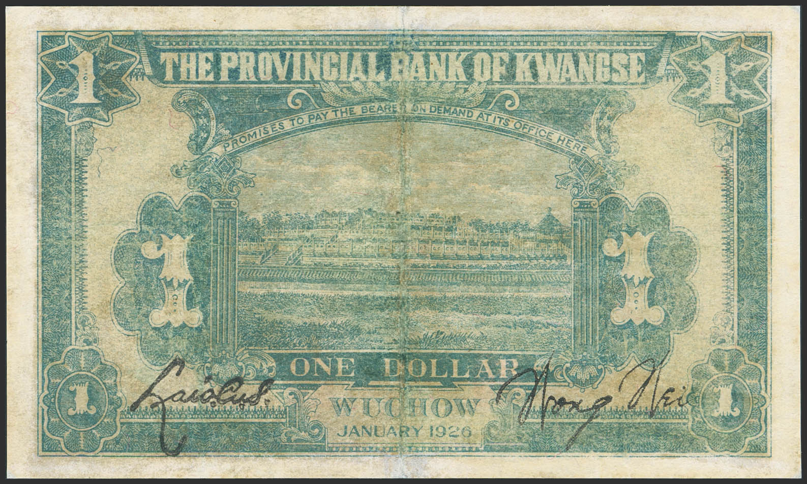 CHINA. 1 Dollar. January 1926. Provincial Bank of Kwangsi. Wuchow. (Pick: S2325g). Restored. Very Fine.