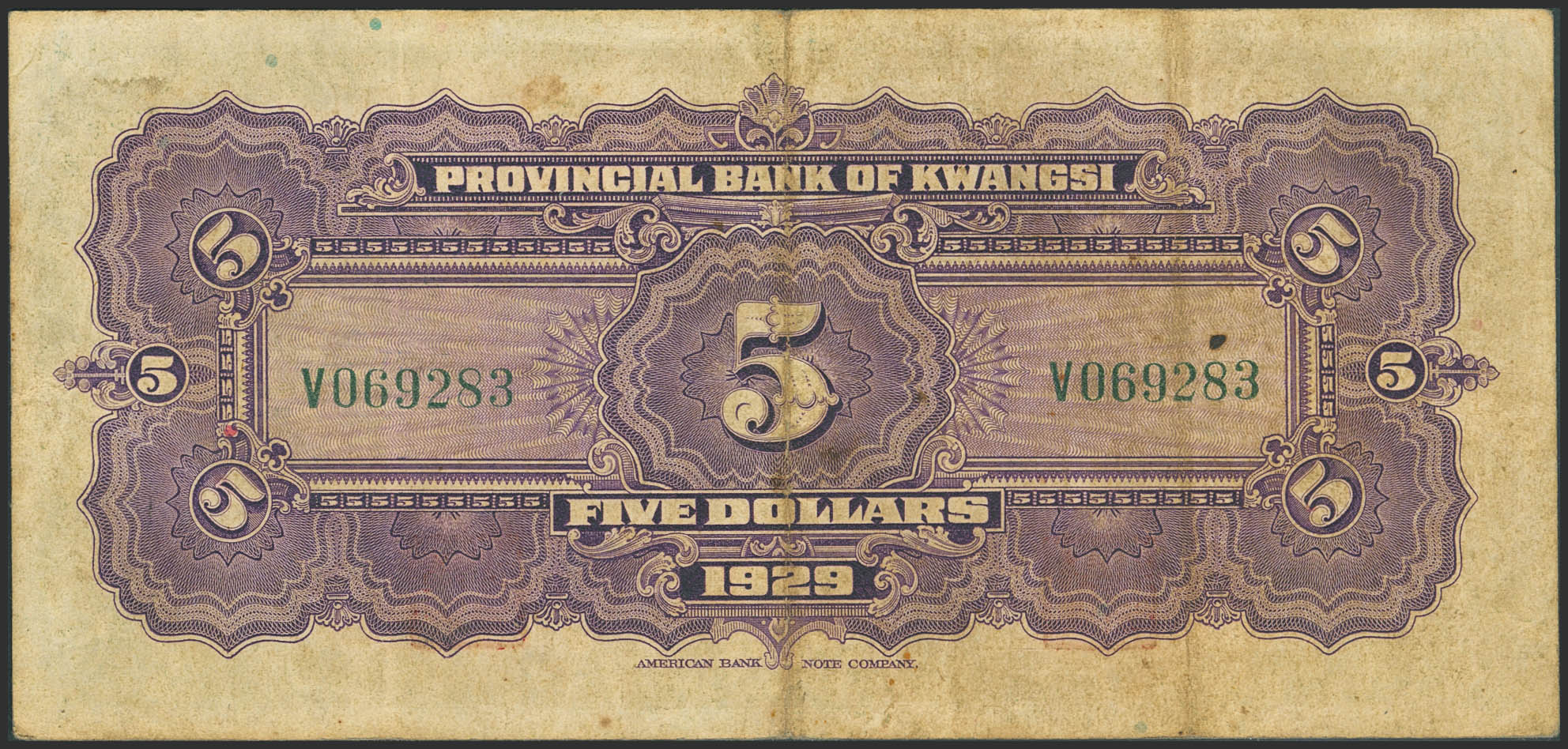CHINA. 5 Dollars. 1929. Provincial Bank of Kwangsi. Kweilin. (Pick: S2340b). More than Very Fine.