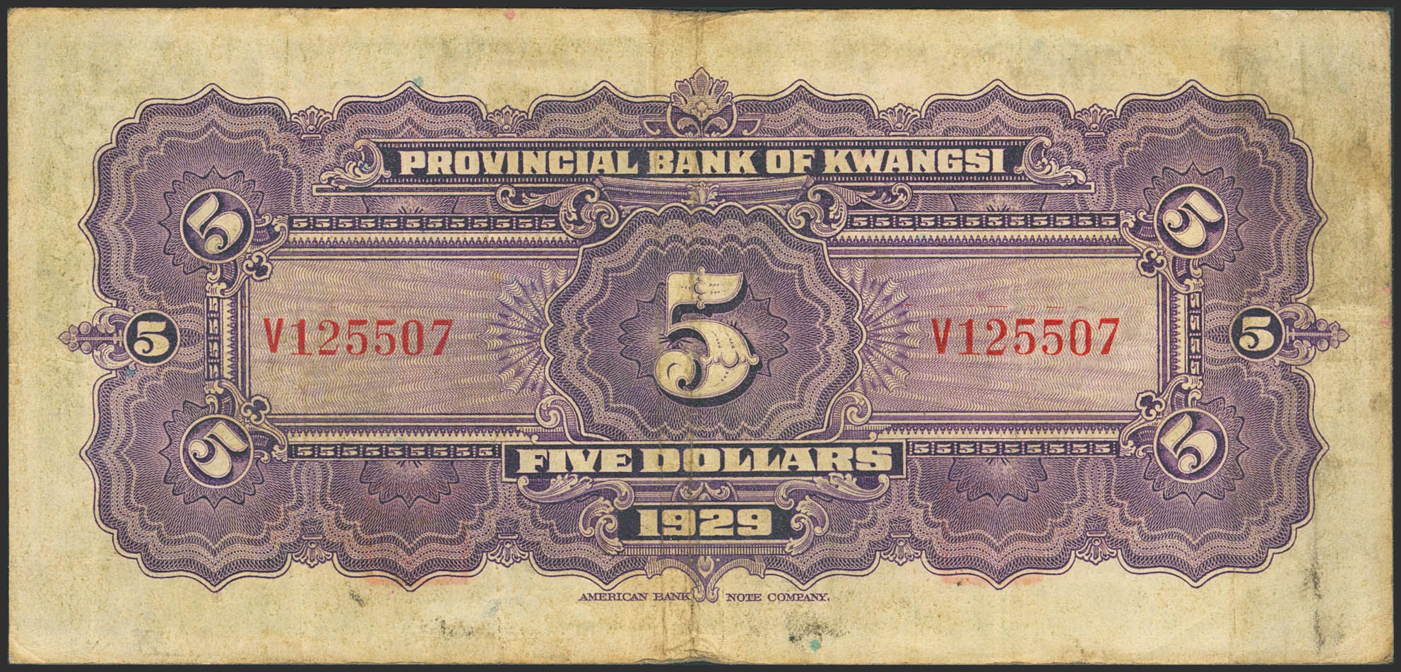 CHINA. 5 Dollars. 1929. Provincial Bank of Kwangsi. Nanning. (Pick: S2340e). Very Fine.