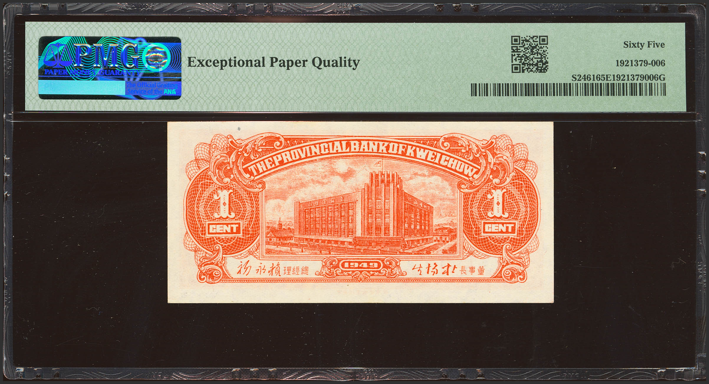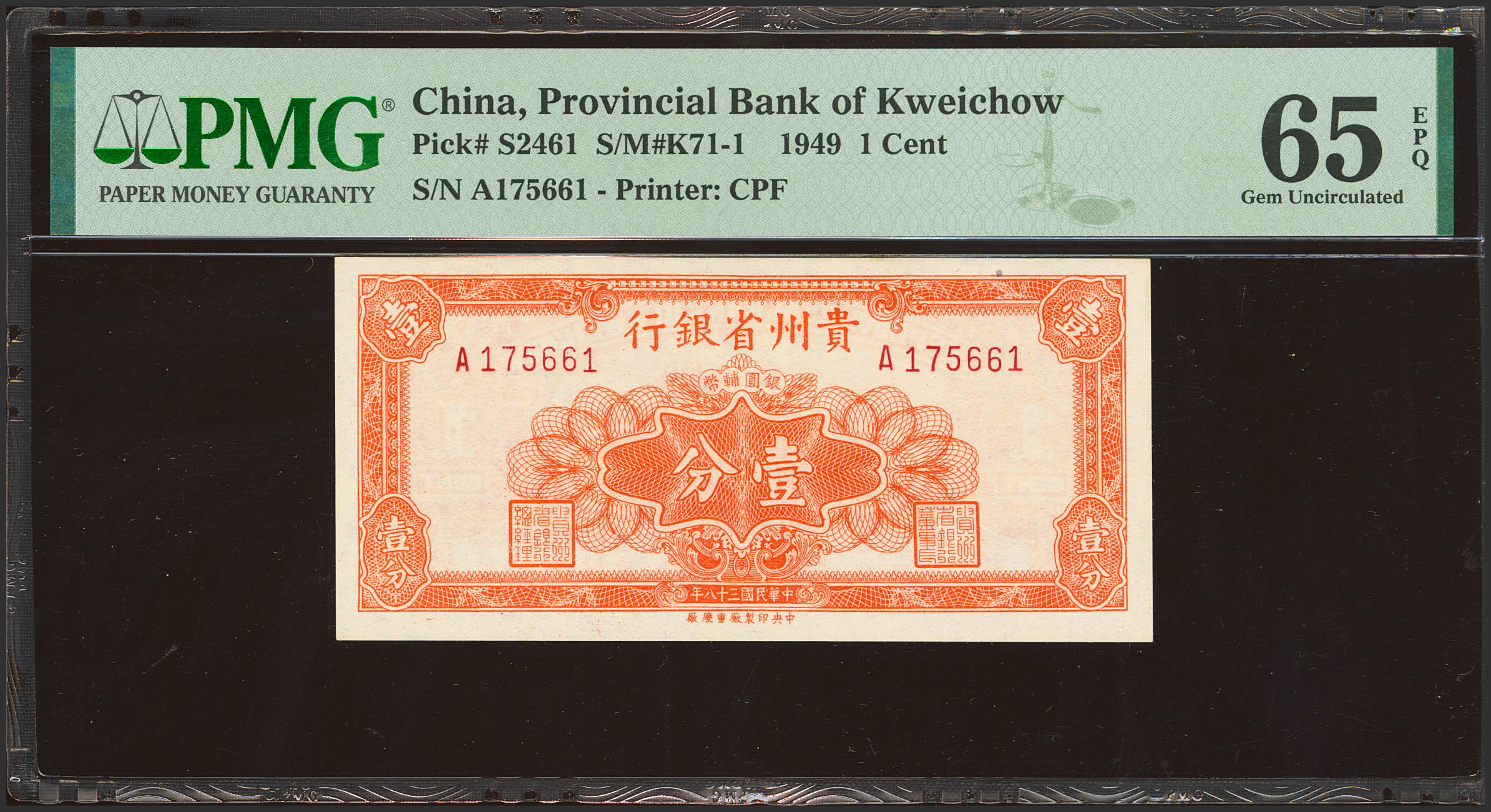 CHINA. 1 Cent. 1949. Provincial Bank of Kweichow. (Pick: S2461, SM: K71-1). PMG65EPQ.