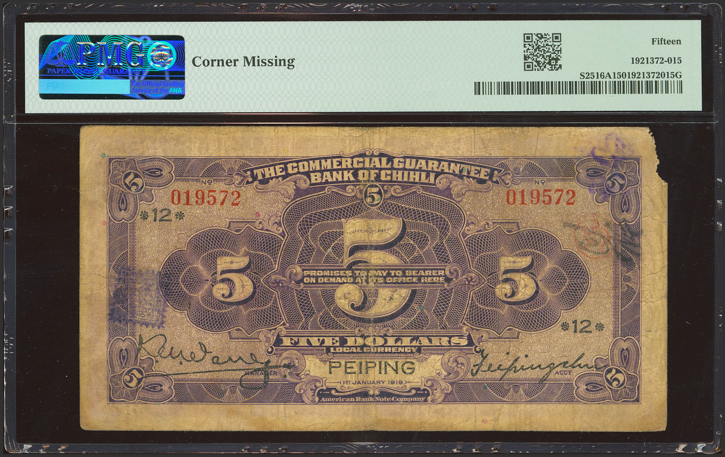 CHINA. 5 Dollars. 1 January 1919. Commercial Guarantee Bank of Chihli. Peiping. (Pick: S2516A, SM: P33). PMG15 (corner missing).