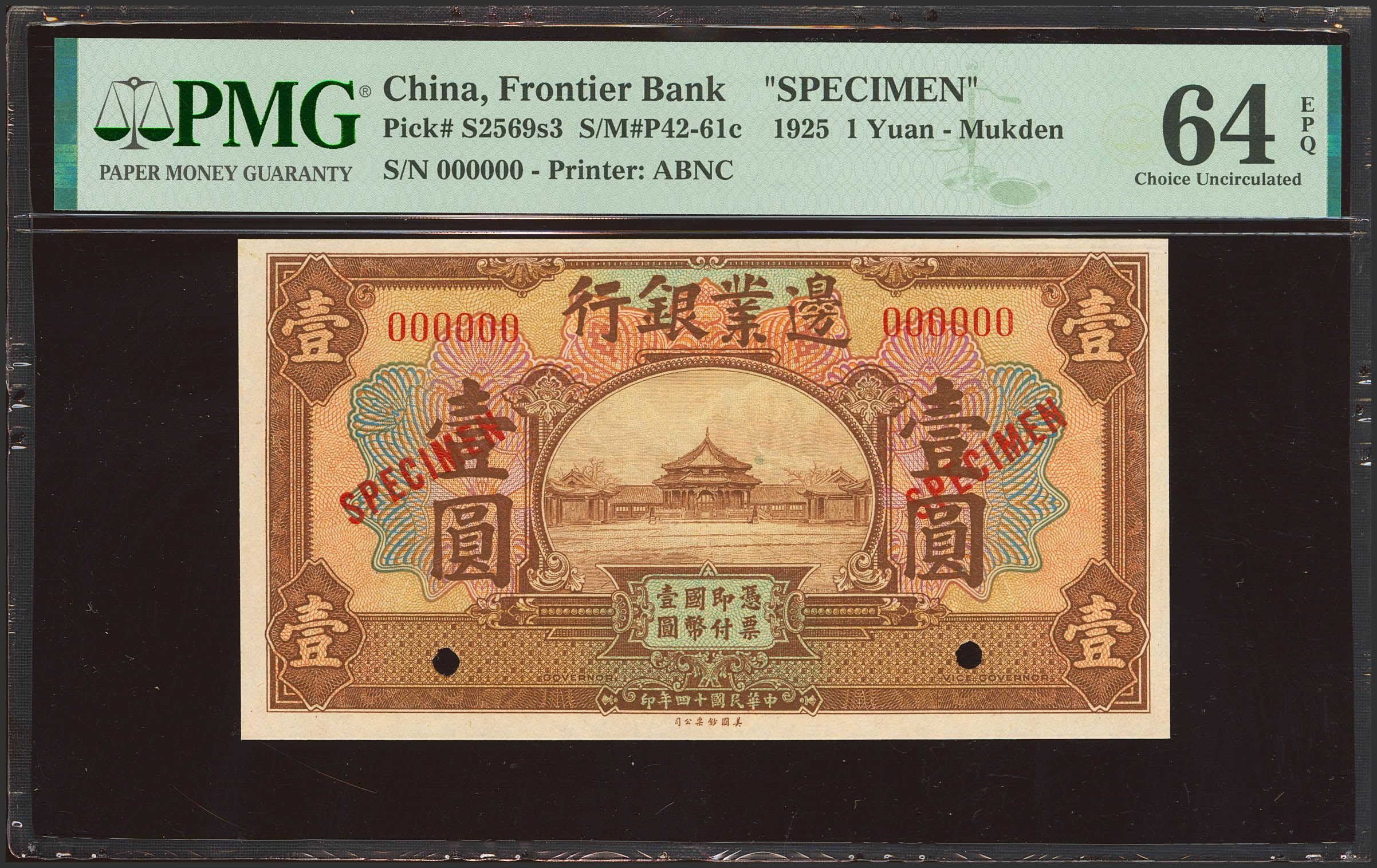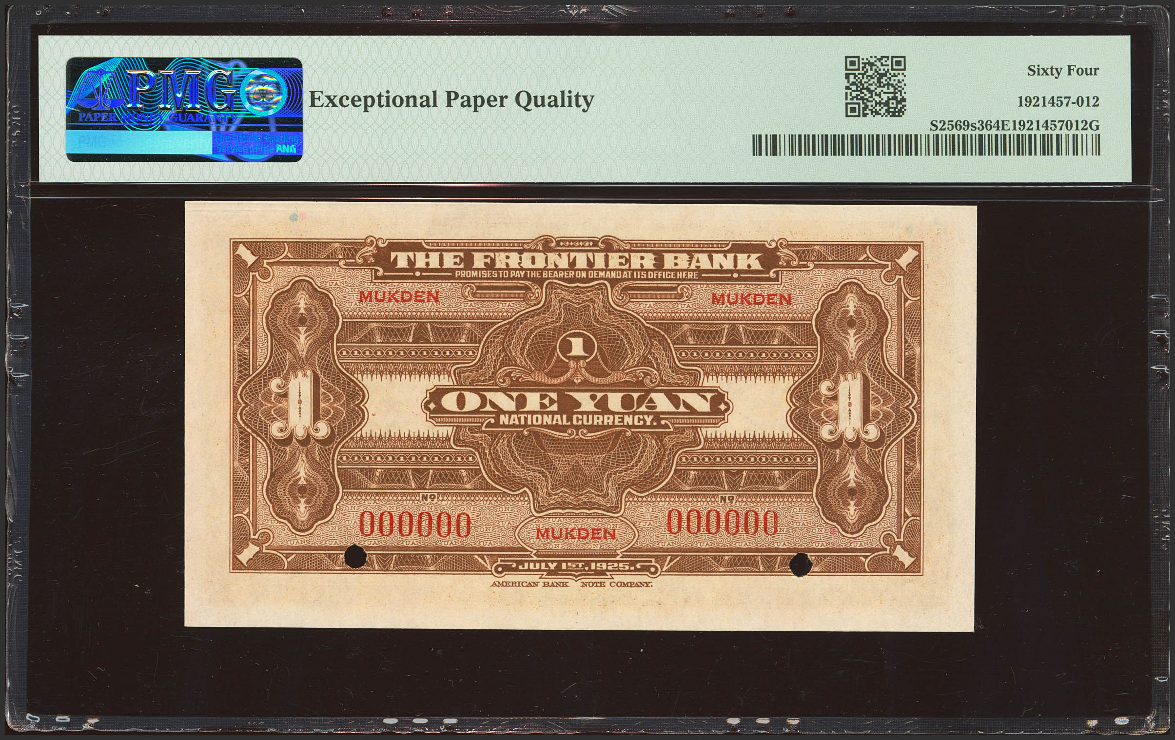 CHINA. 1 Yuan. 1 July 1925. Frontier Bank. Mukden. Specimen. (Pick: S2569s3 SM: P42-61c). PMG64EPQ.
