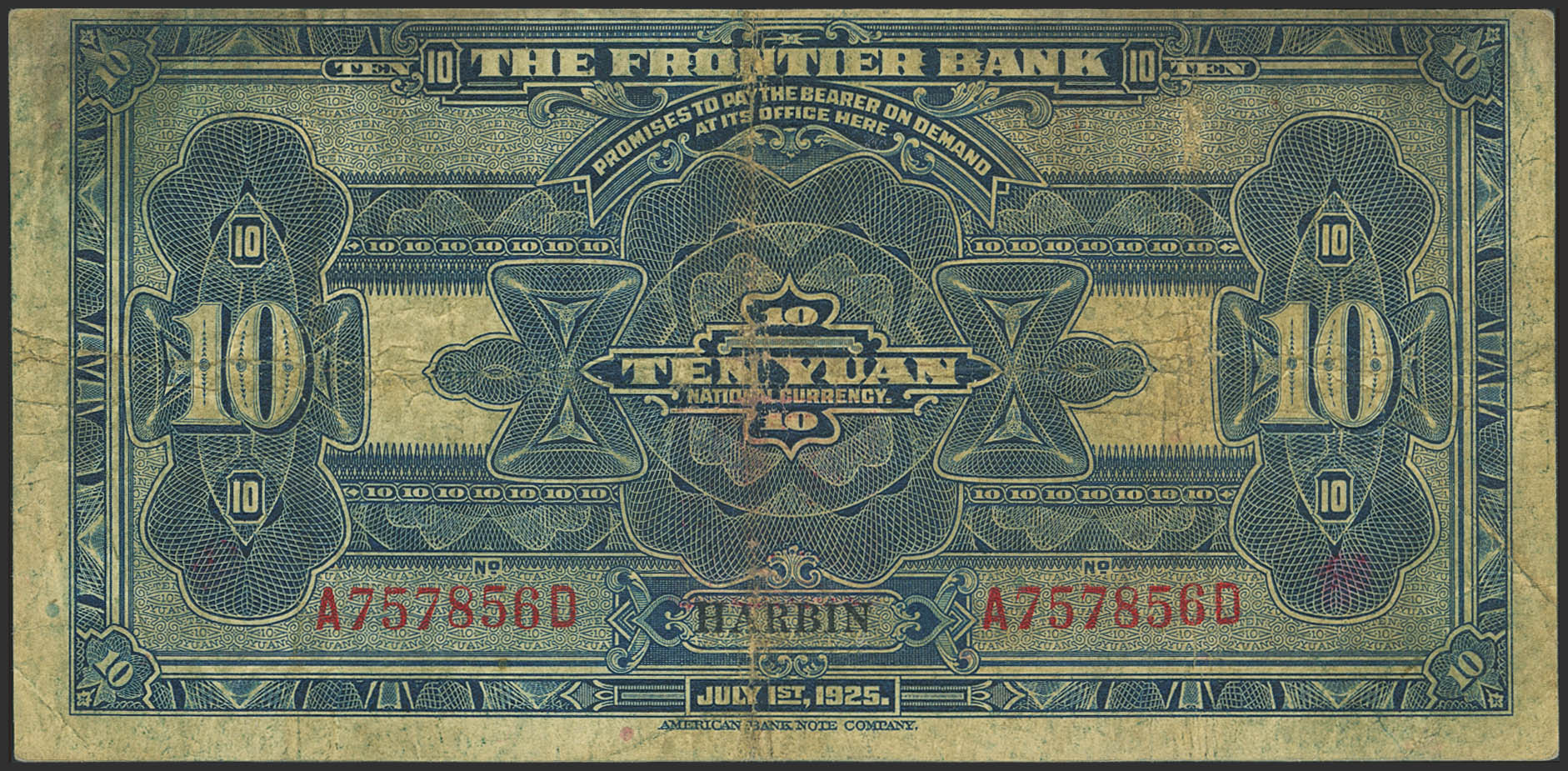 English CHINA. 10 Yuan. 1 July 1925. Frontier Bank. Harbin. (Pick: S2572b). Margins trimmed on the obverse. More than Fine.