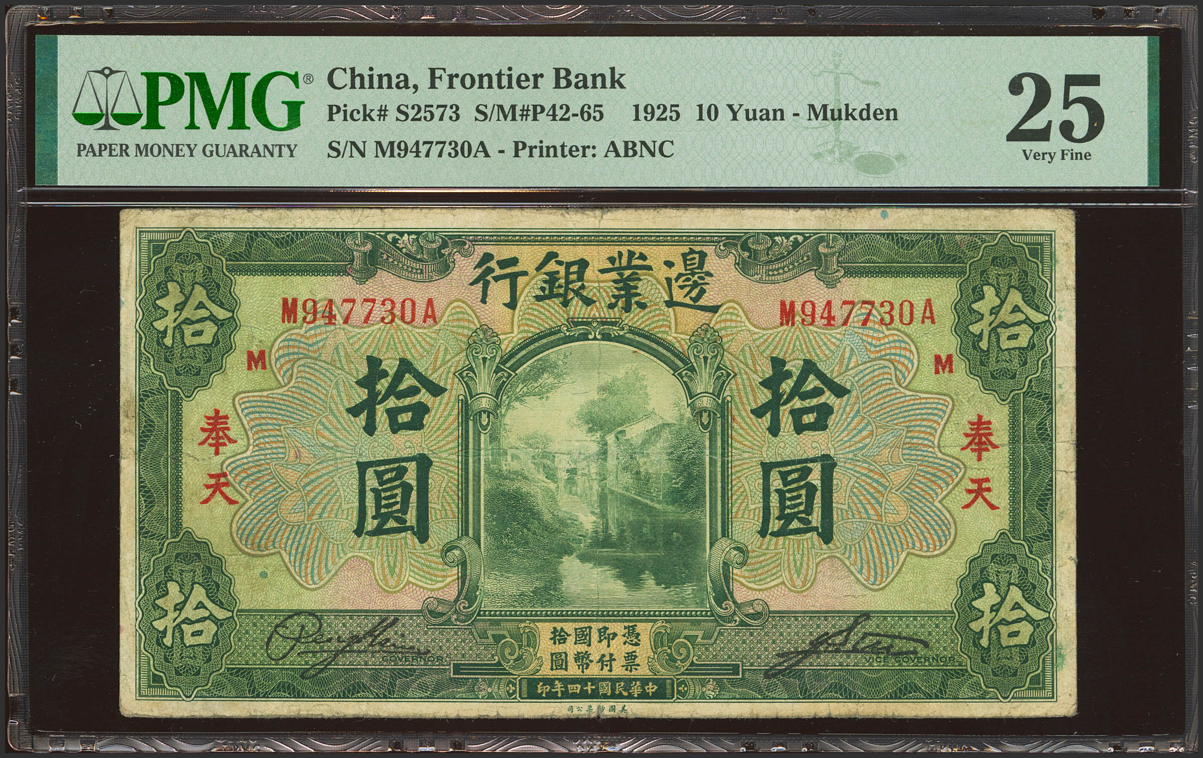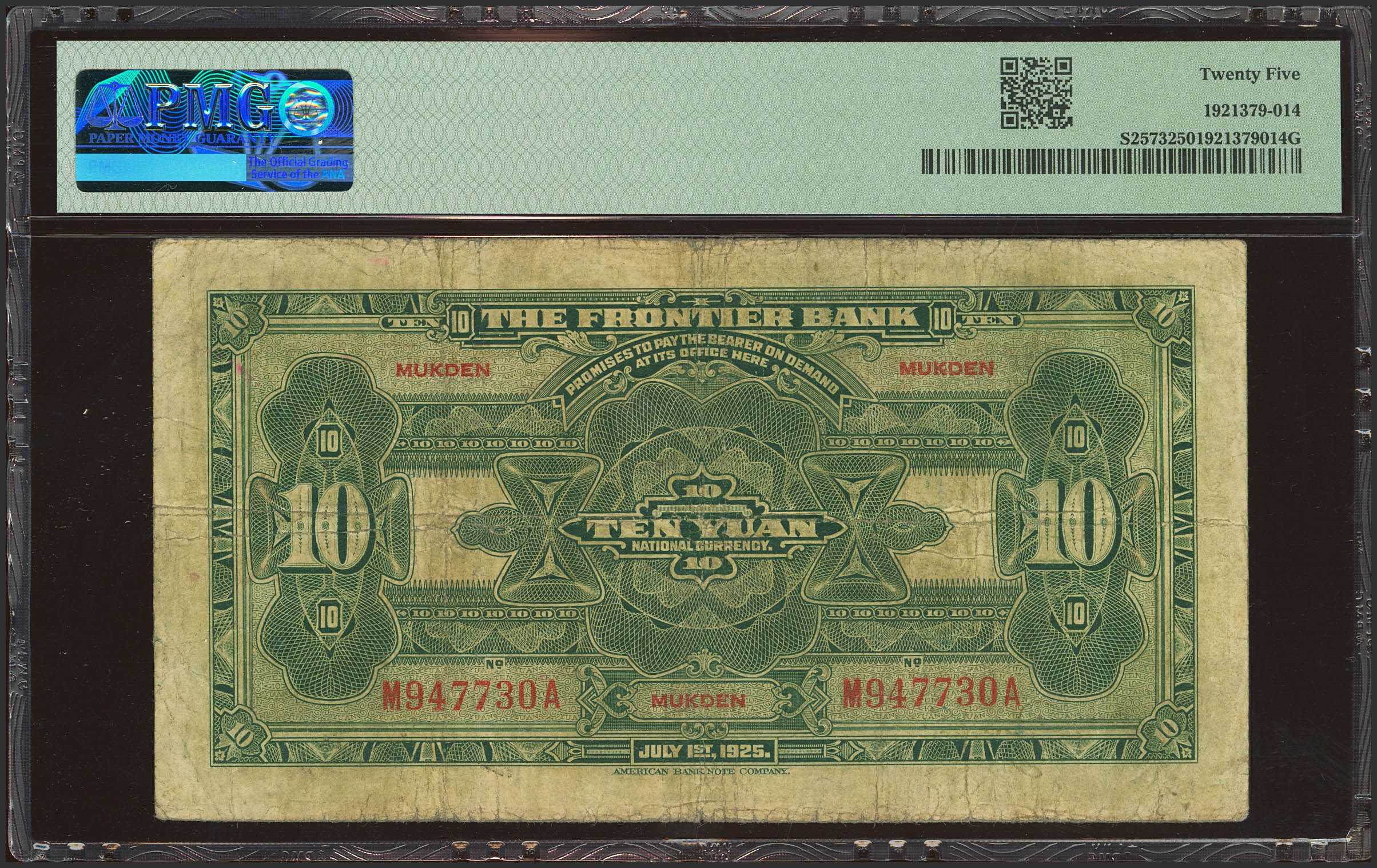 English CHINA. 10 Yuan. 1 July 1925. Frontier Bank. Mukden. (Pick: S2573, SM: P42-65). PMG25.
