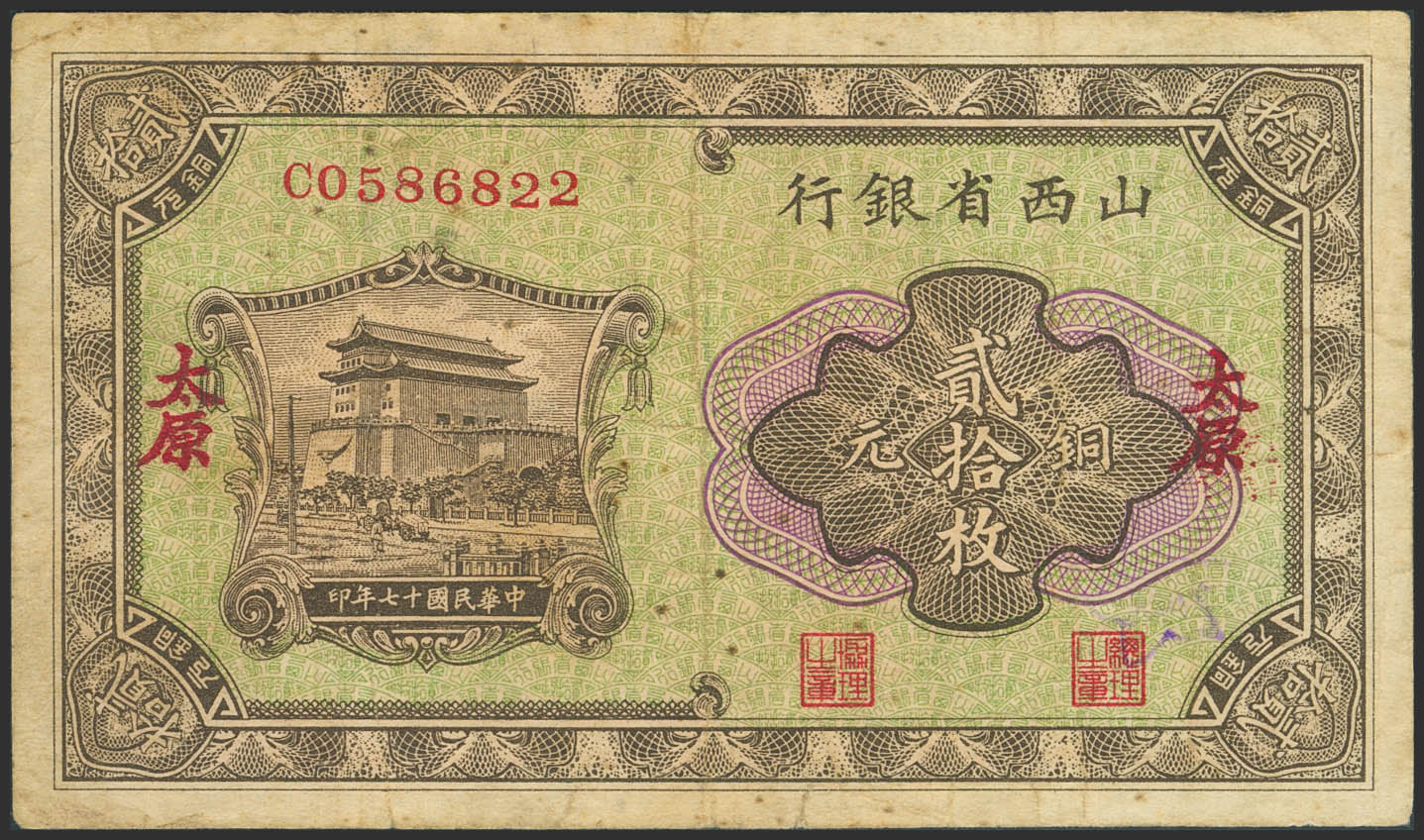 CHINA. 10 Coppers. 1928. Shanse Provincial Bank. Taiyuan. (Pick: S2645b). Very Fine.