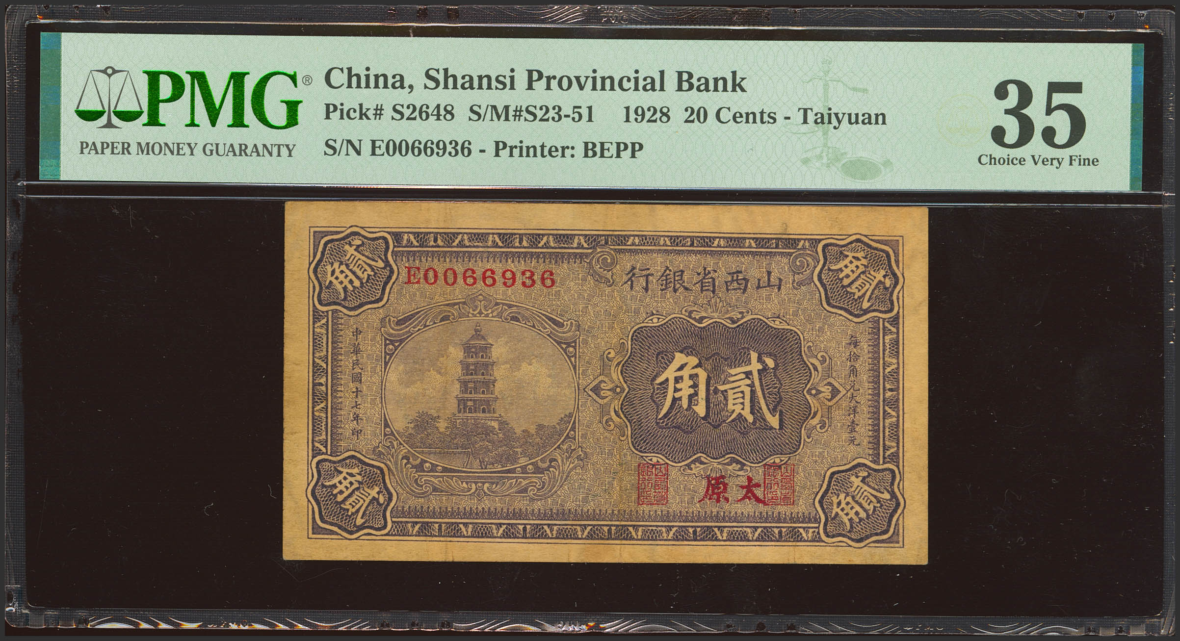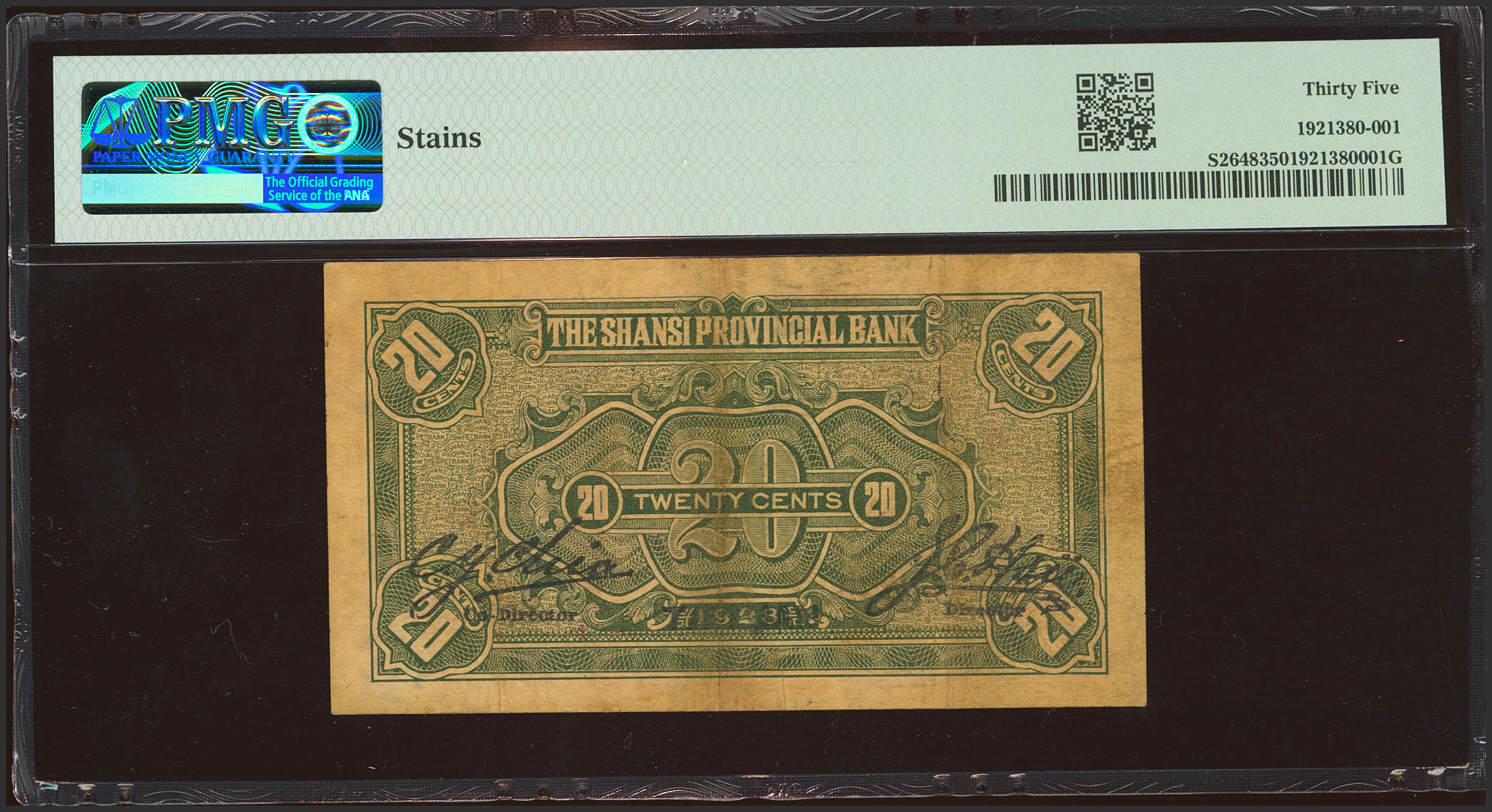 English CHINA. 20 Cents. 1928. Shanse Provincial Bank. Taiyuan. (Pick: S2648, SM: S23-51). PMG35 (stains).