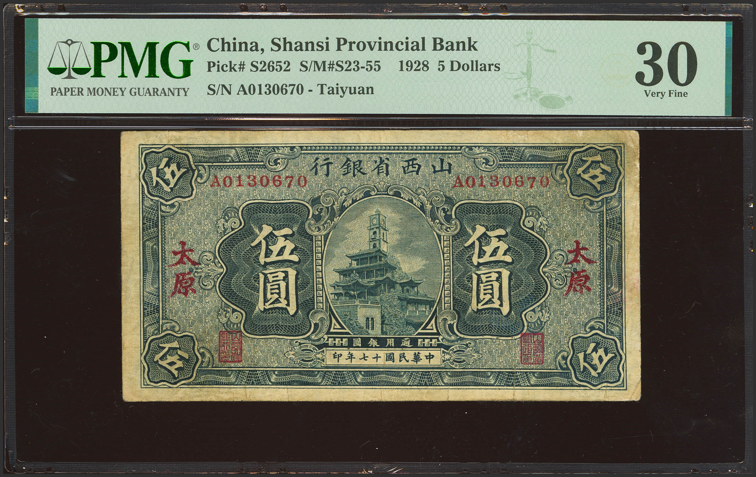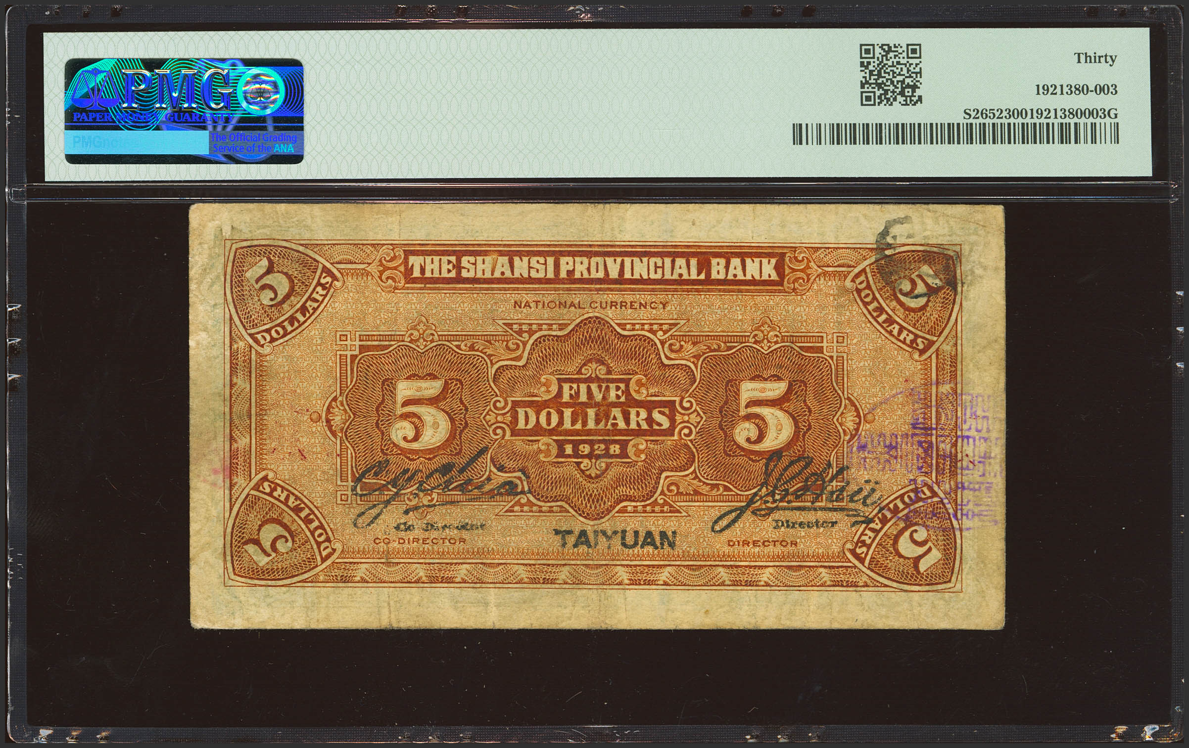 English CHINA. 5 Dollars. 1928. Shanse Provincial Bank. Taiyuan. (Pick: S2652, SM: S23-55). PMG30.