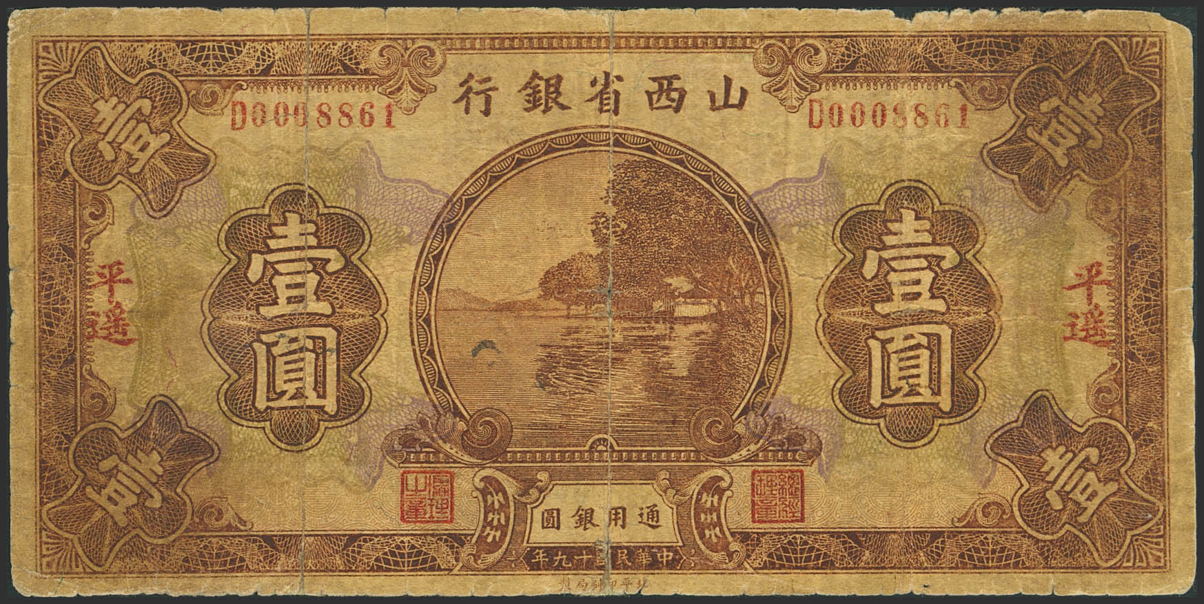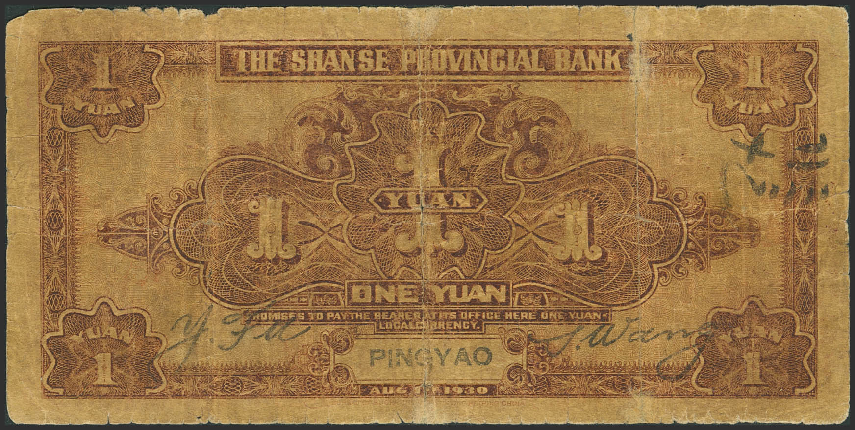 English CHINA. 1 Yuan. 1 August 1930. Shanse Provincial Bank. Pingyao. (Pick: S2657h). Very Good.
