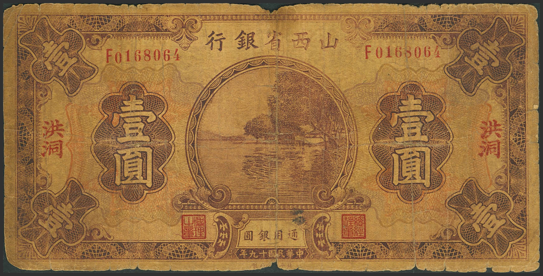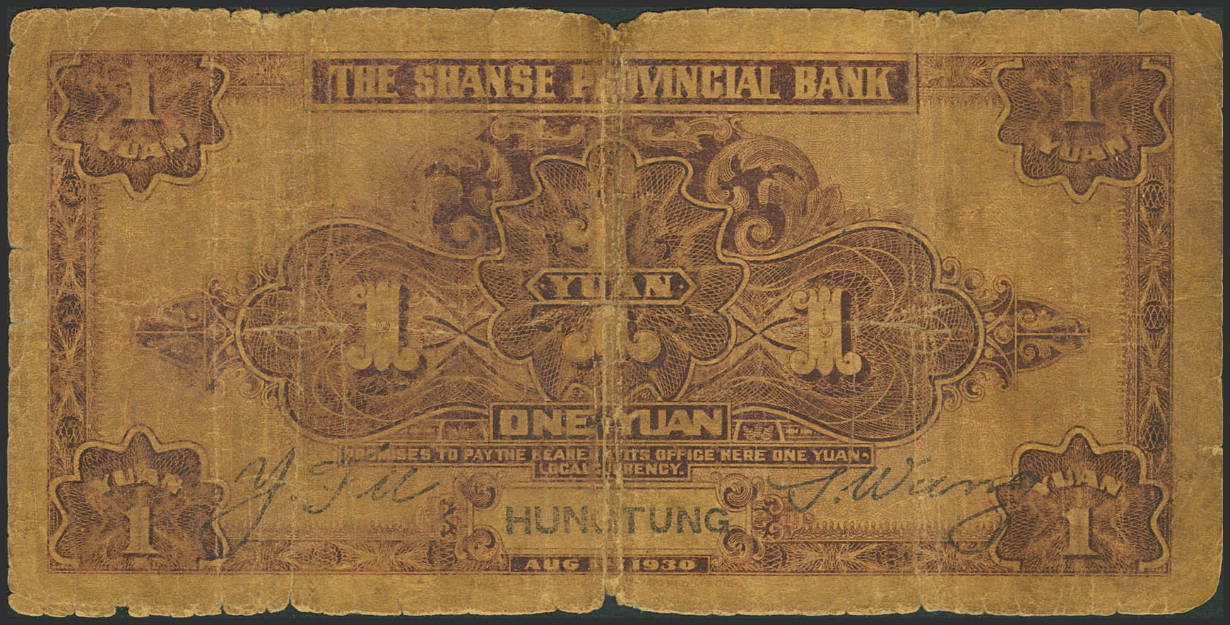 CHINA. 1 Yuan. 1 August 1930. Shanse Provincial Bank. Hungtung. (Pick: S2657t). Very Good.