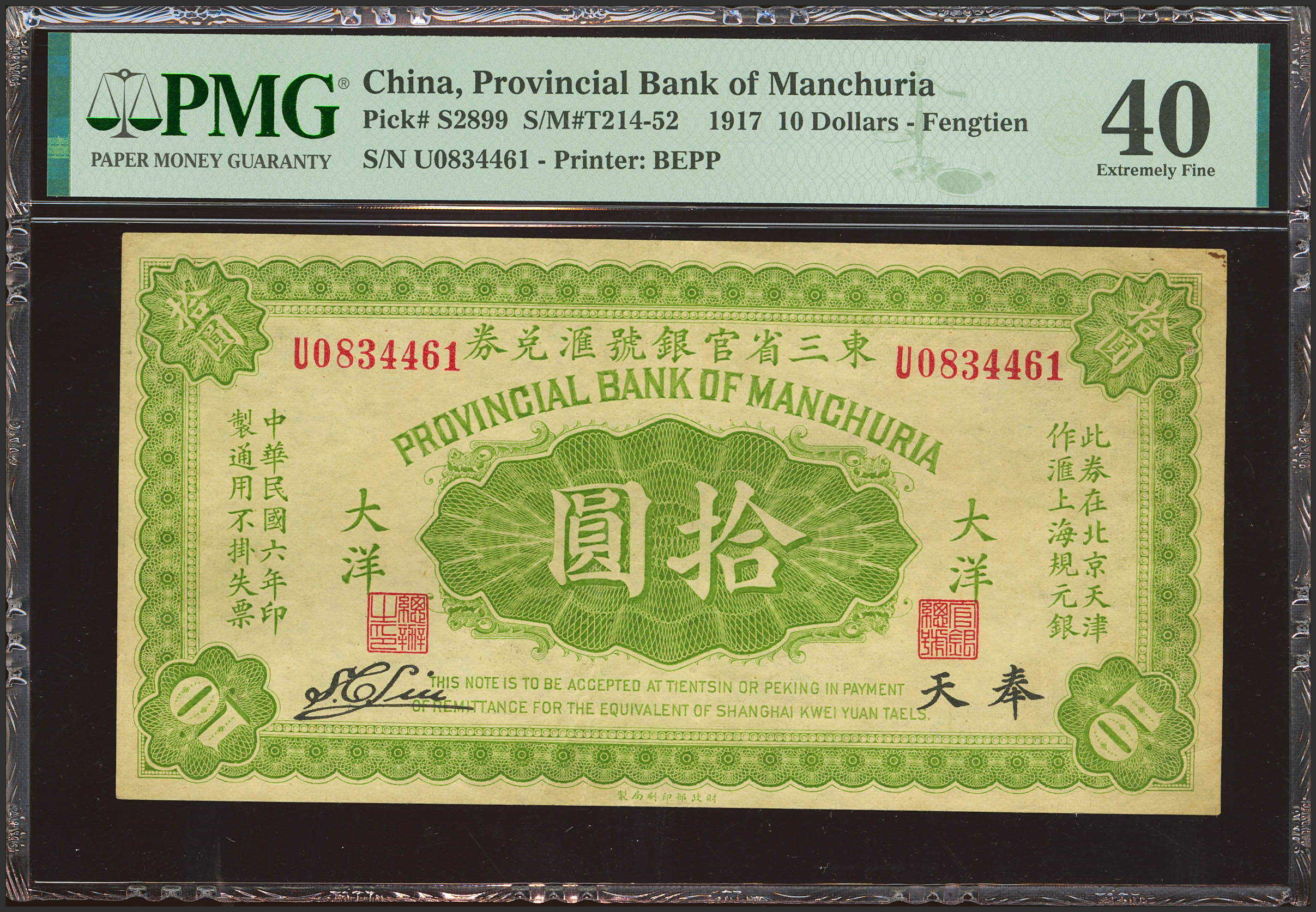 CHINA. 10 Yuan. 1917. Provincial Bank of Manchuria. (Pick: S2899, SM: T214-52). PMG40 (minor rust).