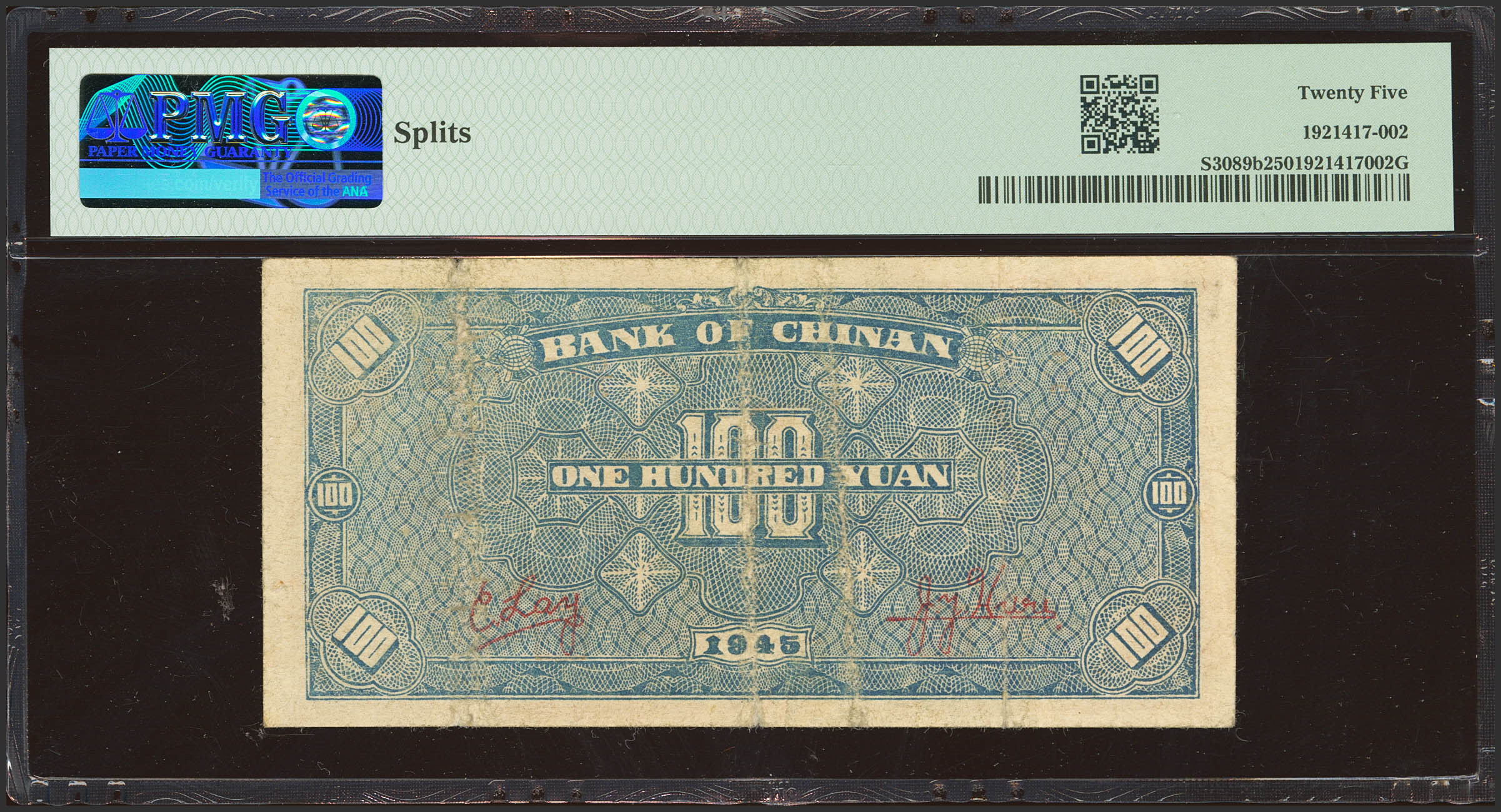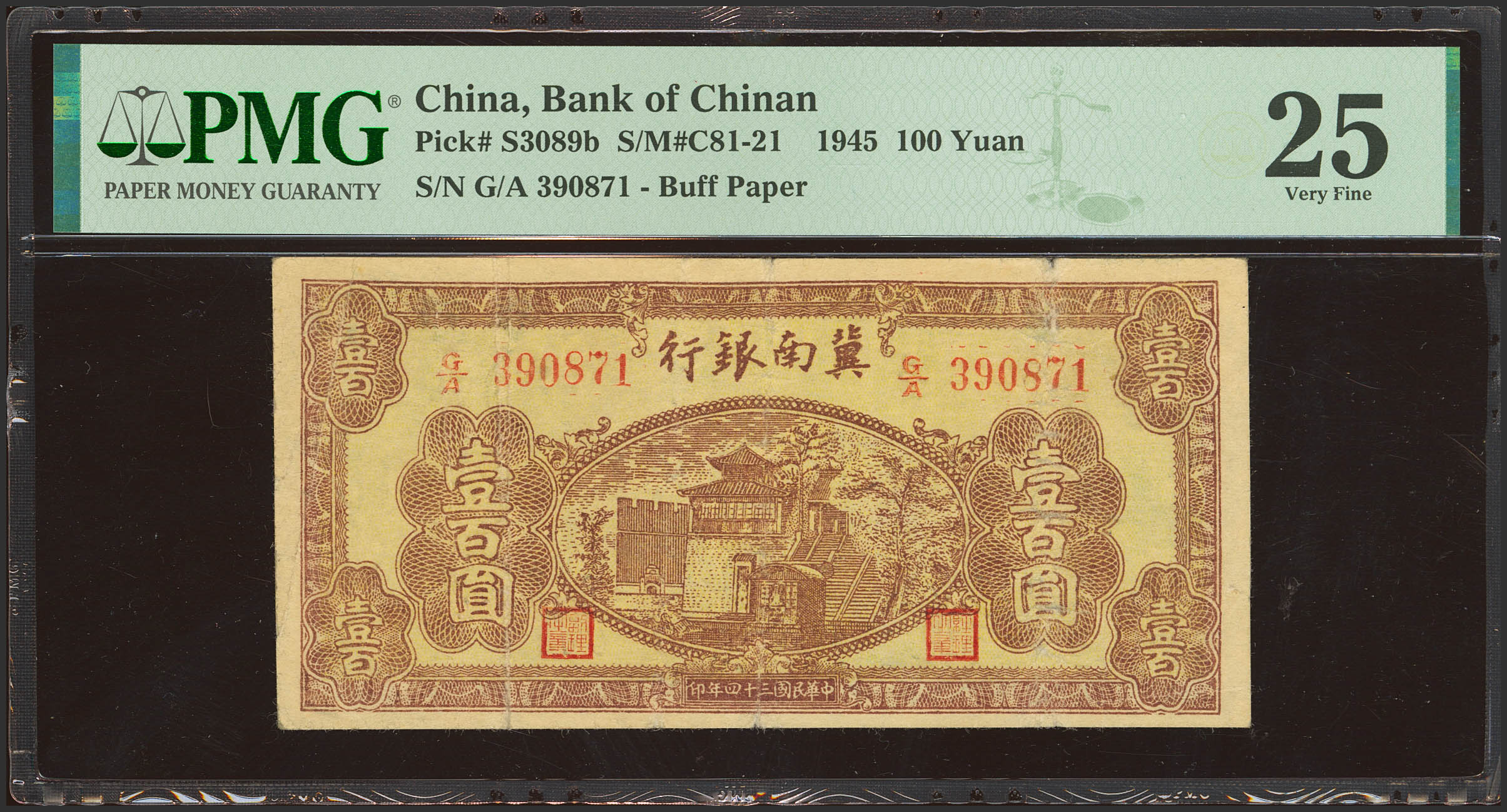CHINA. 100 Yuan. 1945. Bank of Chinan. (Pick: S3089a, SM: C81-21). PMG25 (splits).