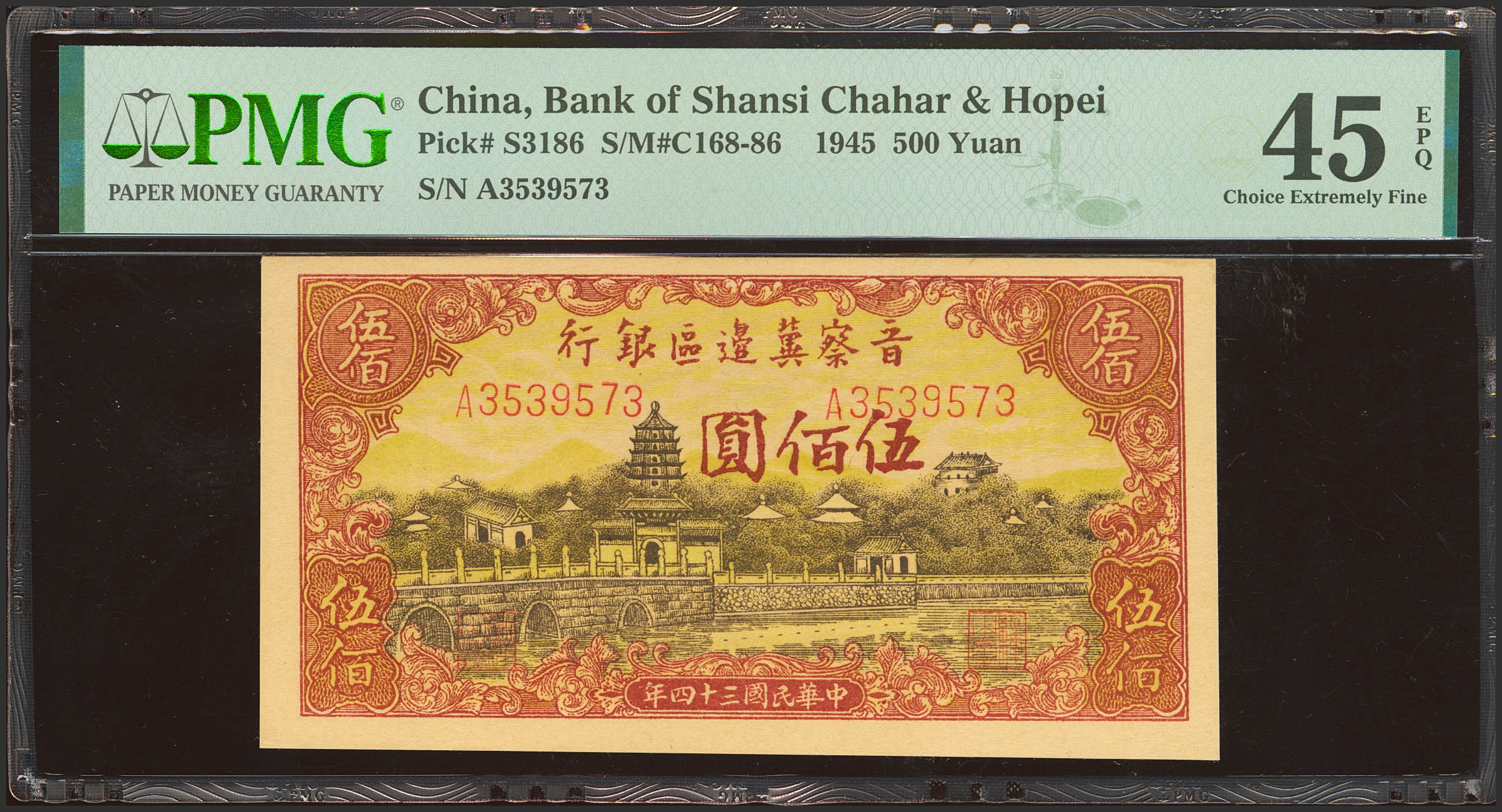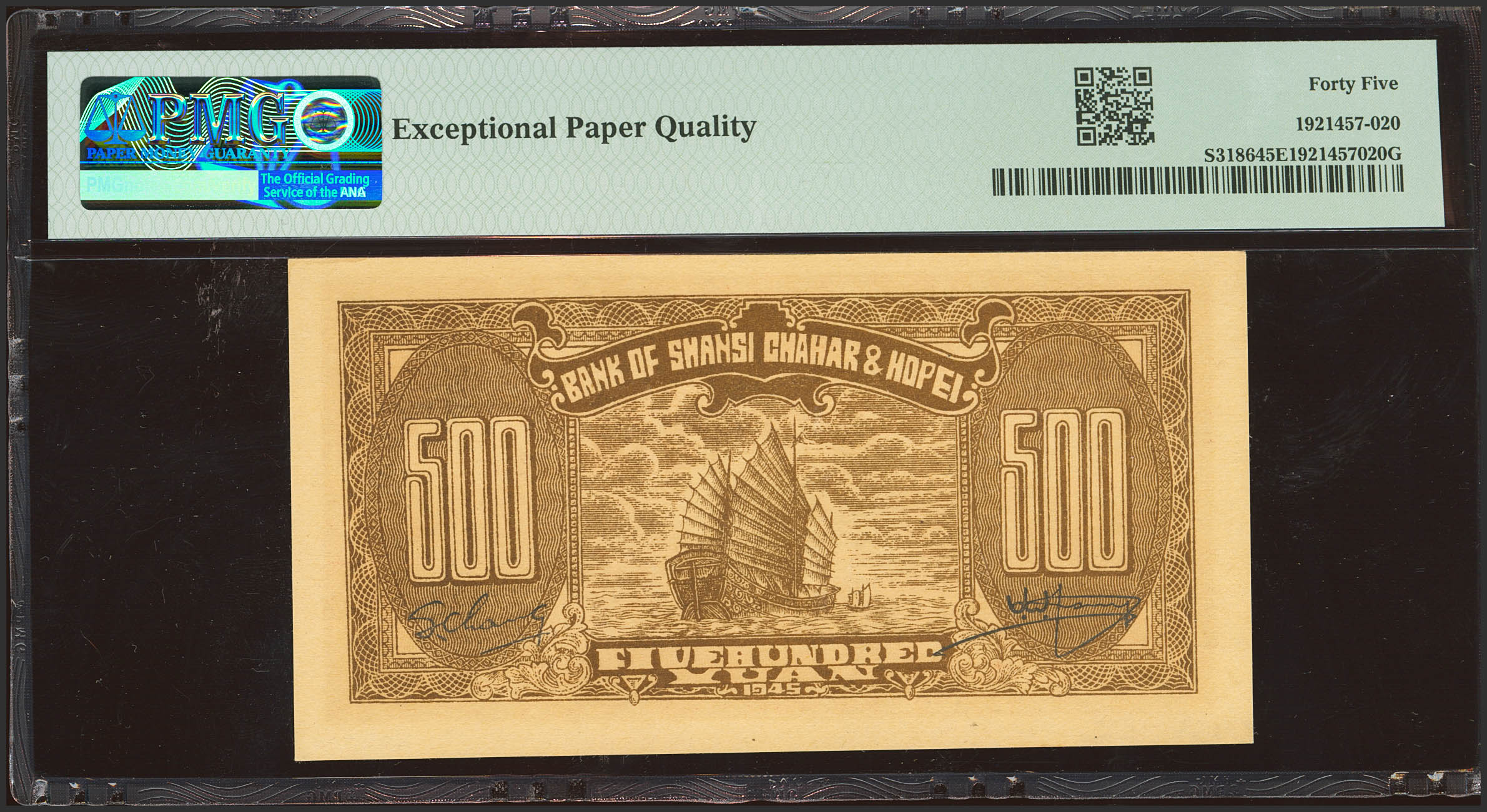 CHINA. 500 Yuan. 1945. Bank of Shansi. Chahar and Hopei. (Pick: S3186, SM: C168-86). PMG45EPQ.