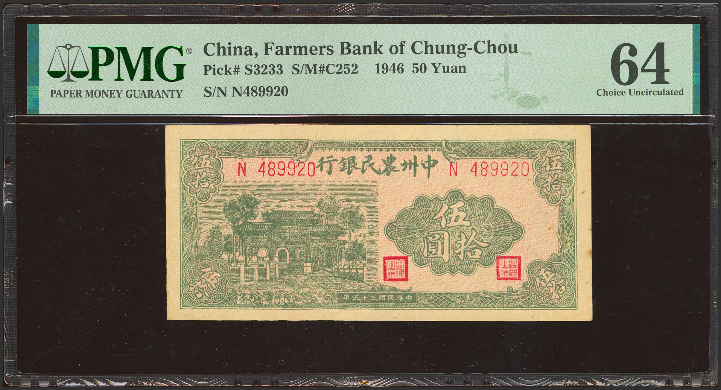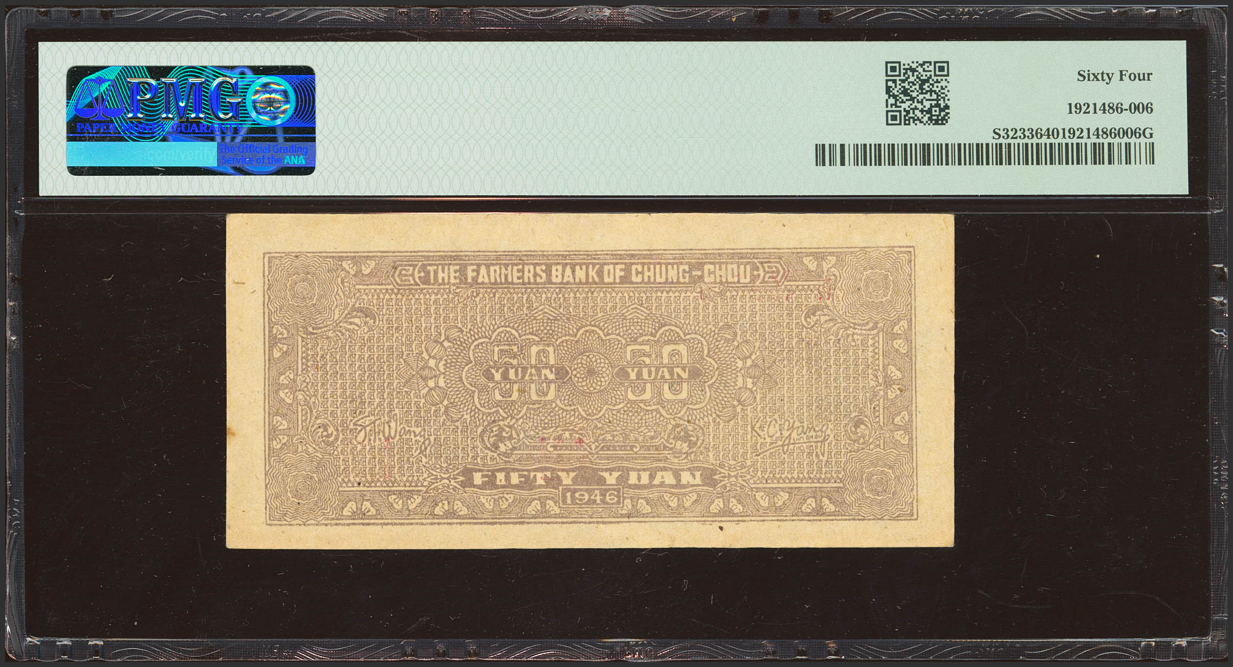 CHINA. 50 Yuan. 1946. Farmers Bank of Chung-Chou. (Pick: S3233, SM: C252). PMG64.
