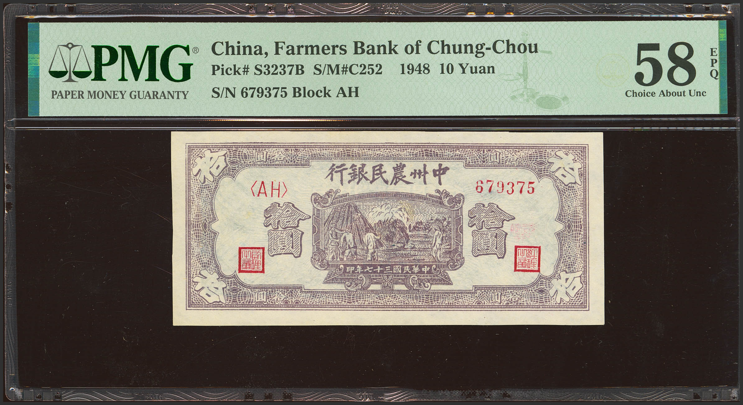 CHINA. 10 Yuan. 1948. Farmers Bank of Chung-Chou. (Pick: S3237B, SM: C252). PMG58EPQ.