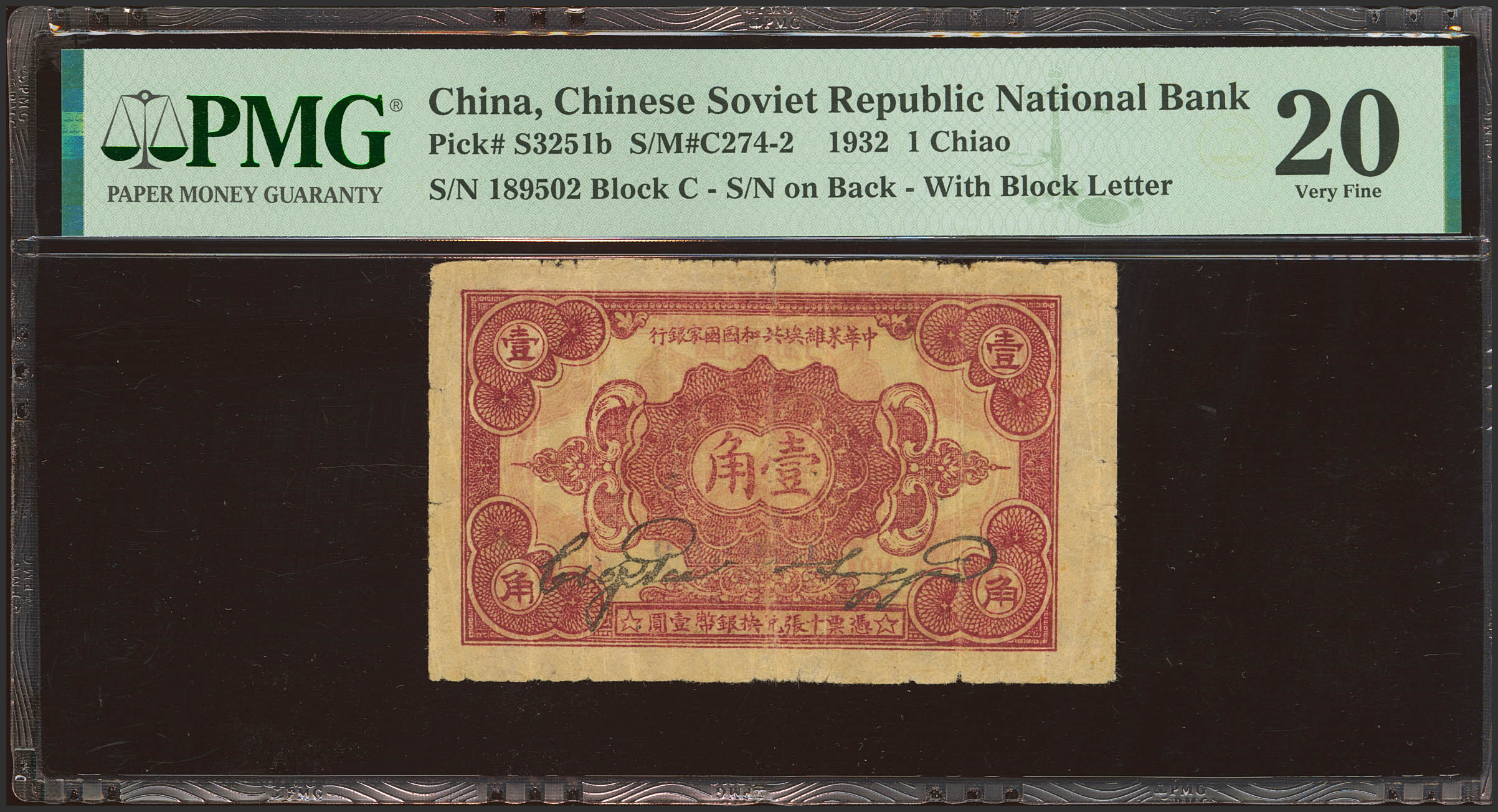 CHINA. 1 Chiao. 1932. Chinese Soviet Republic National Bank. (Pick: S3251b, SM: C274-2). PMG20 (tears).
