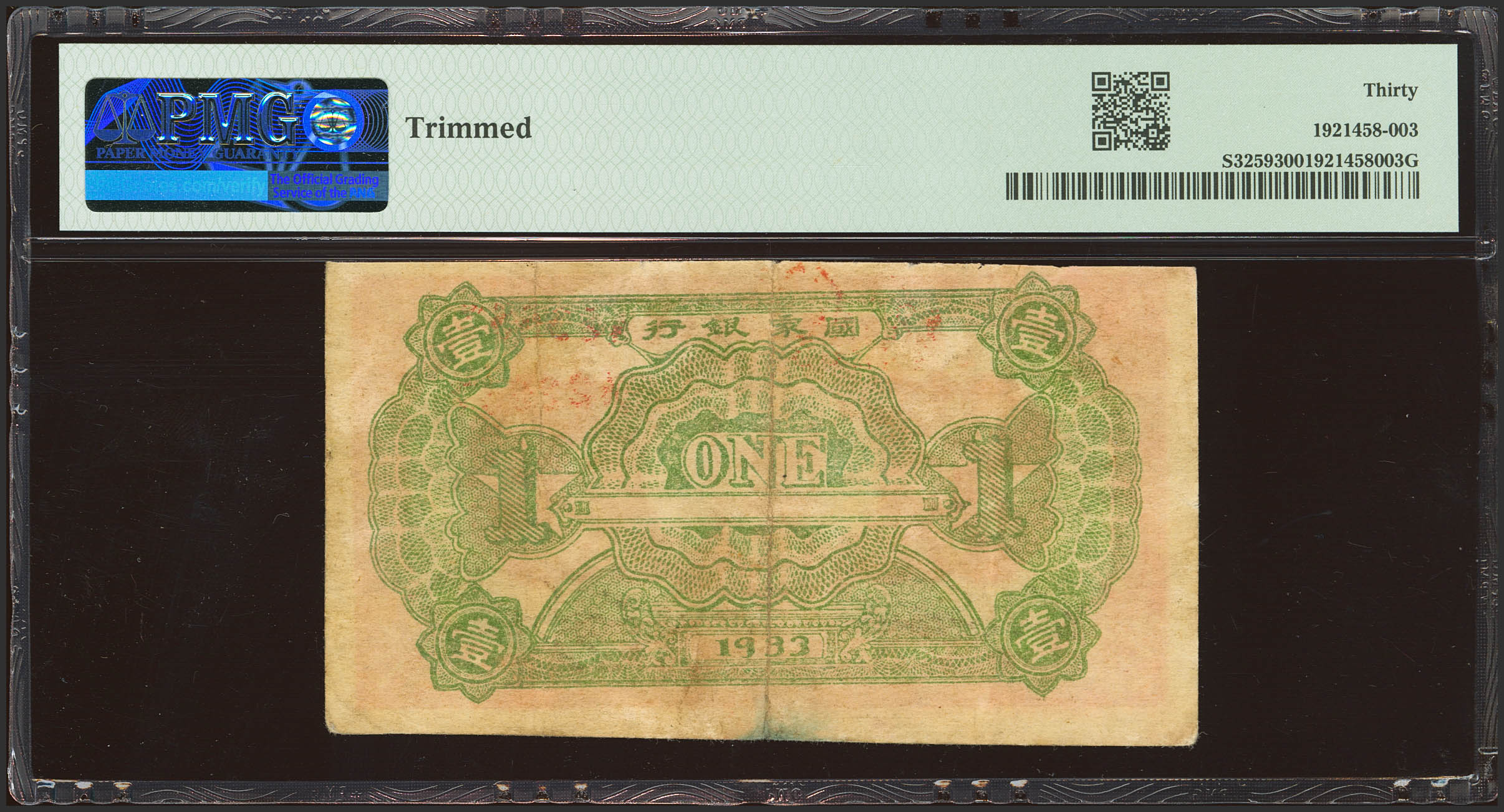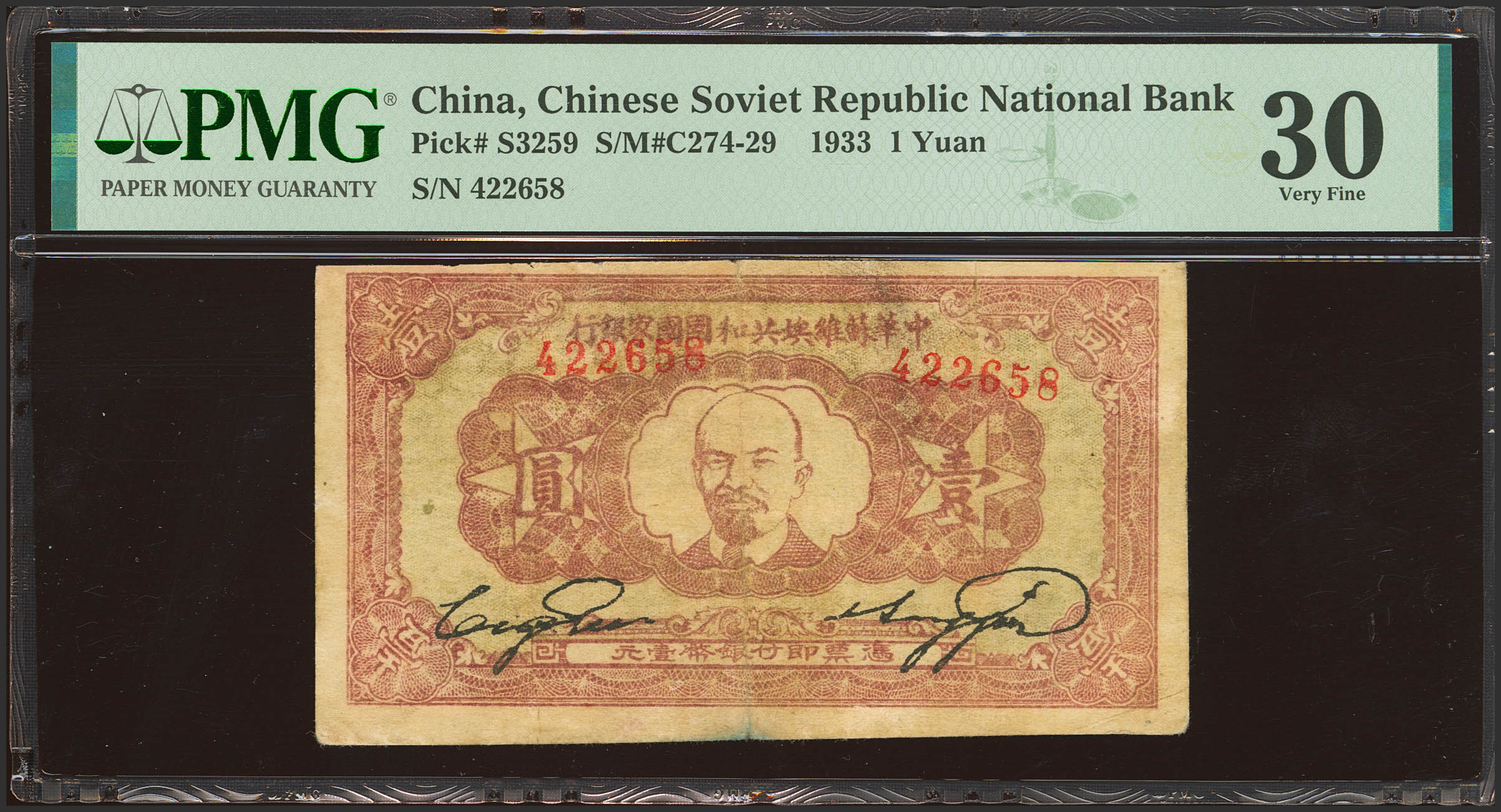 English CHINA. 1 Yuan. 1933. Chinese Soviet Republic National Bank. (Pick: S3259, SM: C274-29). PMG30 (trimmed).