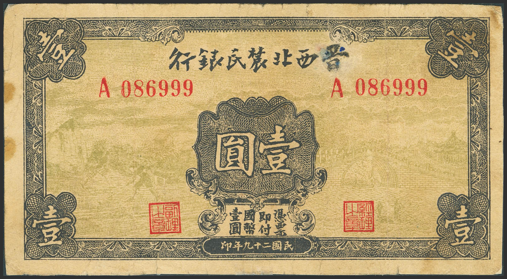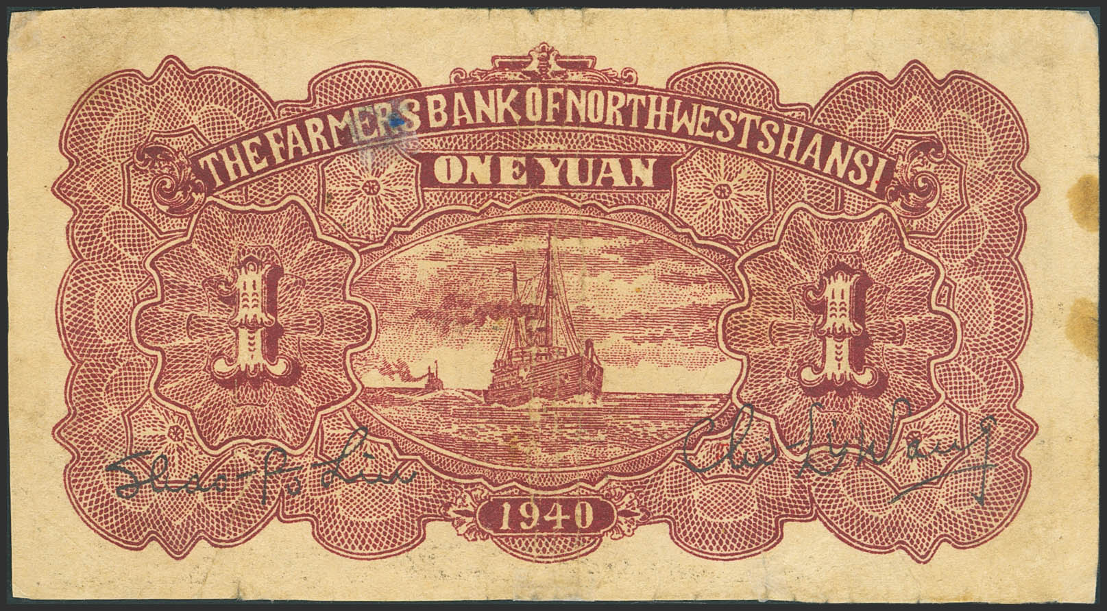 CHINA. 1 Yuan. 1940. Farmers Bank of Northwest China. (Pick: S3293a). Circular stamp removed to make it appear as variant 3293b and tape added to the manipulated area on the reverse. More than Very Fine.