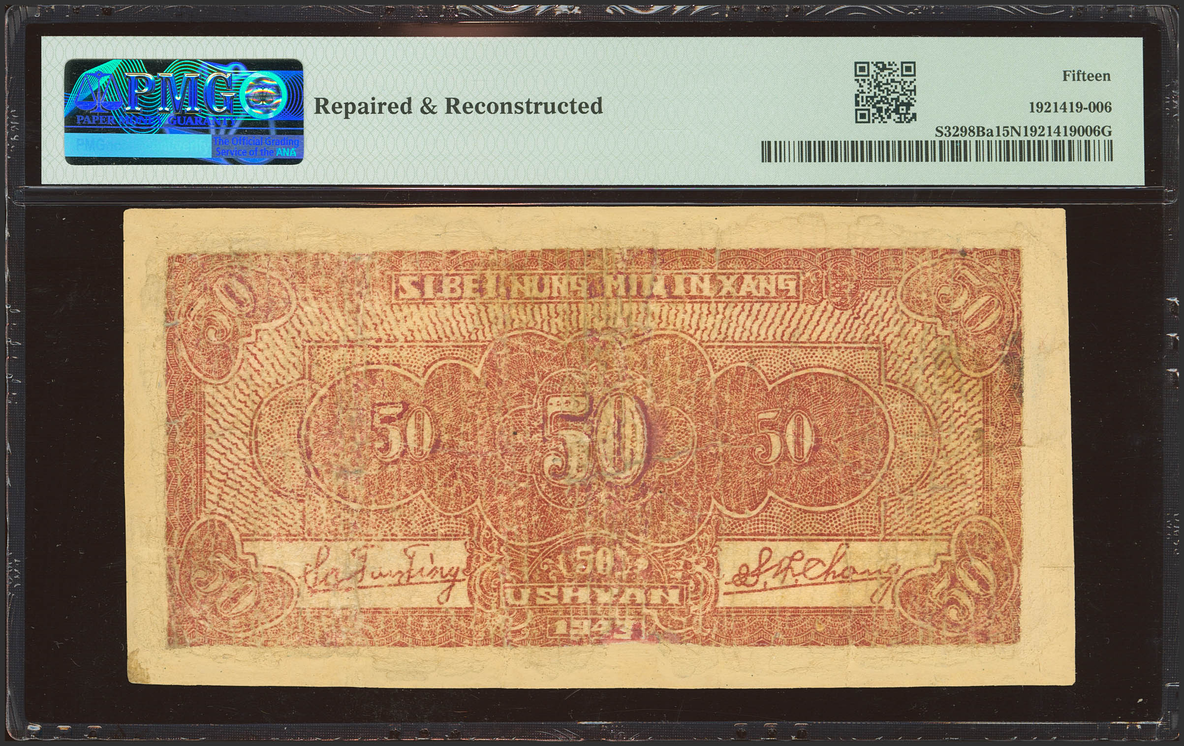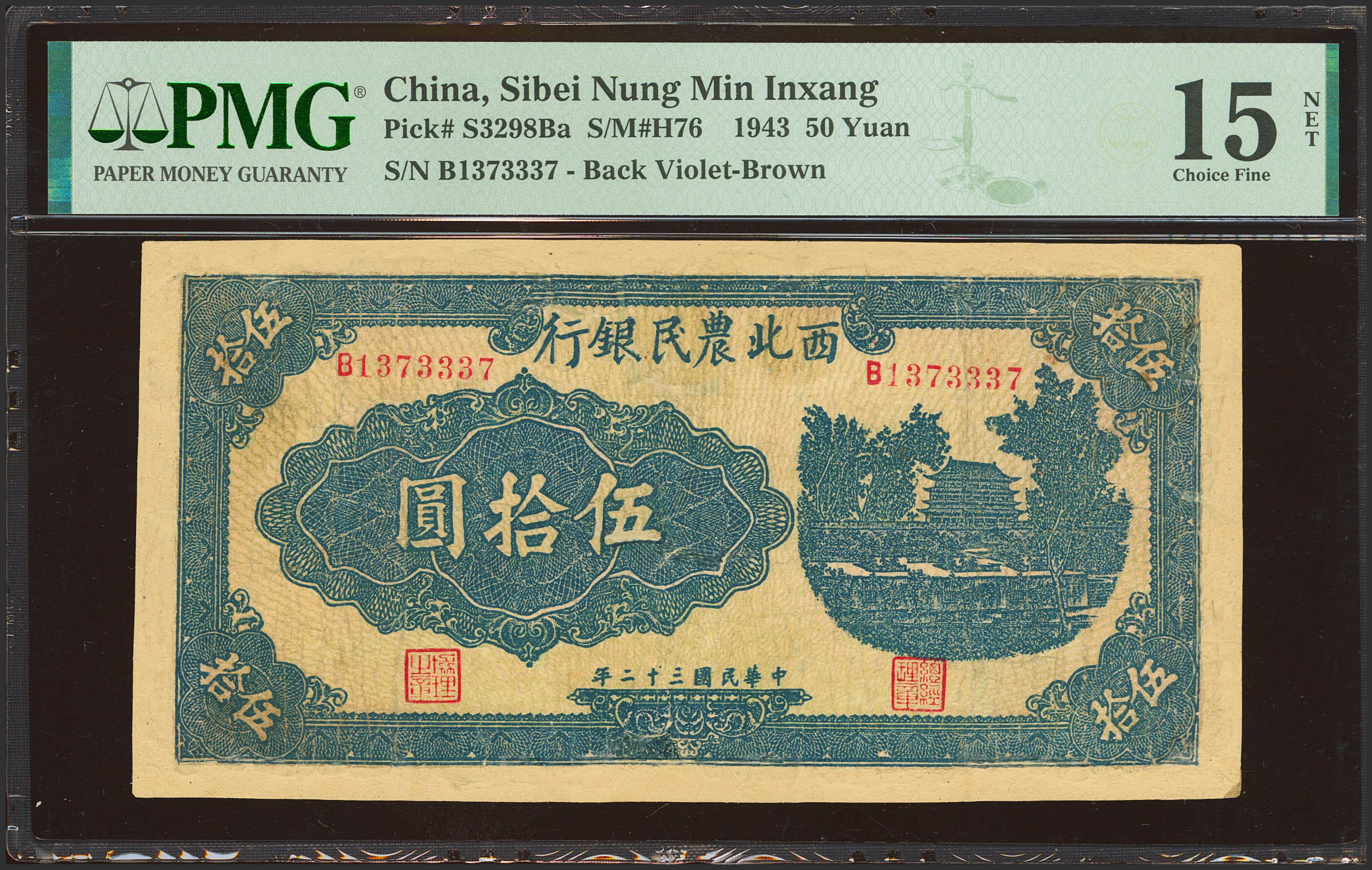 CHINA. 50 Yuan. 1943. Farmers Bank of Northwest China. (Pick: S3298Ba, SM: H76). PMG15NET (repaired and reconstructed).