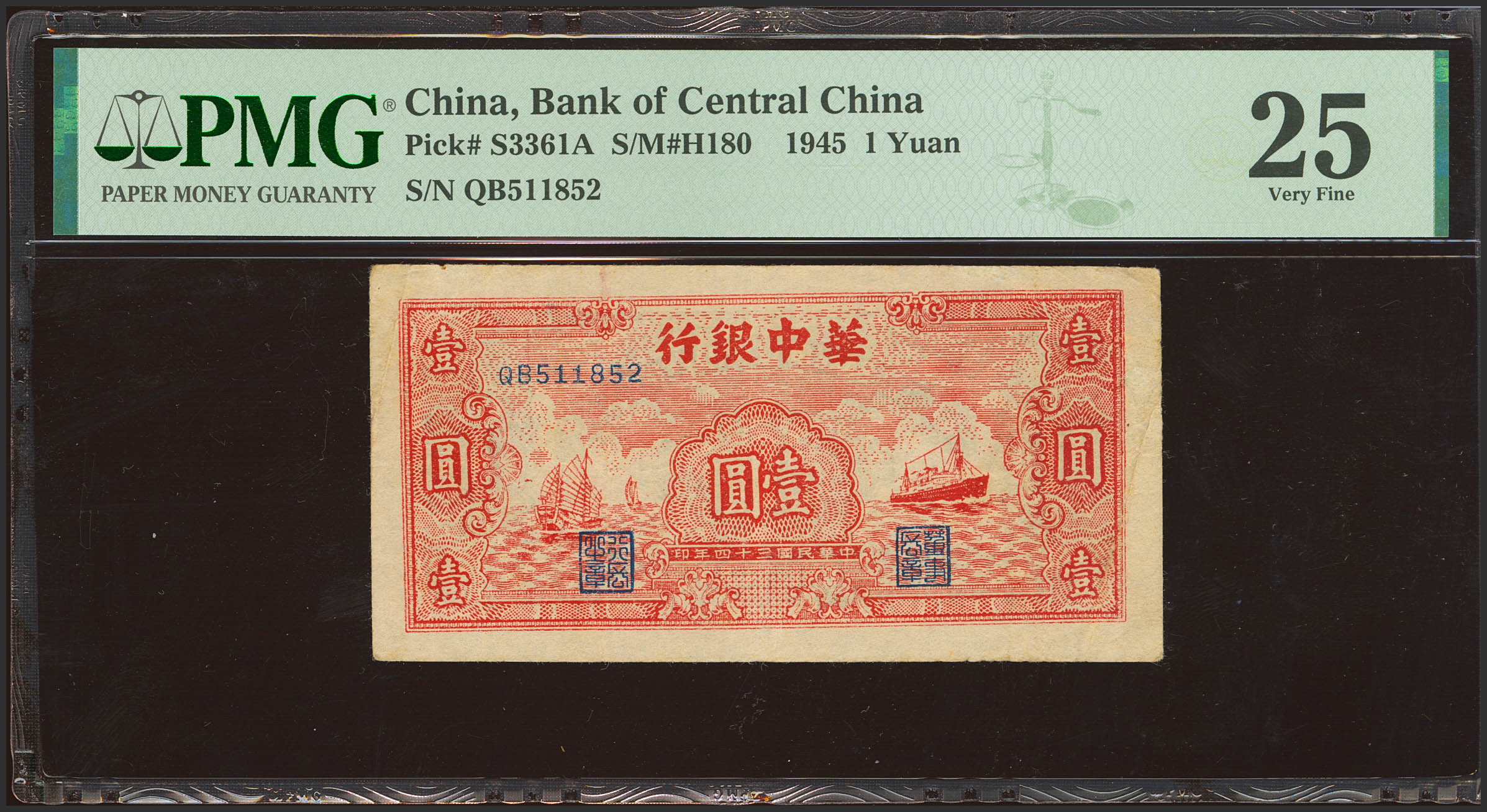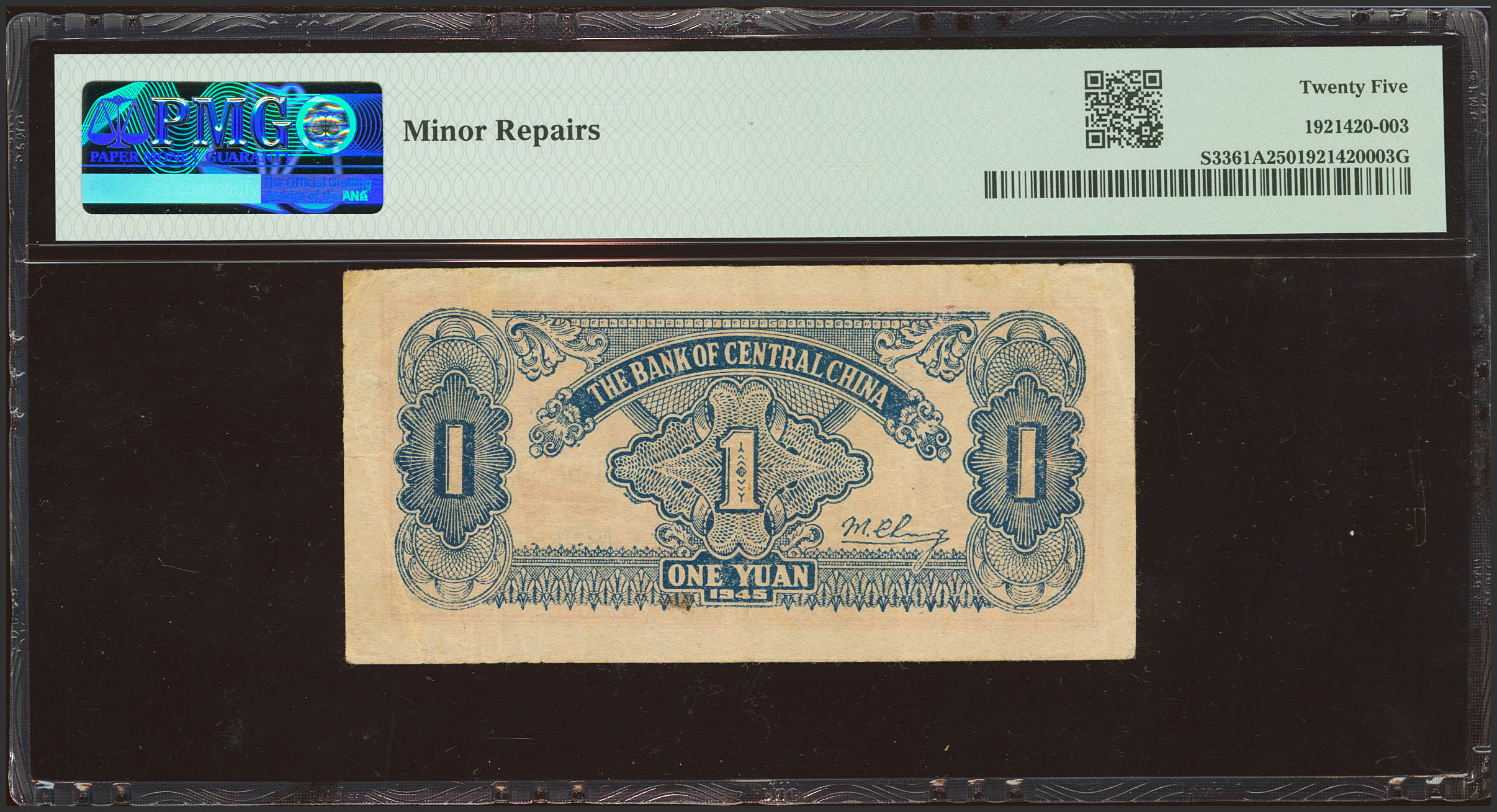 CHINA. 1 Yuan. 1945. Central Bank of China. (Pick: S3361A, SM: H180). PMG25 (minor repairs).