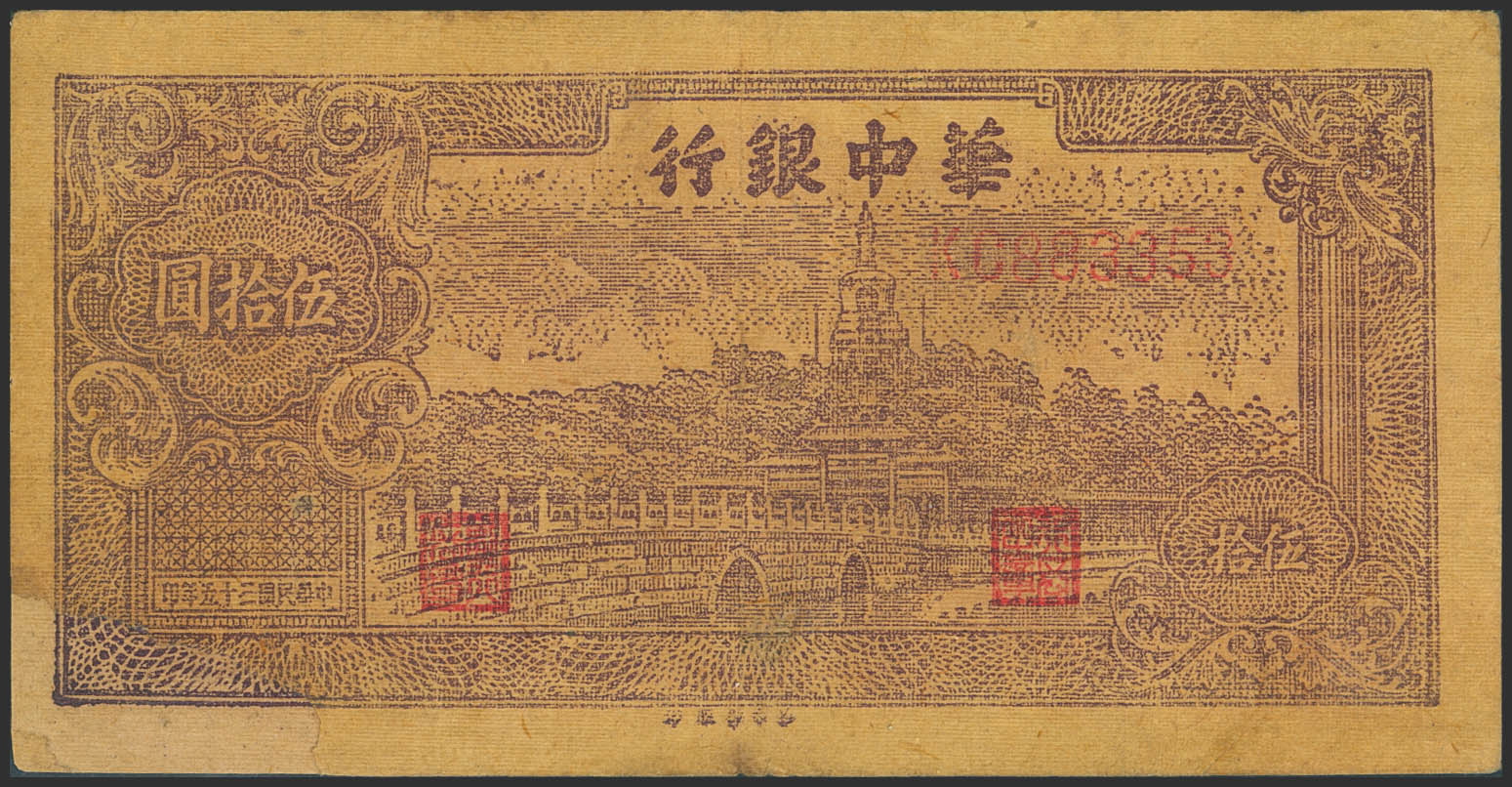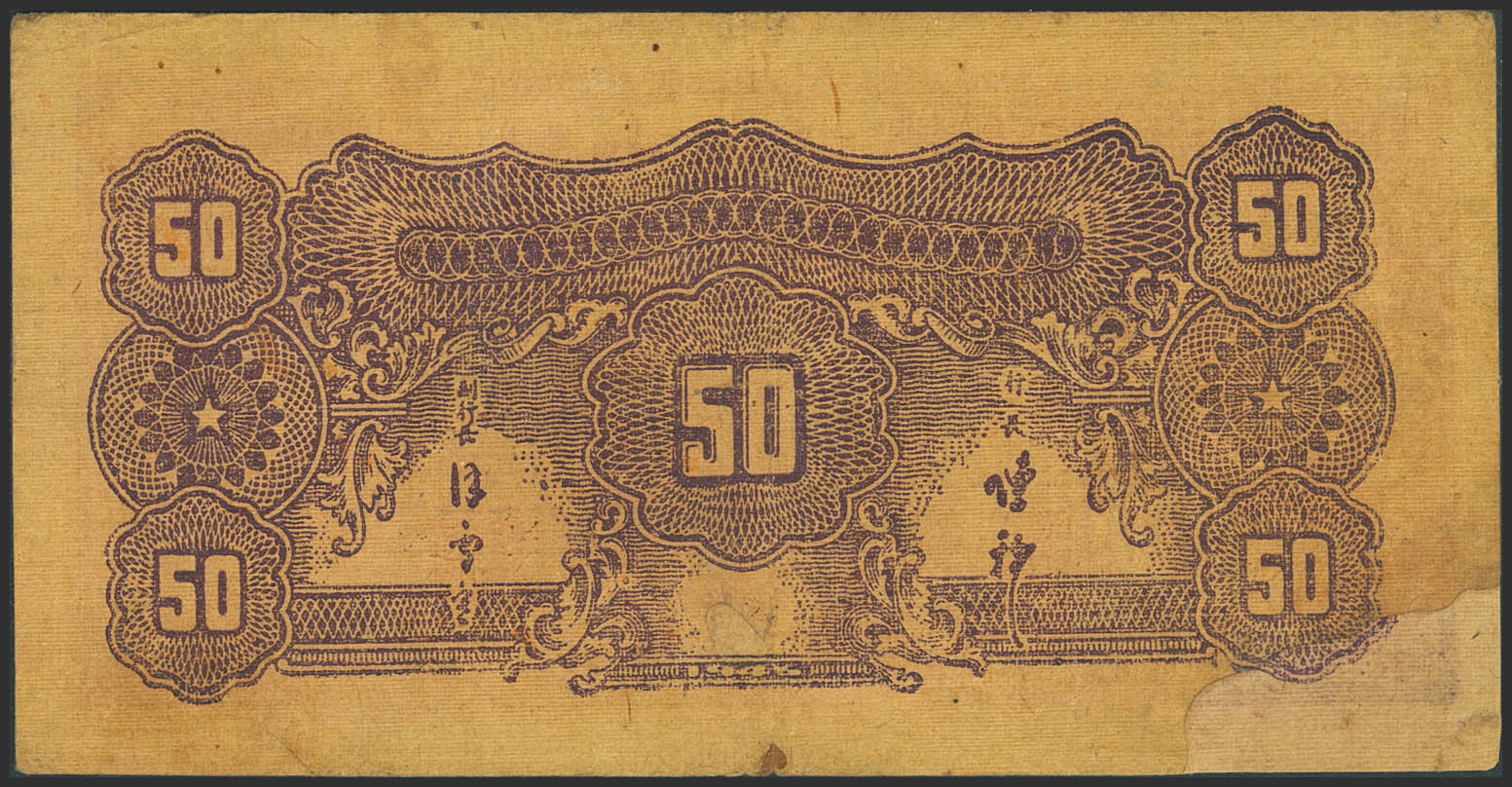 CHINA. 50 Yuan. 1946. Central Bank of China. (Pick: S3386b). Corner reconstructed with a piece of another banknote, with added paper pulp. Fine.
