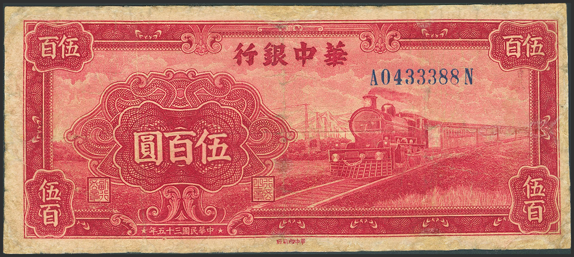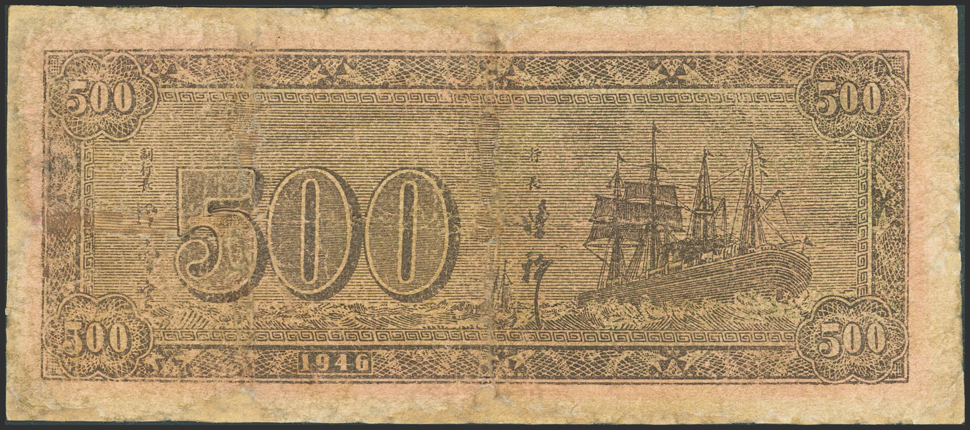 English CHINA. 500 Yuan. 1946. Central Bank of China. (Pick: S3394a). Severe restoration. Very Good.