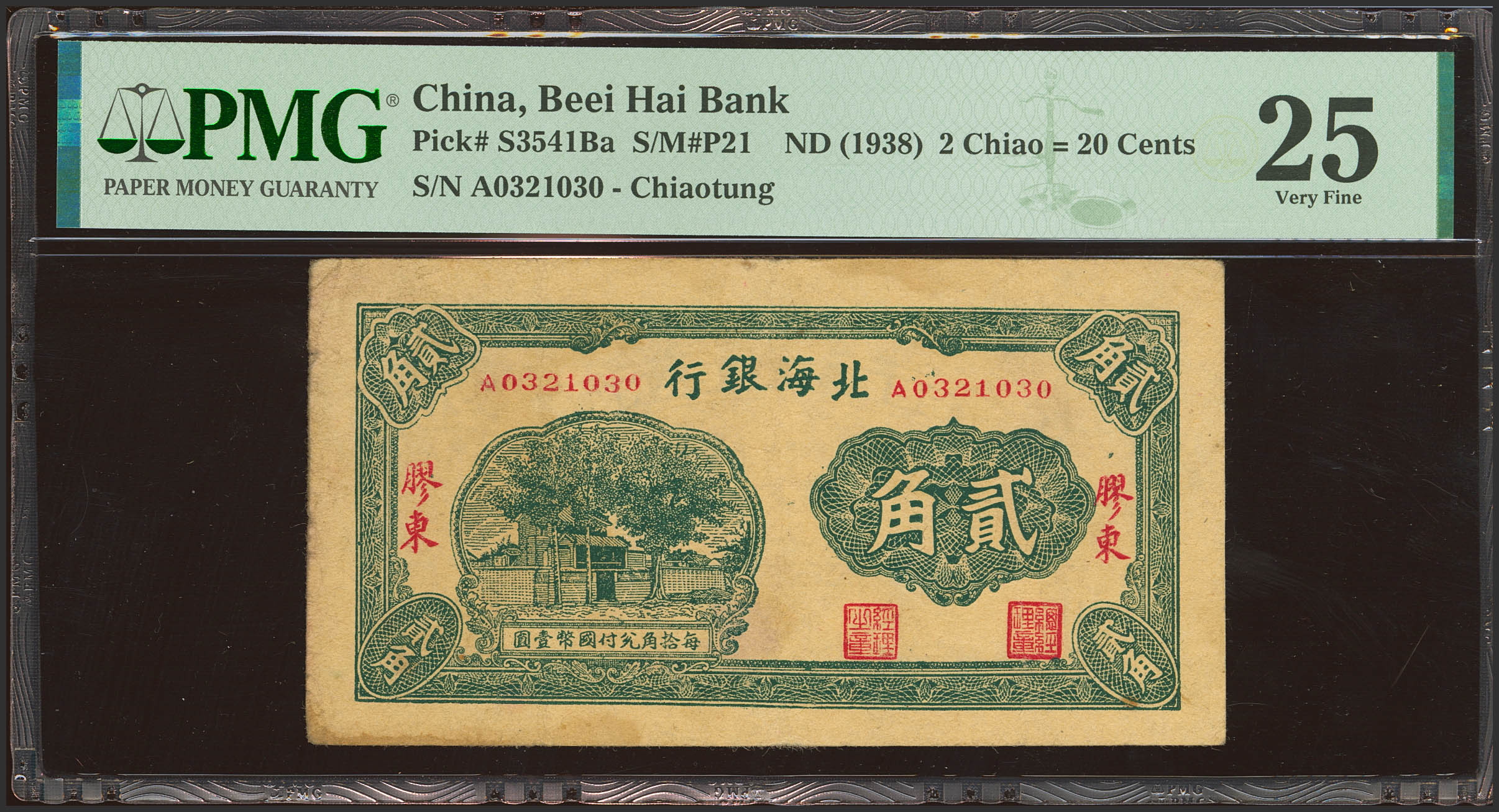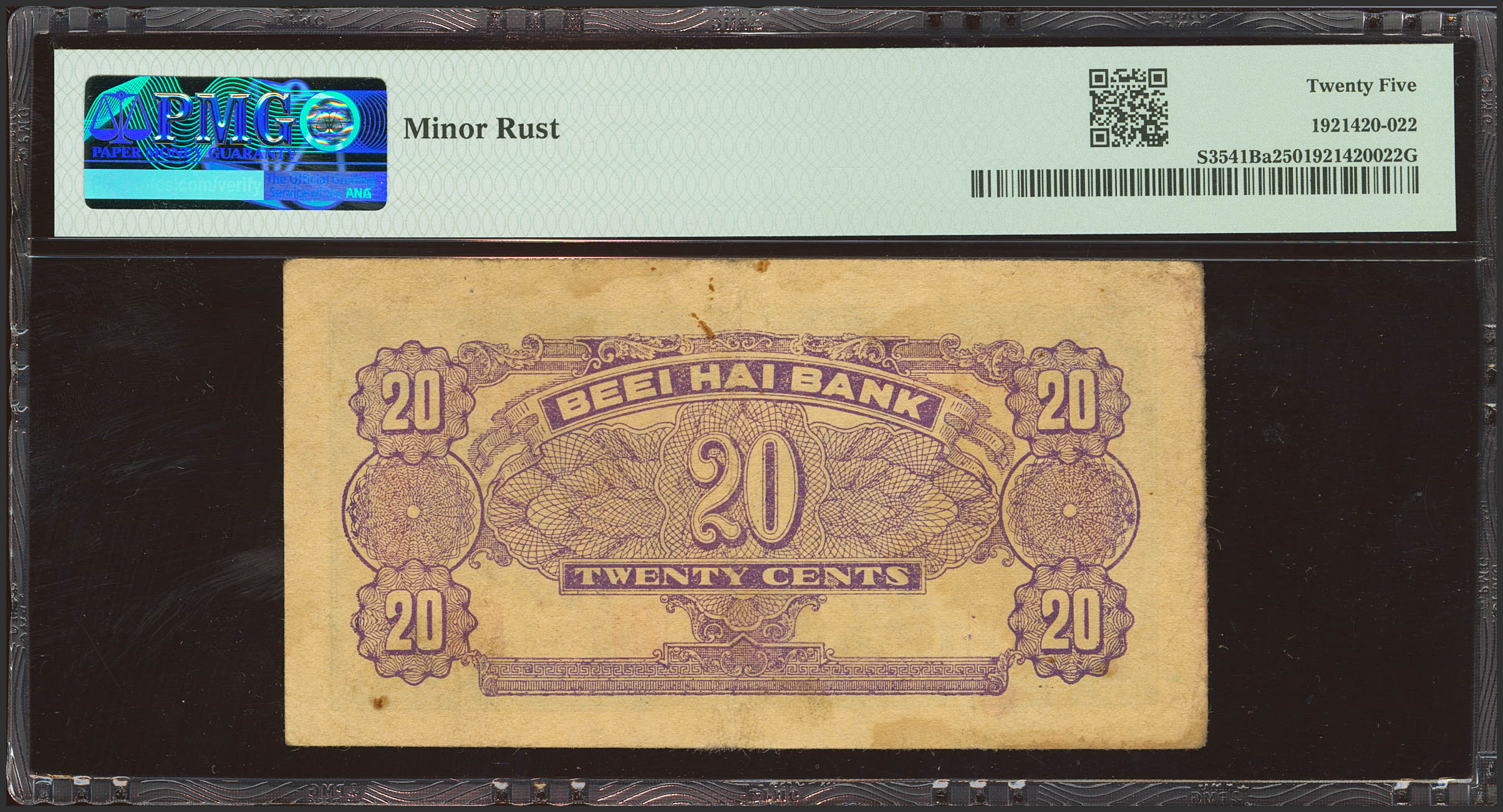 CHINA. 20 Cents. (1938ca). Beei Hai Bank. (Pick: S3541B, SM: P21). PMG25 (minor rust).