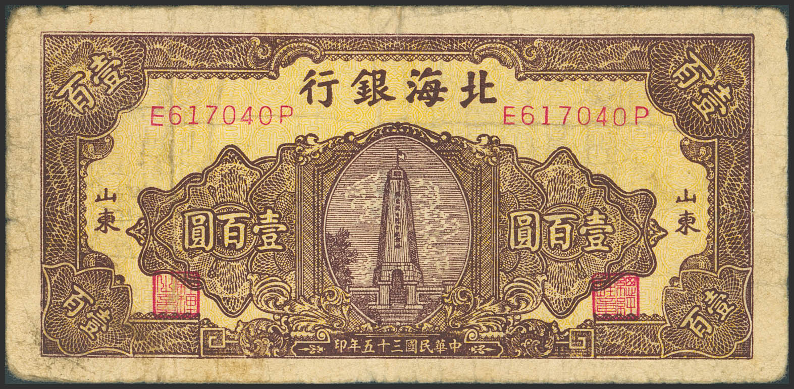 English CHINA. 100 Yuan. 1946. Bank of Bai Hai. (Pick: S3604). Adhesive paper added at the top center on the central fold. Fine.