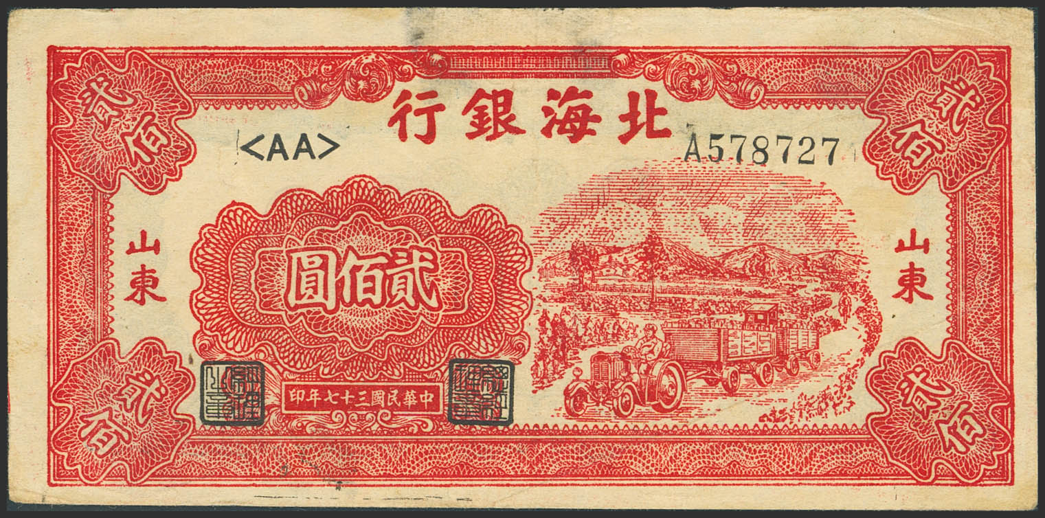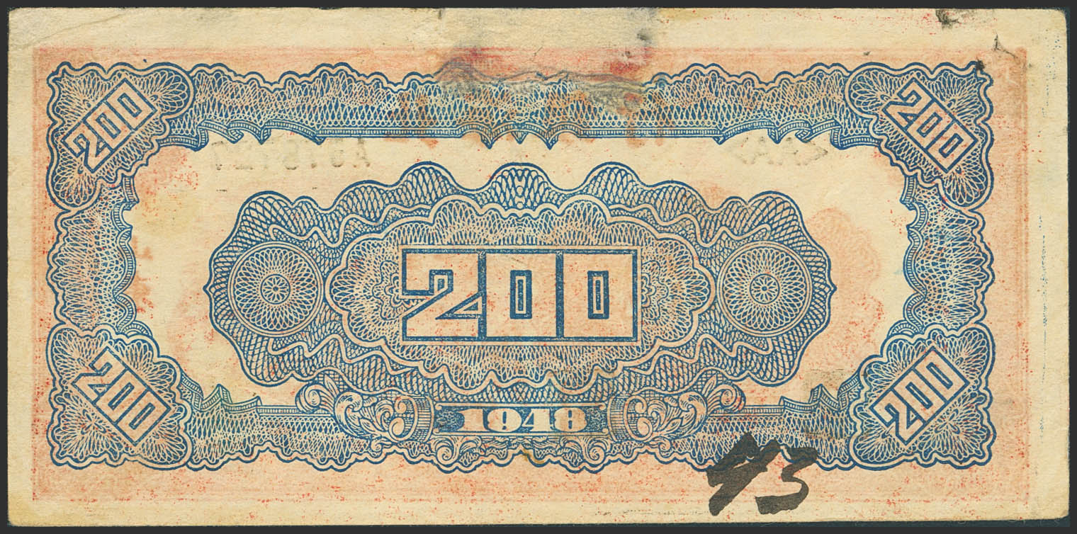 English CHINA. 200 Yuan. 1948. Peilhai Bank. (Pick: S3621). Previously mounted. Very Fine.
