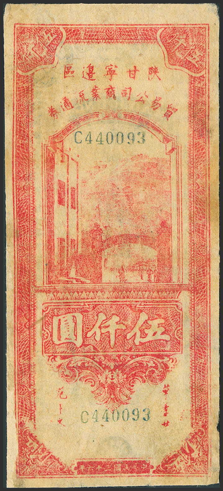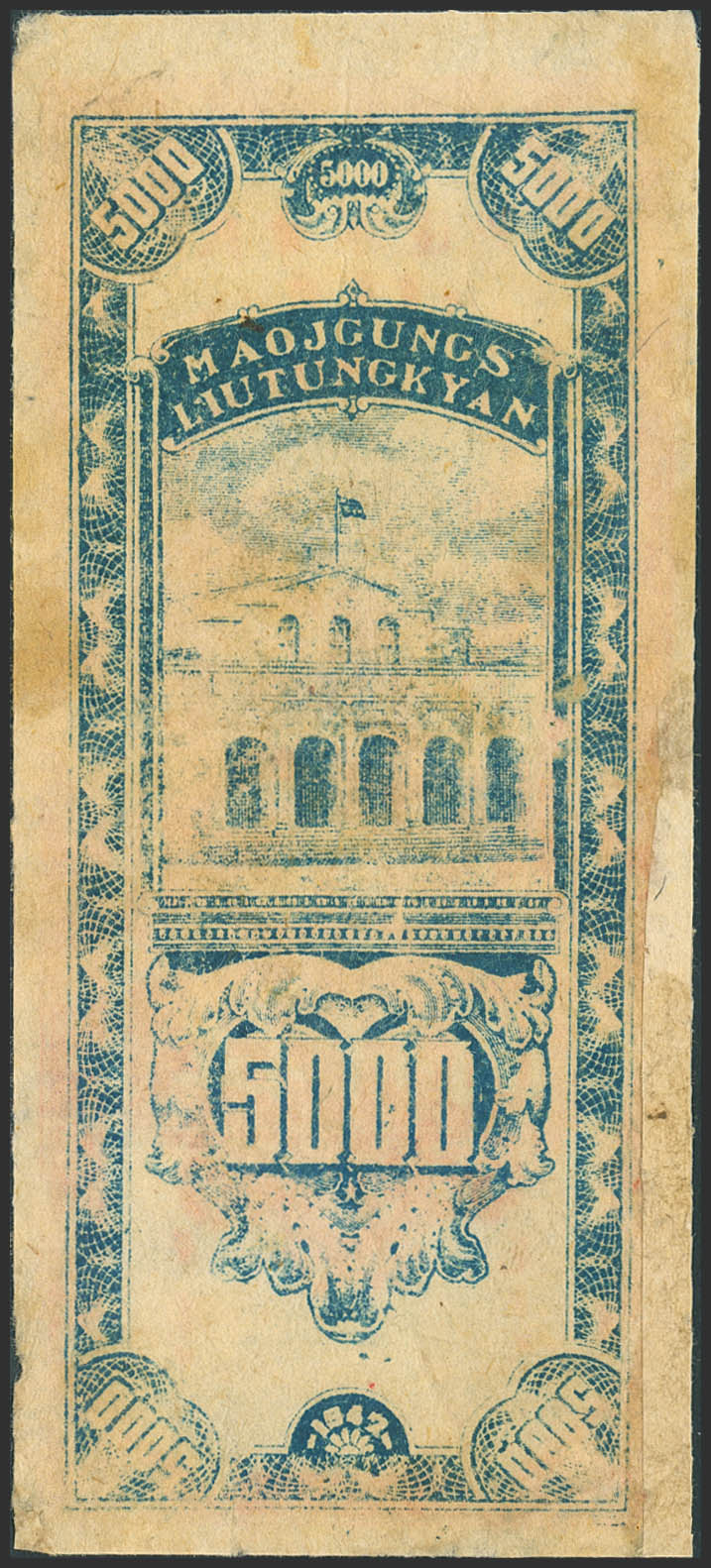 CHINA. 5000 Yuan. 1947. Maojgungs Liutungkyan. (Pick: S3647). Repairs over paper deficiencies. Very Good.