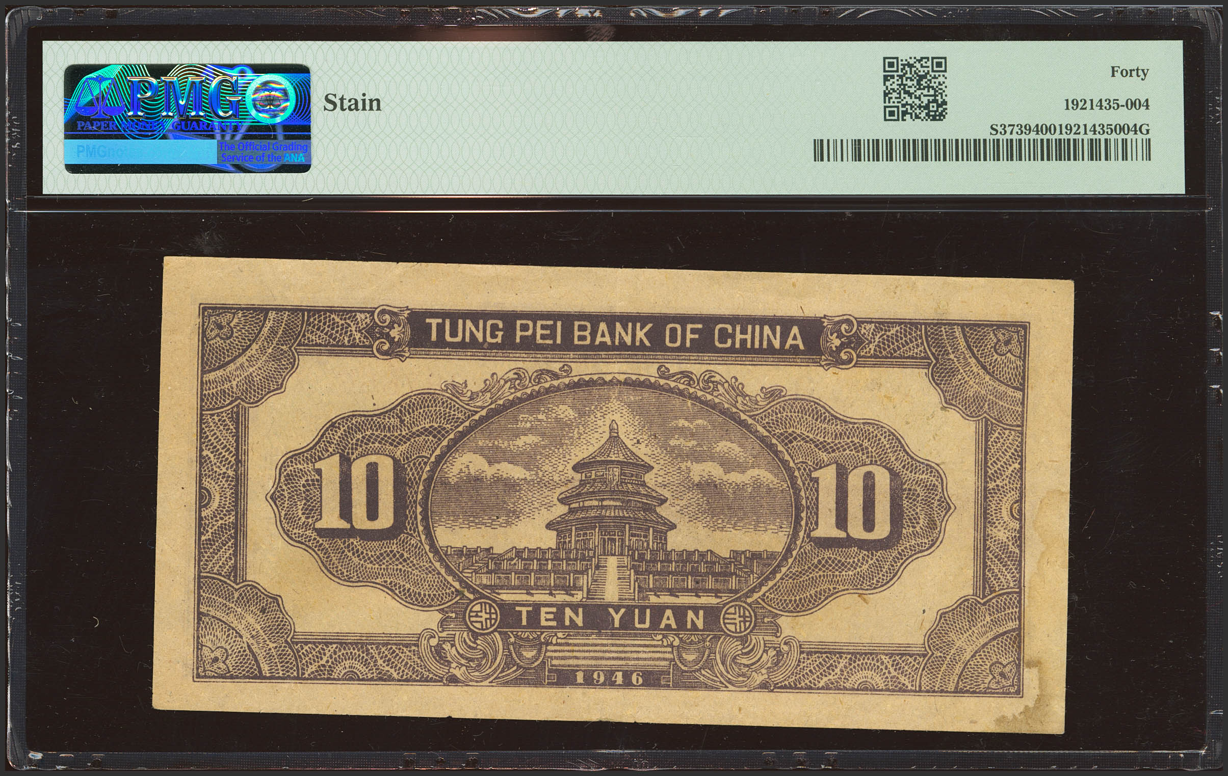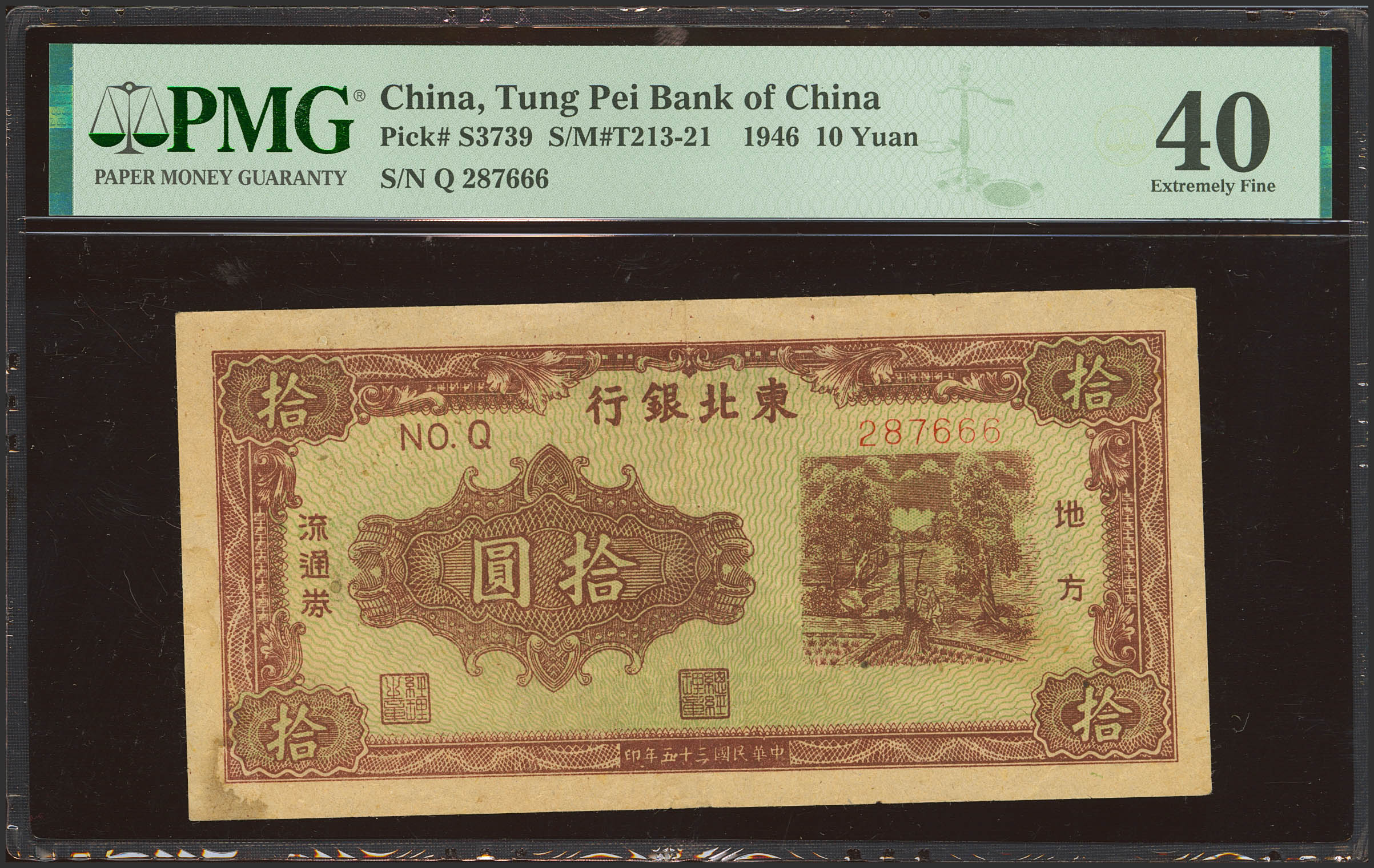 CHINA. 10 Yuan. 1946. Tung Pei Bank of China. (Pick: S3739, SM: T213-21). Pinhole. PMG40 (stain).