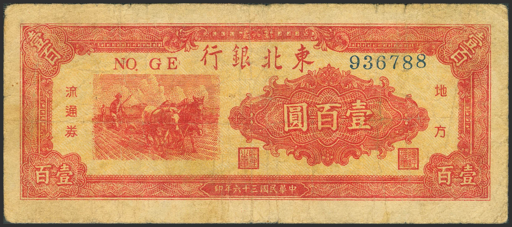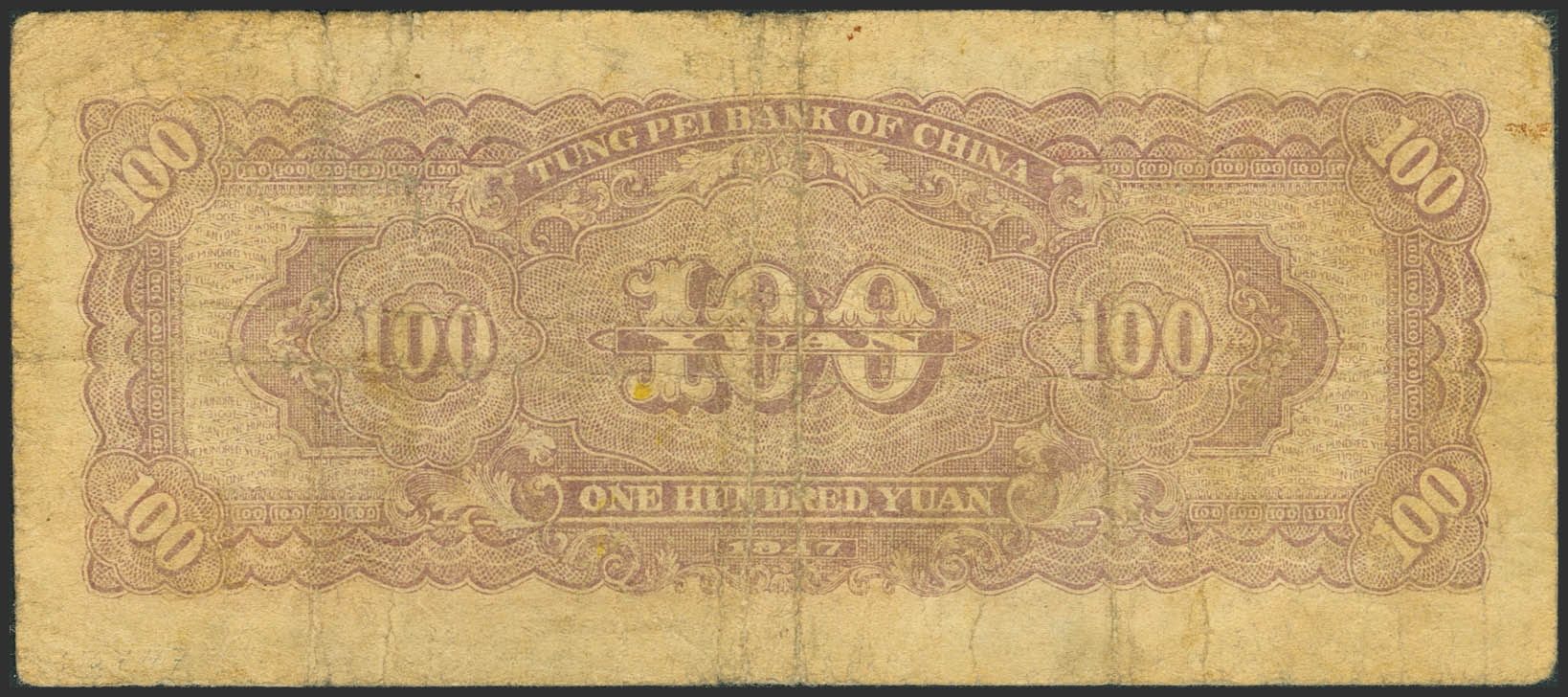 CHINA. 100 Yuan. 1947. Tung Pei Bank of China. (Pick: S3747). Fine.