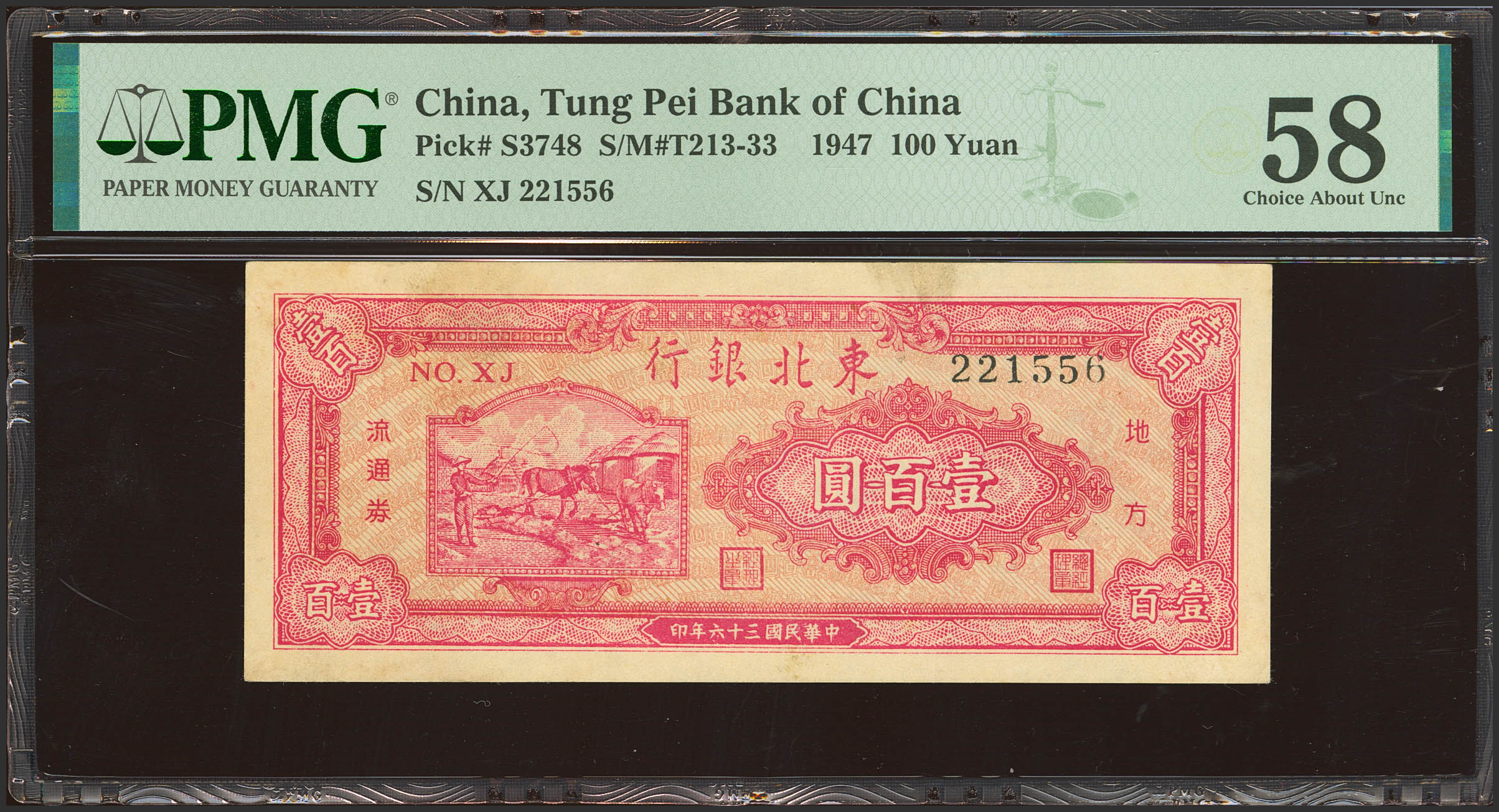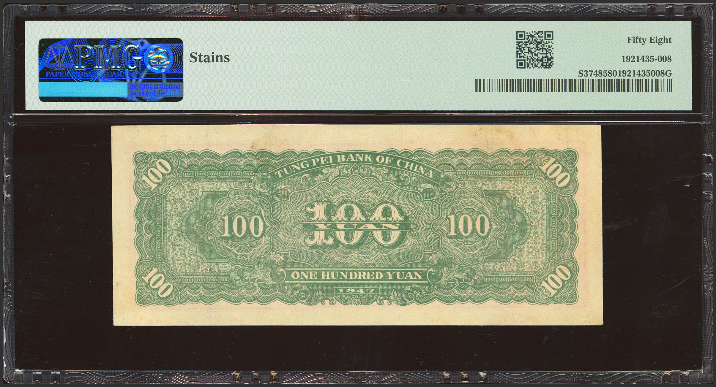 CHINA. 100 Yuan. 1947. Tung Pei Bank of China. (Pick: S3748, SM: T213-33). PMG58 (stains).