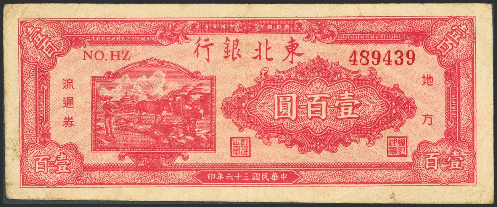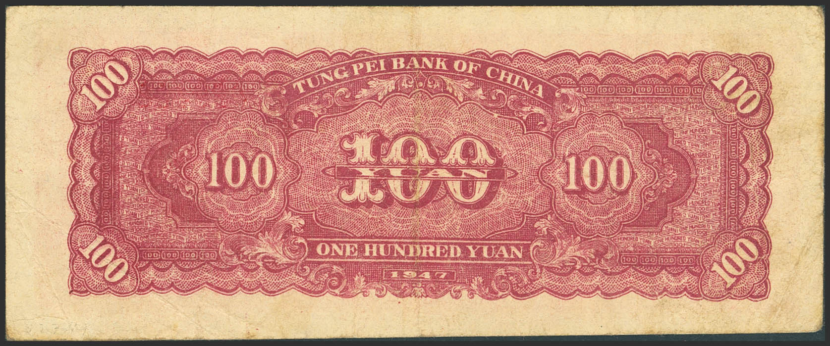 English CHINA. 100 Yuan. 1947. Tung Pei Bank of China. (Pick: S3750). Very Fine.