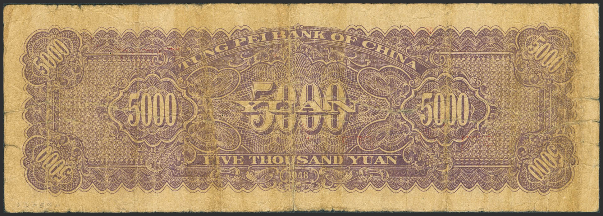 CHINA. 5000 Yuan. 1948. Tung Pei Bank of China. (Pick: S3759A). Tears and pinholes. Very Good.