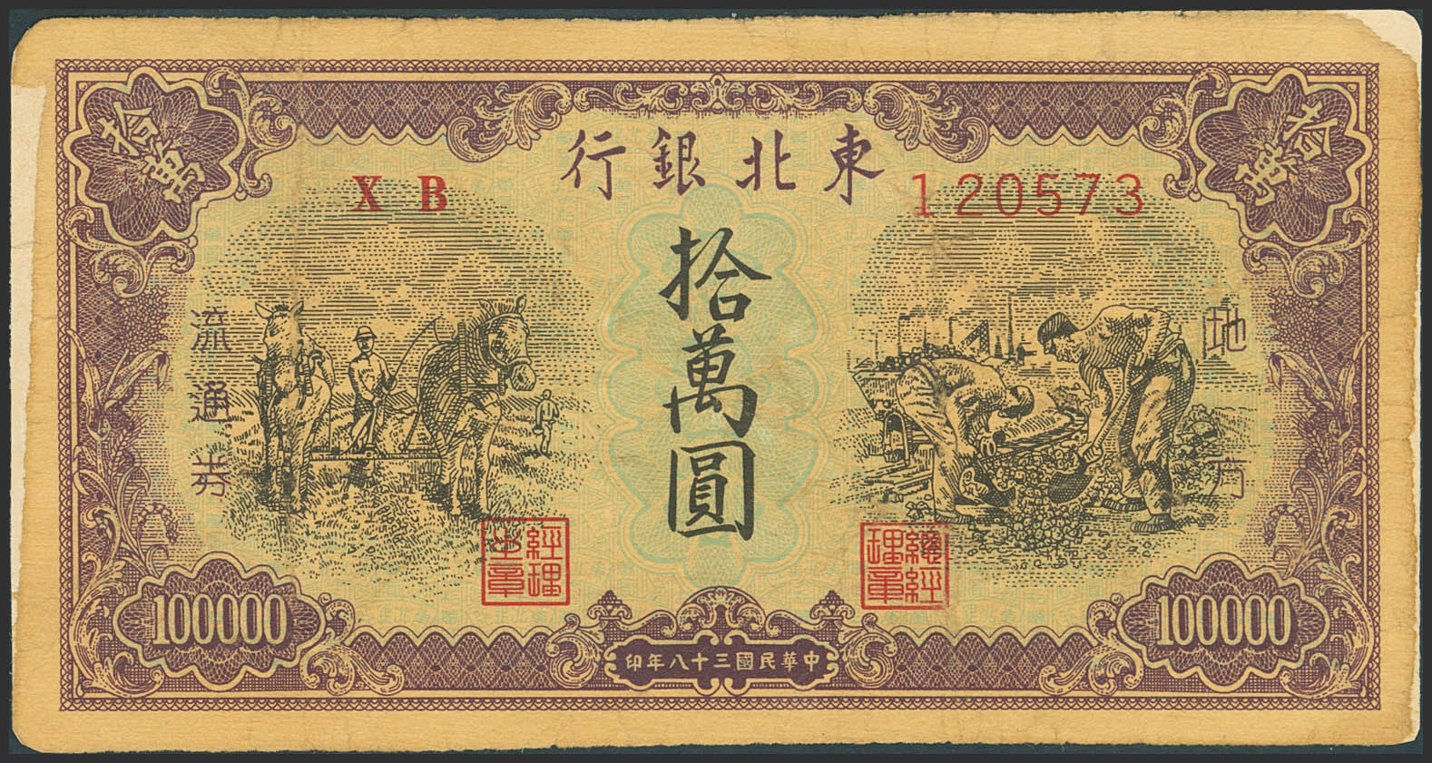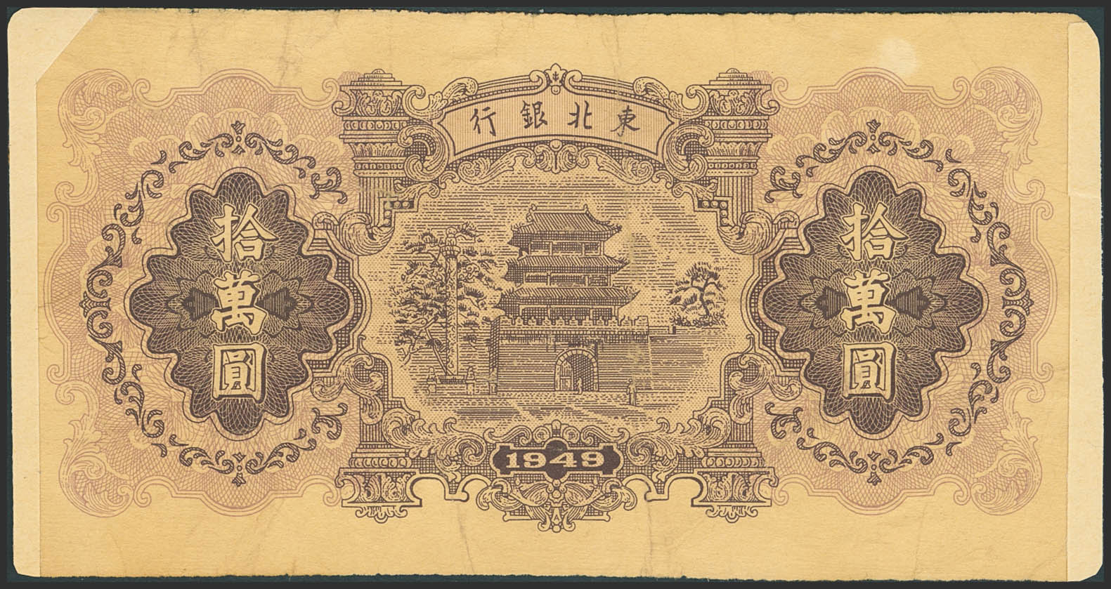CHINA. 100000 Yuan. 1949. Counterfeit. Tung Pei Bank of China. (Pick: S3765). Adhesive paper on the left and right edges over areas without paper. Very Fine.