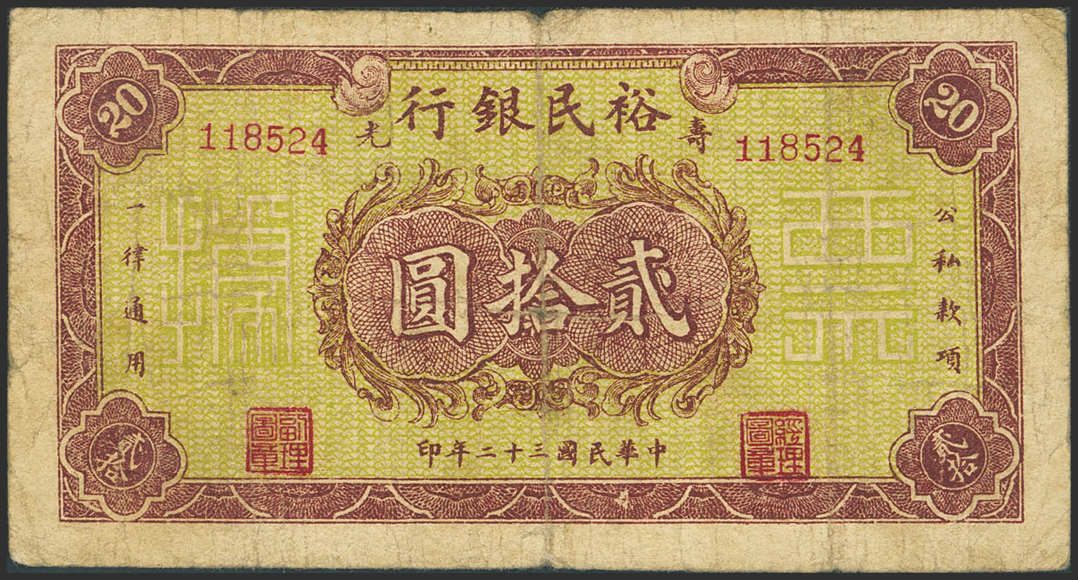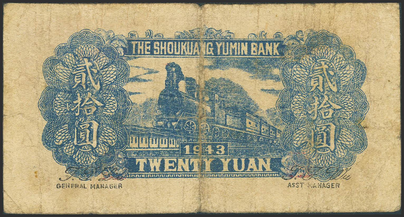 CHINA. 20 Yuan. 1943. Shoukuang Yu Min Bank. (Pick: Unlisted. S/M: Y36). Pinhole. Fine.