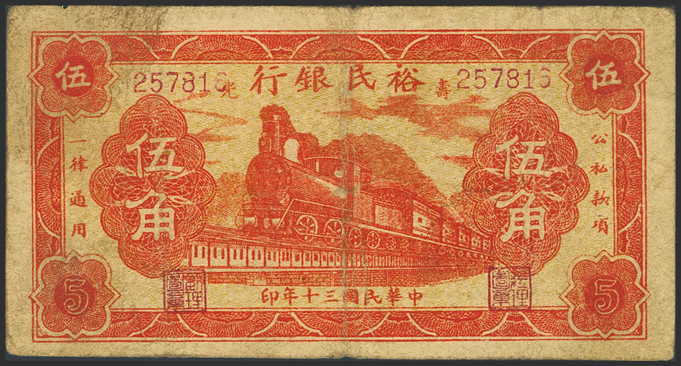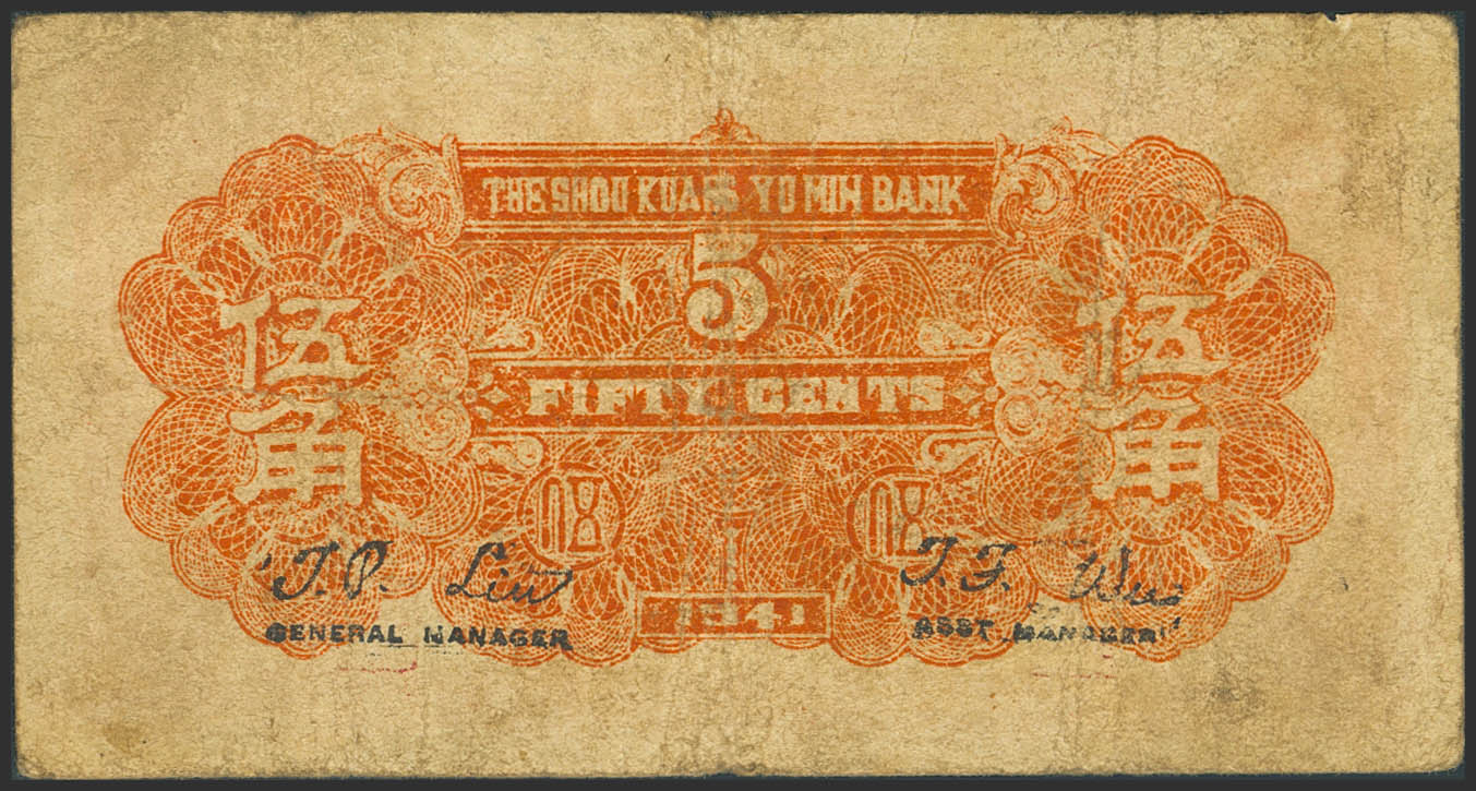 English CHINA. 50 Cents. 1941. Shoukuang Yu Min Bank. (Pick: Unlisted. S/M: Y36). Pinhole. More than Fine.