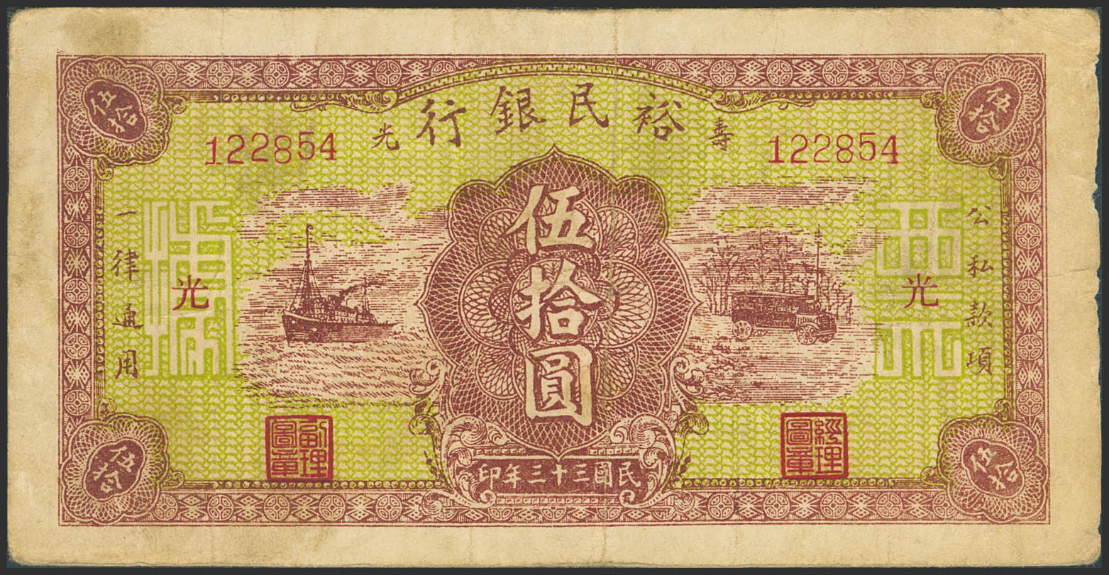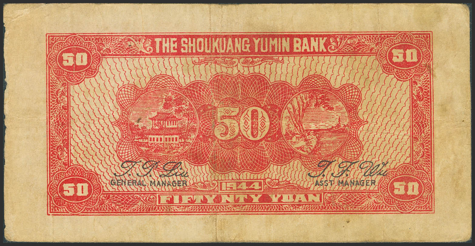 CHINA. 50 Yuan. 1944. Shoukuang Yu Min Bank. (Pick: Unlisted. S/M: Y36). Very Fine.