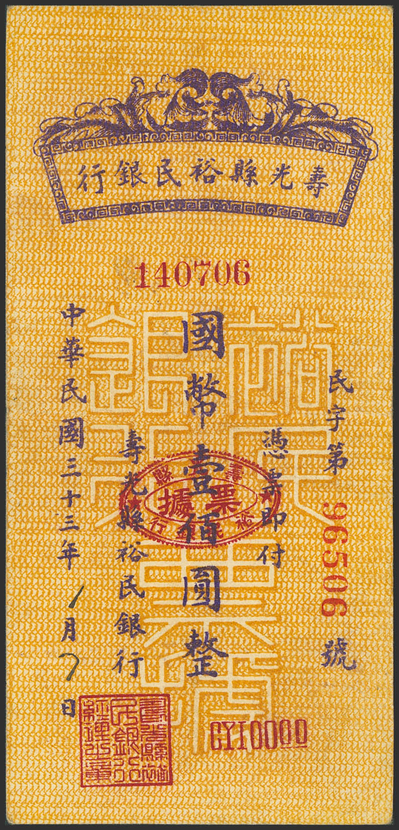 English CHINA. 100 Yuan. 1943. Shoukuang Yu Min Bank. (Pick: Unlisted. S/M: Y36). More than Very Fine.