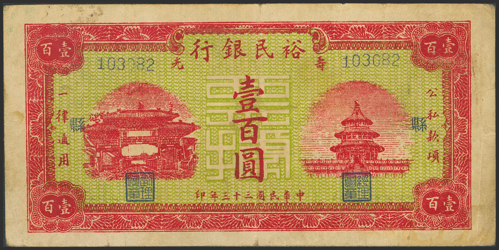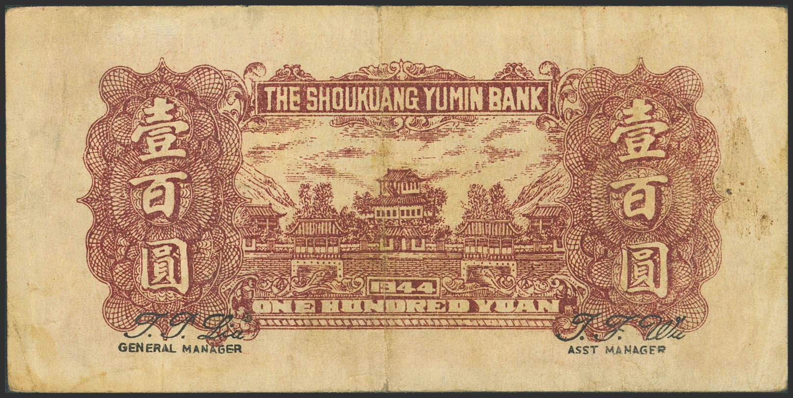 CHINA. 100 Yuan. 1944. Shoukuang Yu Min Bank. (Pick: Unlisted. S/M: Y36). More than Very Fine.