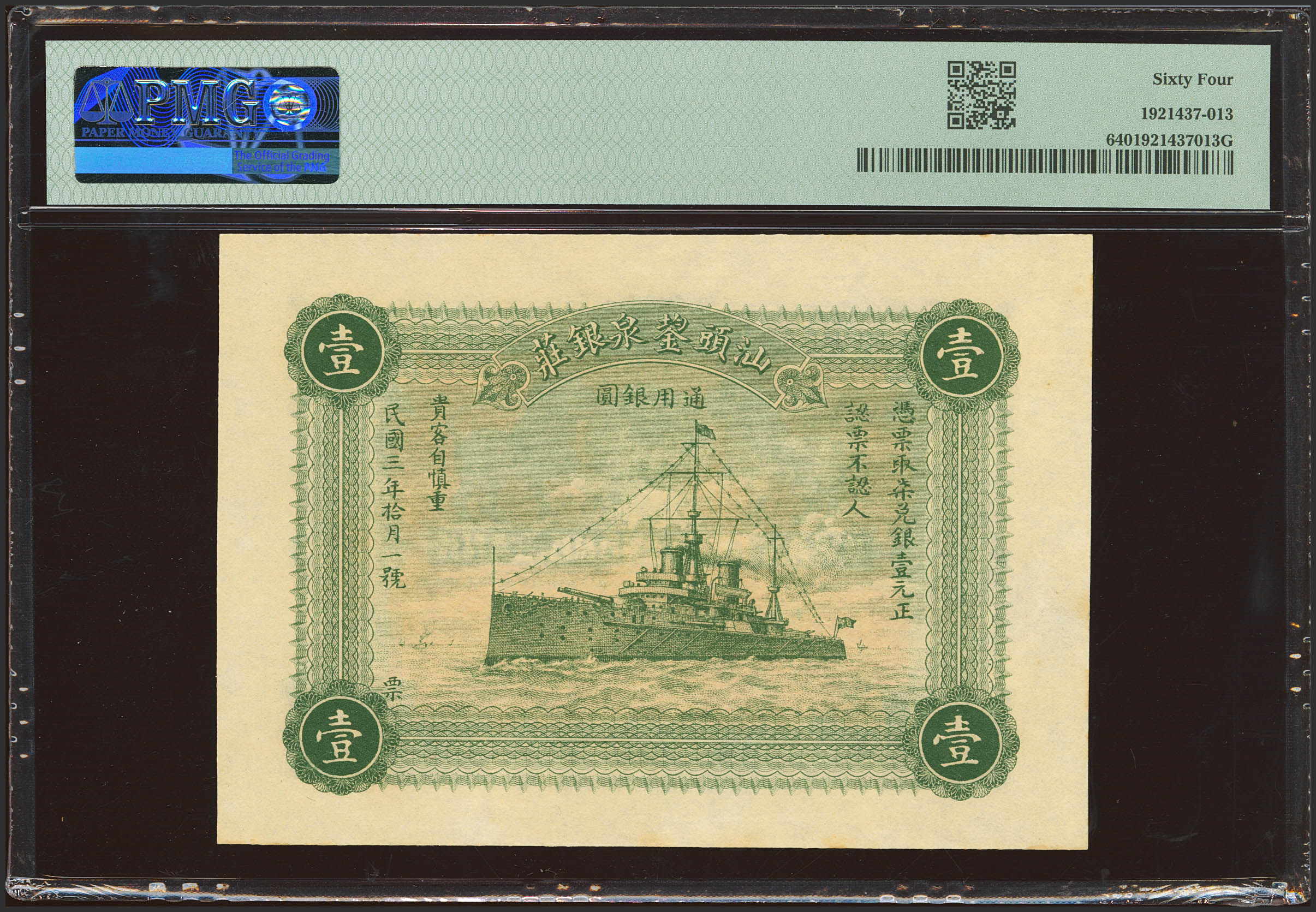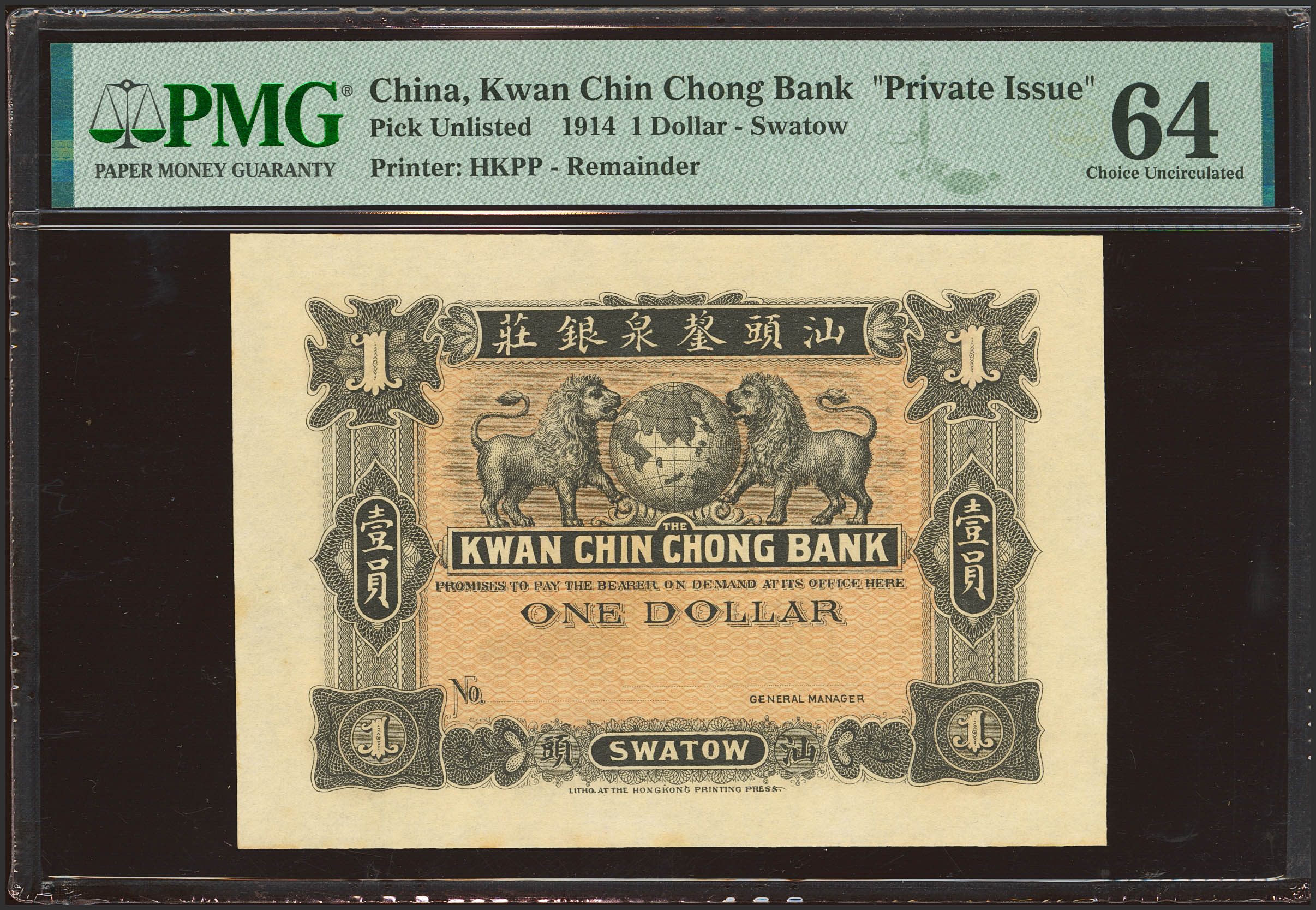 CHINA. 1 Dollar. 1914. Kwan Chin Chong Bank. Remainder. (Pick: Unlisted). PMG53 (printer's annotation and stamp, as made wrinkles, stains).