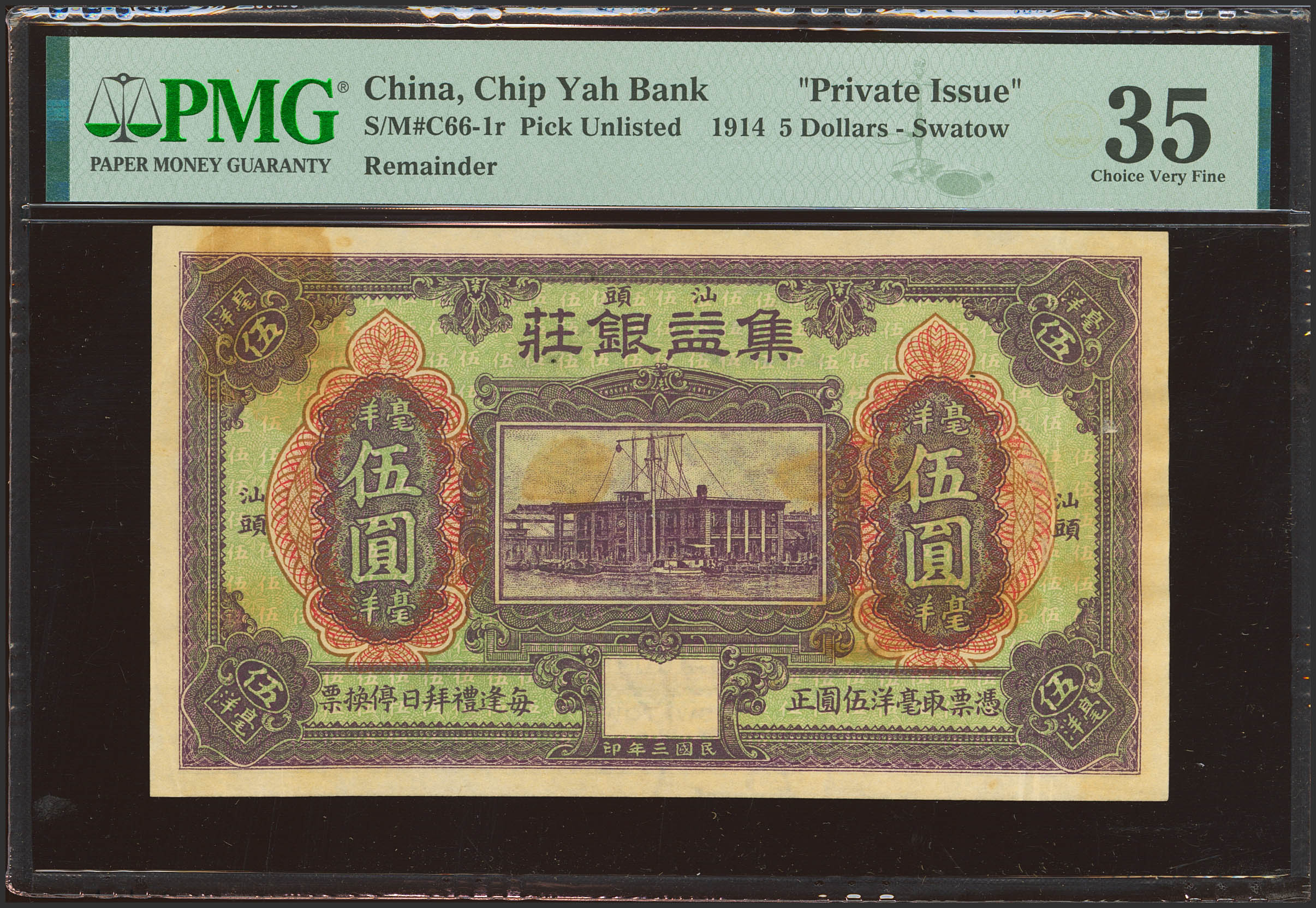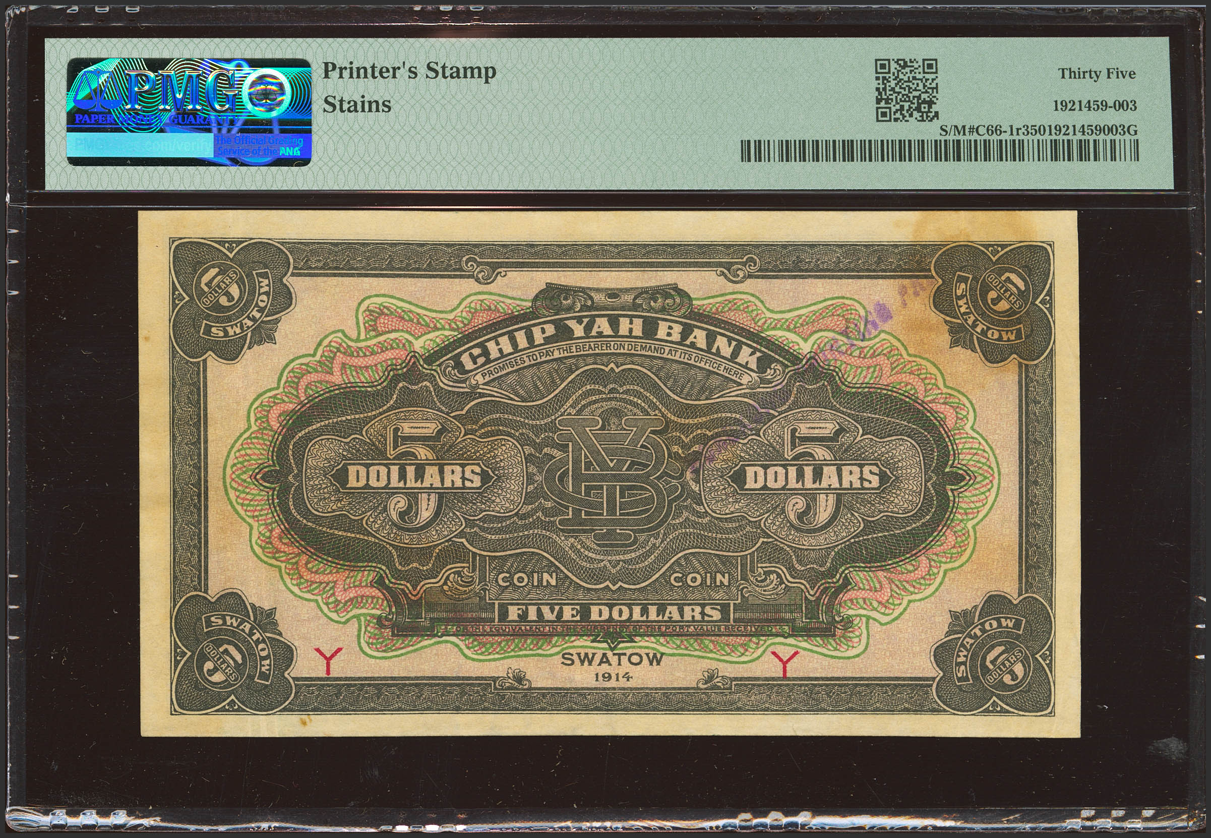 English CHINA. 5 Dollars. 1914. Chip Yah Bank. Swatow. Specimen. (Pick: Unlisted. S/M: C66-1r). PMG35 (printer's stamp, stains).