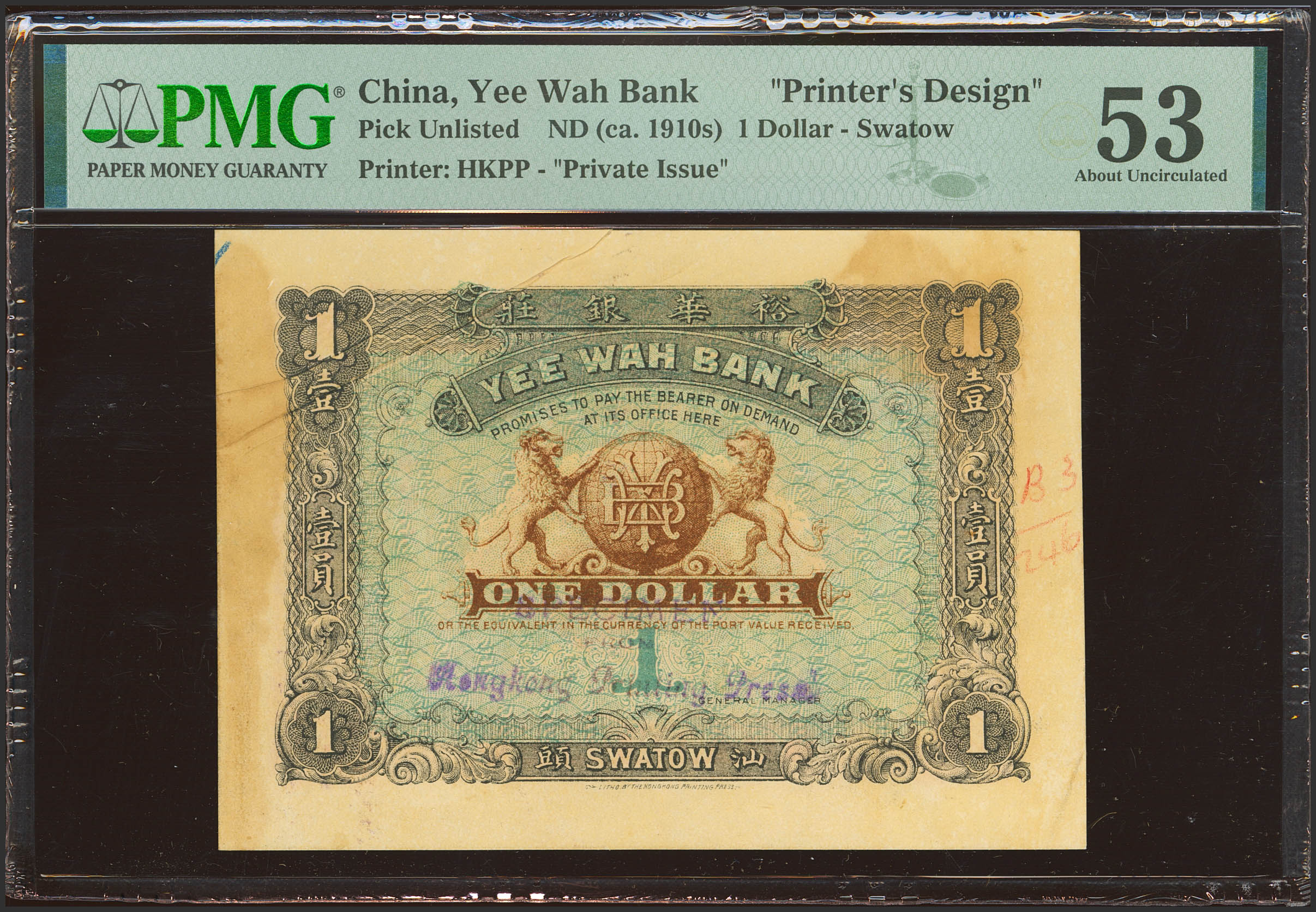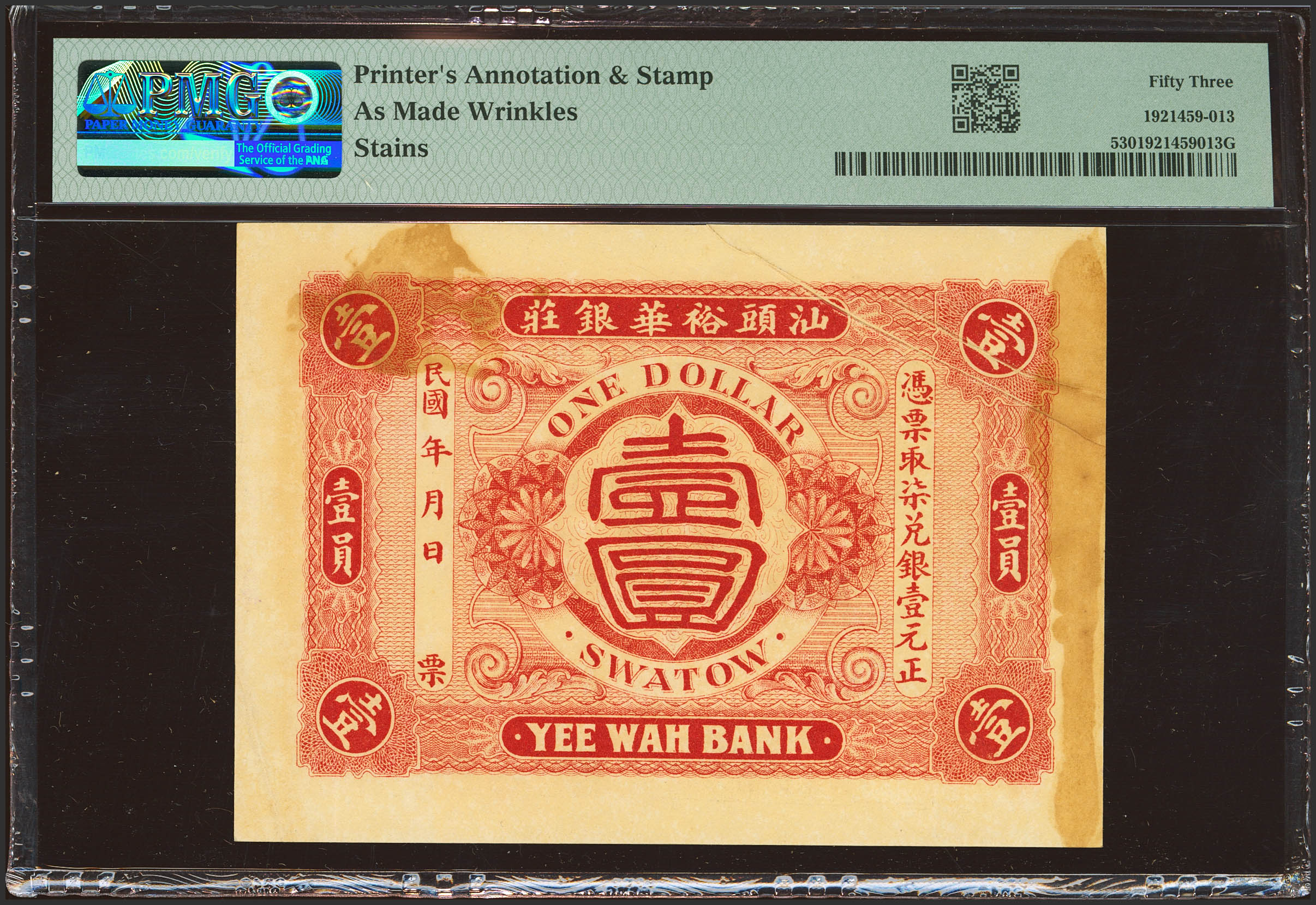 CHINA. 1 Dollar. 1914. Yee Wah Bank. Swatow. Specimen. (Pick: Unlisted). Previously mounted and graffiti. Almost Uncirculated.