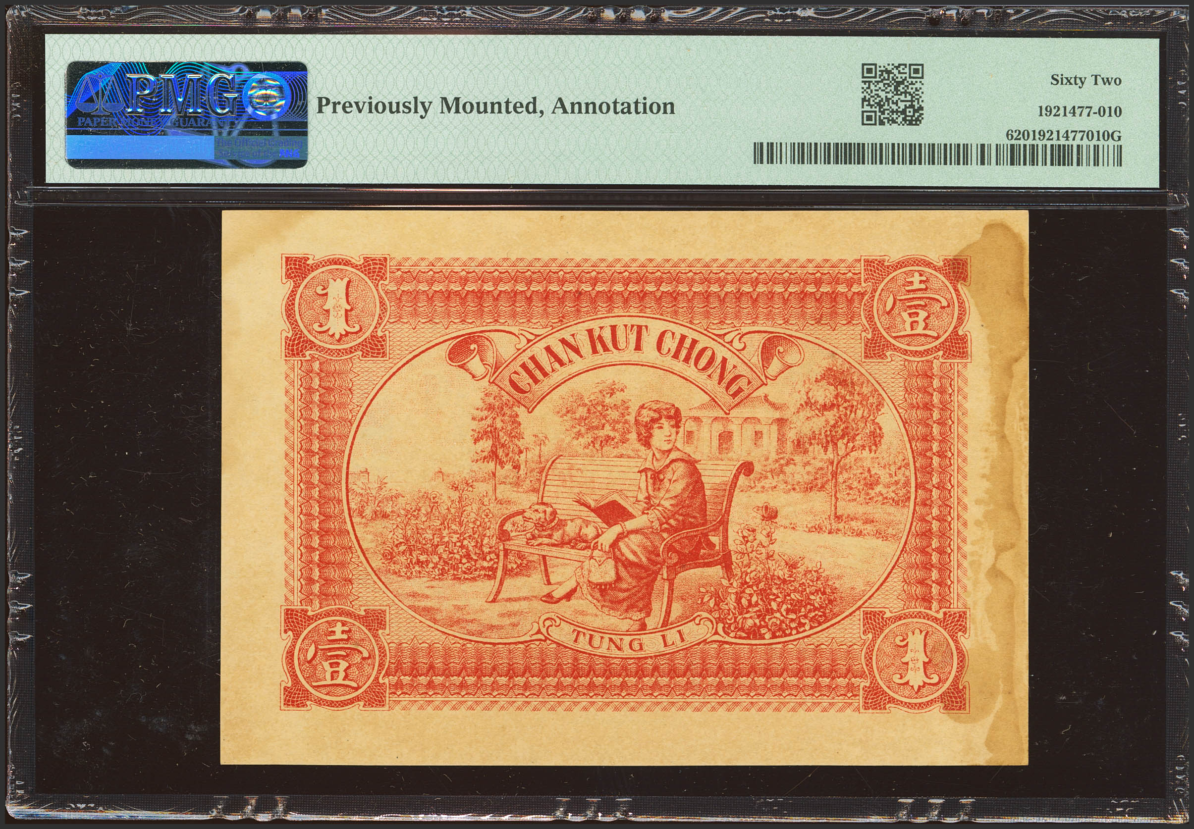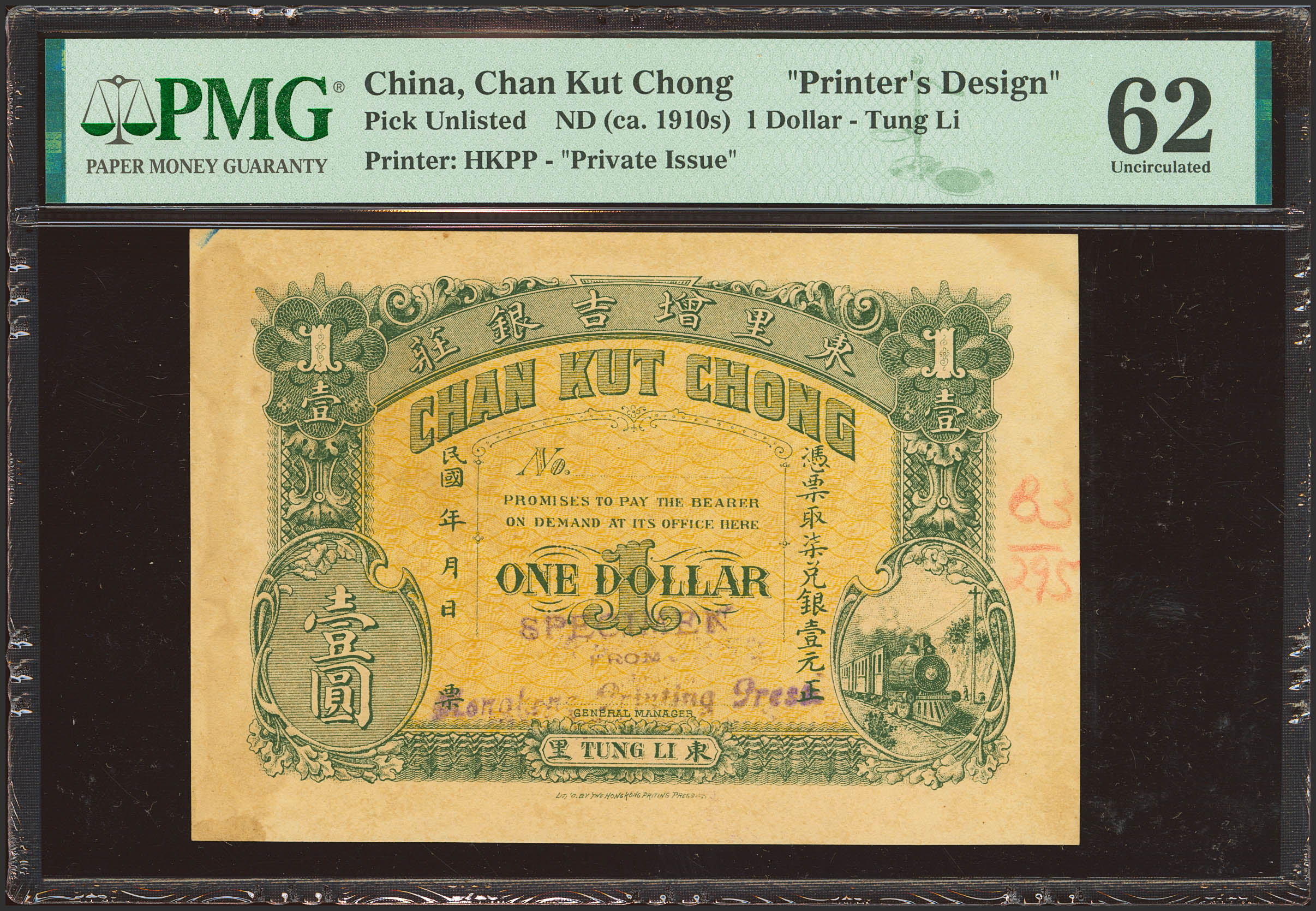CHINA. 1 Dollar. (1910ca). Chan Kut Chong. Tung Li, Specimen. (Pick: Unlisted). PMG62 (previously mounted, annotation).